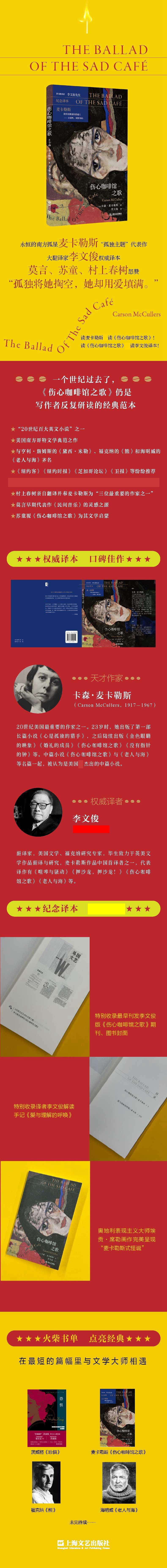为了纪念李文俊先生,表达我们的怀念之情,我们策划编辑了麦克勒斯的经典中篇小说作品《伤心咖啡馆之歌》一书,其中包含三部分内容,一是李文俊先生的译文,四万五千字。二是李文俊先生关于这部小说的翻译感想,三是李文俊先生的家属、儿媳马小起女士的怀念文章《独留明月照江南》,文章有两万多字,情深意切。这三部分内容综合起来是一本小书,既能让读者感受到李文俊先生的译笔,其文准确又瑰丽,也能让读者了解李文俊先生的一生简况。