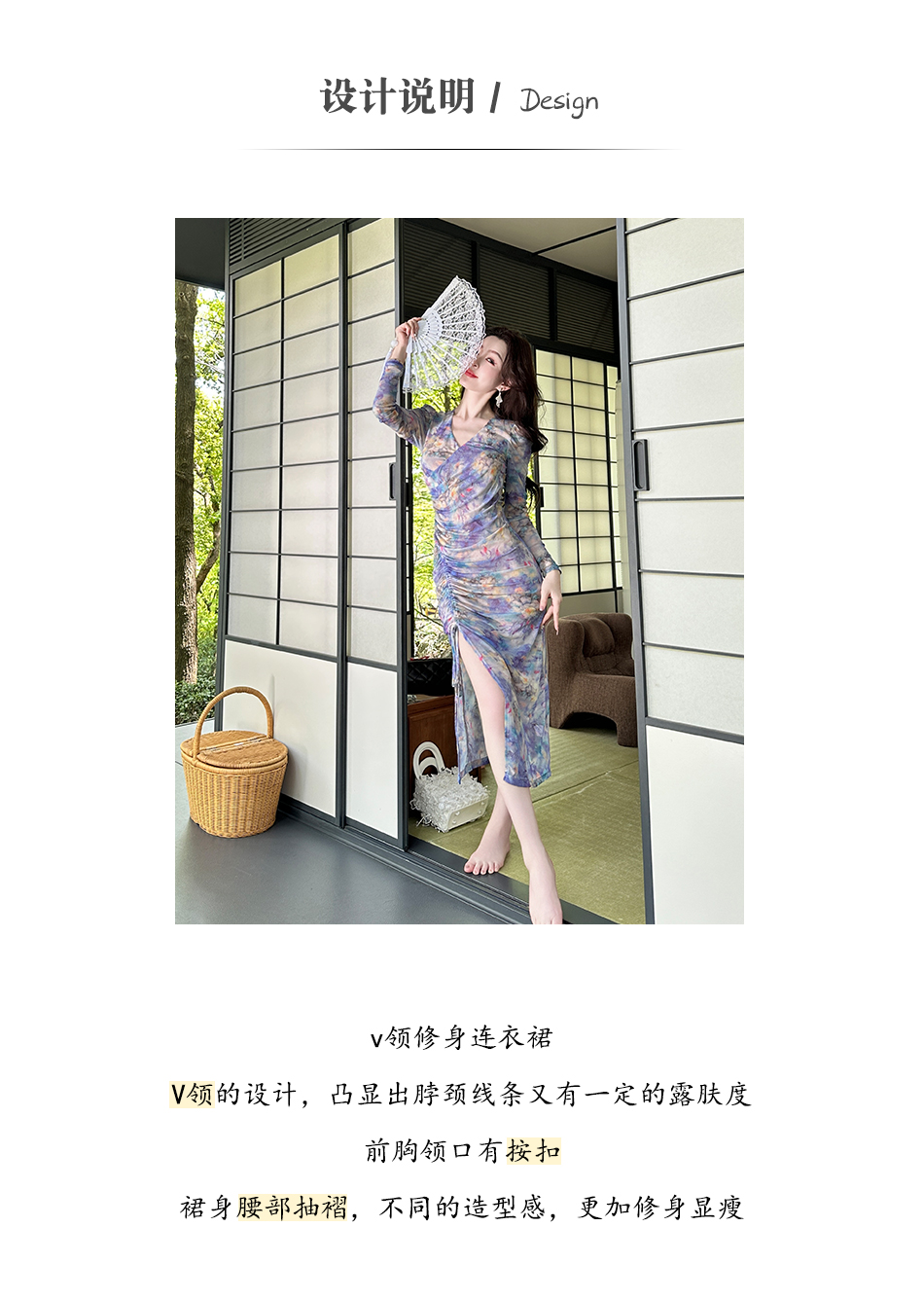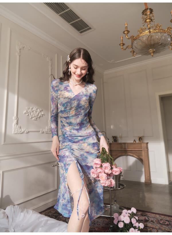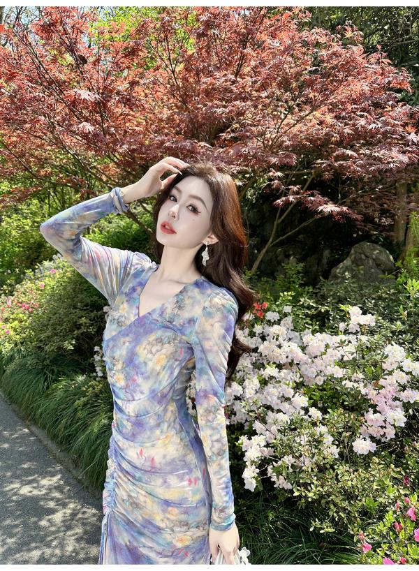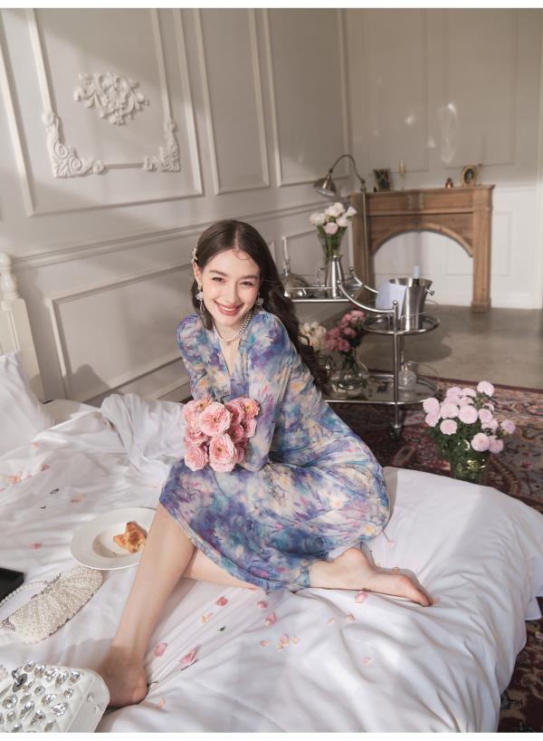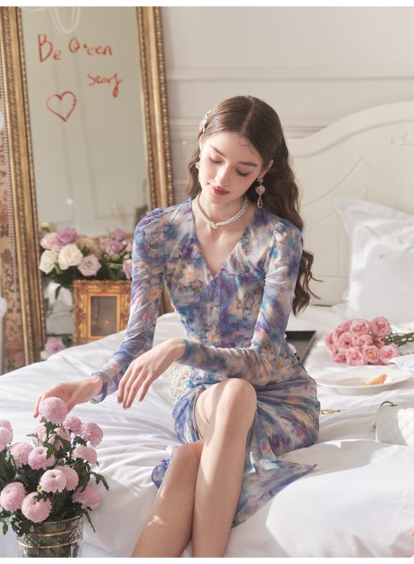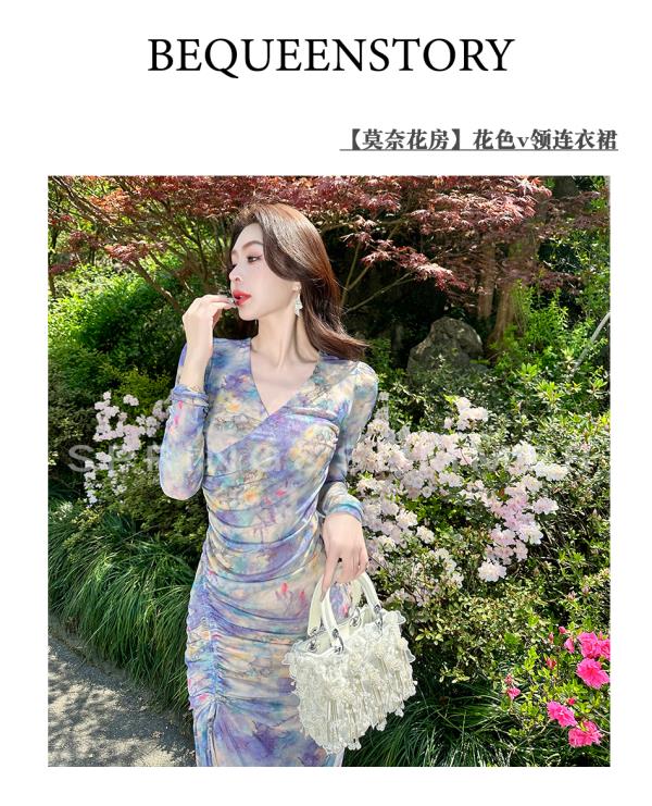 BeQueenStory【莫奈花房】高端上档次甜美花色v领连衣裙2023春季新款女