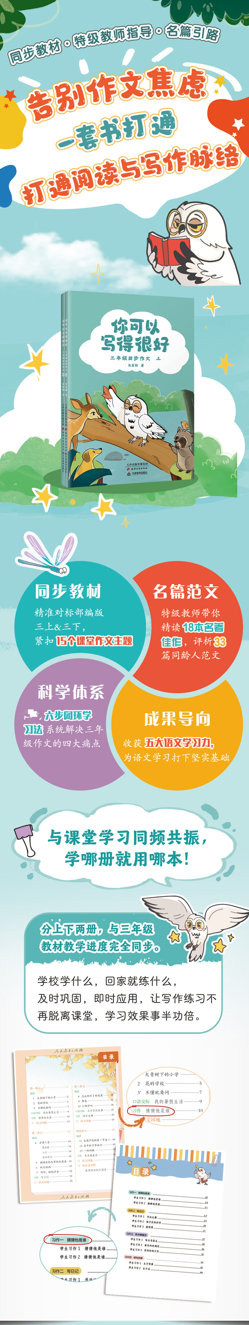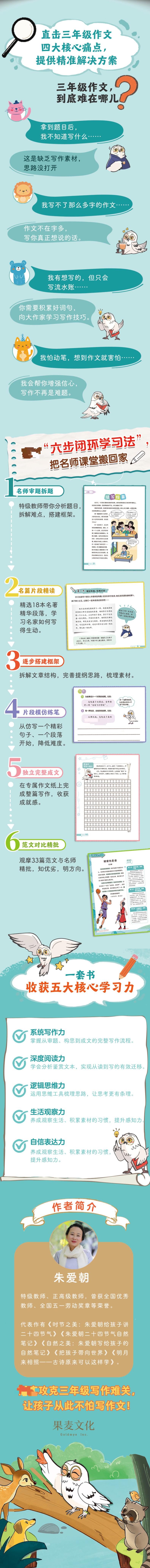 这是一套给小学三年级孩子读的写作辅导书。作者是全国优秀教师朱爱朝老师,同时也是一名作家、阅读推广人,她的代表作《时节之美:朱爱朝给孩子讲二十四节气》入选了亲近母语分级阅读书目。紧贴教材,主题对应部编版语文书三年级习作要求,循序渐进地激发孩子从思考到观察,从表达到落笔的能力。启发教育,鼓励孩子将内心充盈的情感表达出来,切实解决孩子不知道“写什么”“怎么写”的困惑,让孩子知道“怎么思考”“怎么感受”“怎么表达”。依托名著,观察名家是如何写作的,搭建阅读到写作之间的桥梁,从输入到输出,激发表达欲望,增强孩子信心。