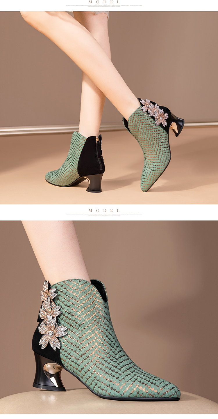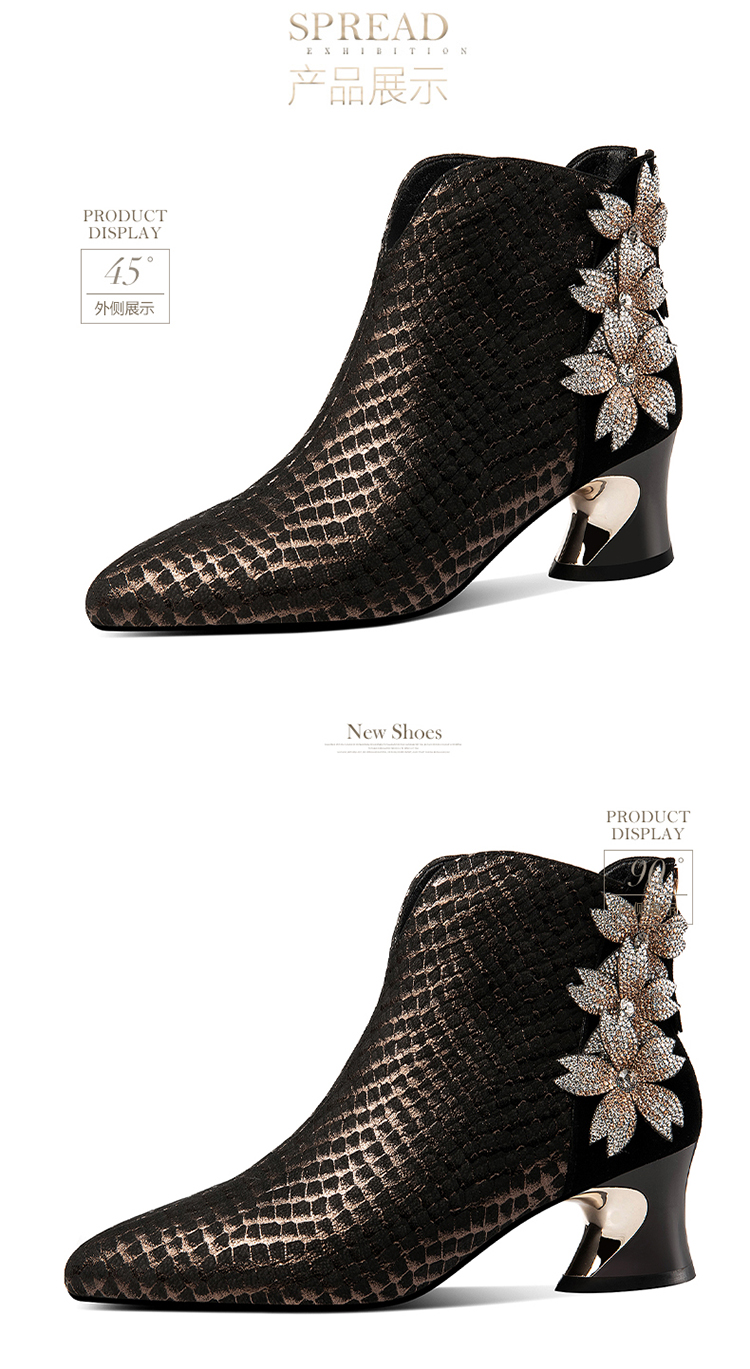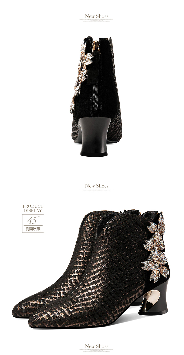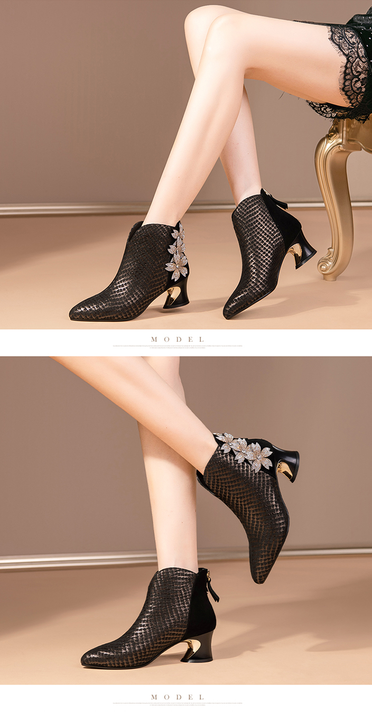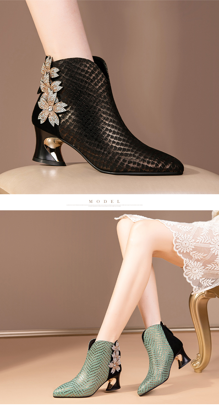 优雅百搭,真皮拼接花朵镶钻高跟短靴JZJ-B234-665