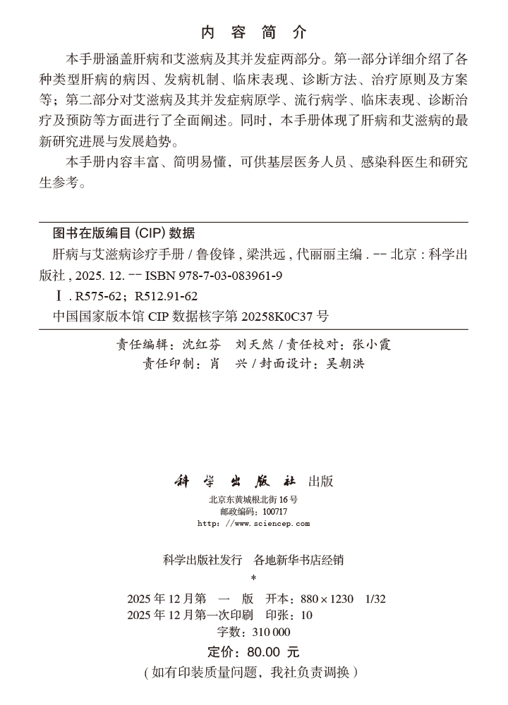 肝病与艾滋病诊疗手册 鲁俊锋 梁洪远 代丽丽 主编 基层医院一线感染科医生,相关专业研究生、进修医生 9787030839619科学出版社
