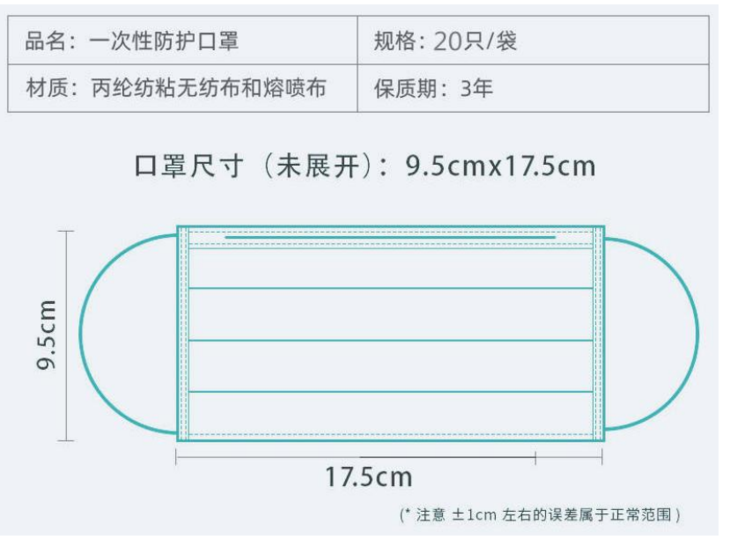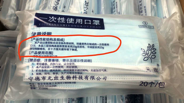 1、正规包装明确标注性能结构和组成,市面上很多口罩是不敢标产品的用料,包装简陋,基本没有标注成分克重,熔喷布比重级别(比如元出是BFE99 95%过滤级别),合格的口罩每个细节都很讲究的。