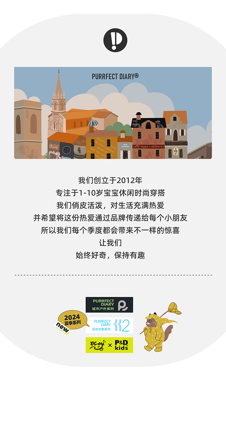 - Purrfect-Diary专注于贴近自然随性的穿着概念,轻奢平价的童装文化传播,在产品设计上更加注重婴童穿着的舒适性、安全性、更出众的国际化品牌,将欧美的育婴文化在中国进行深入的传播与推广。