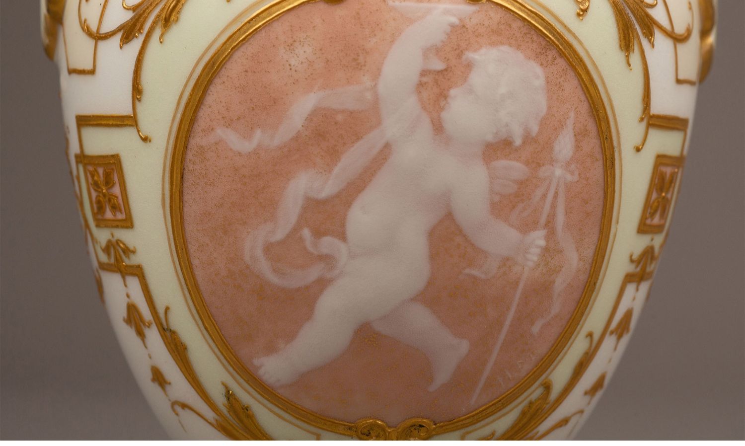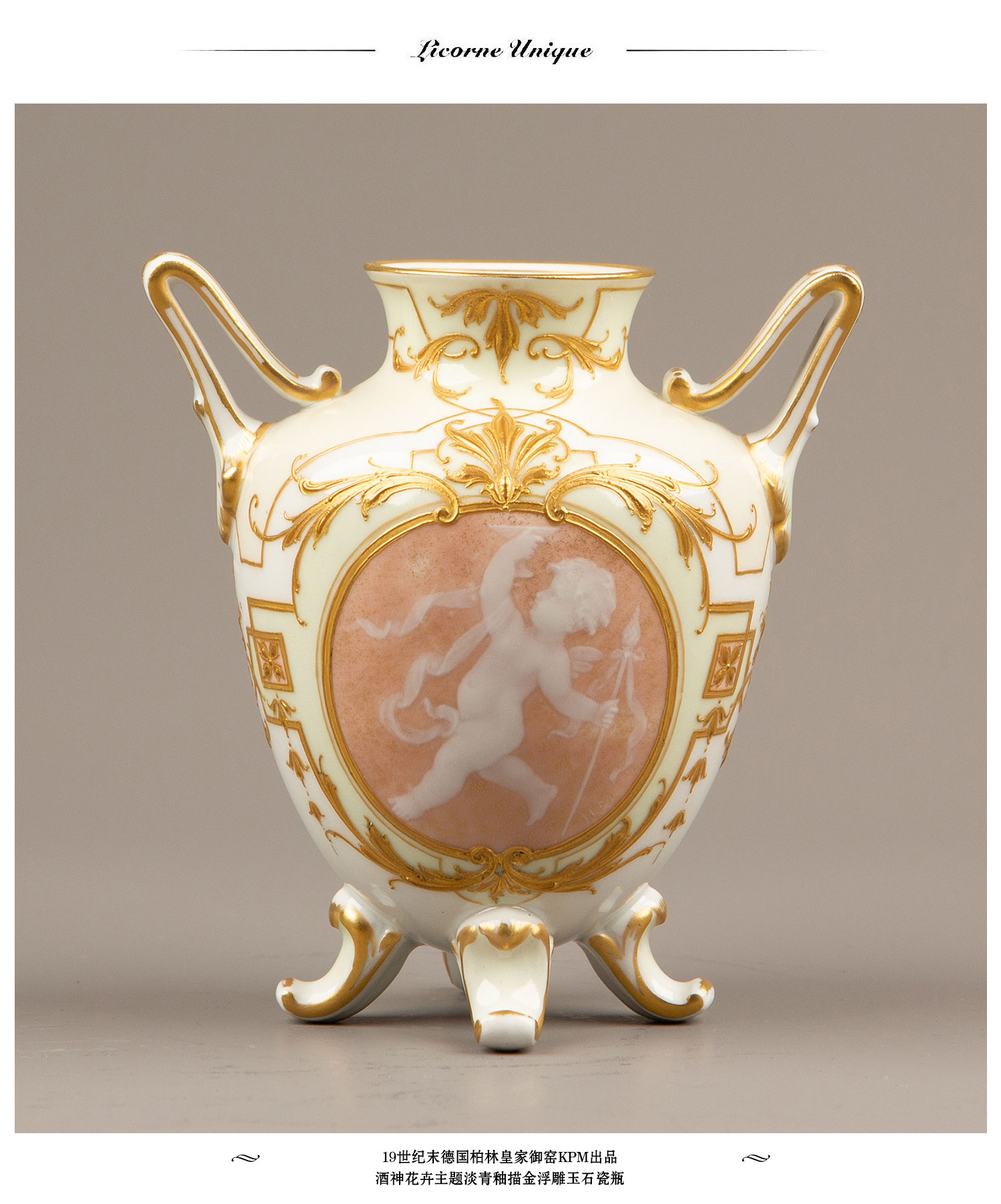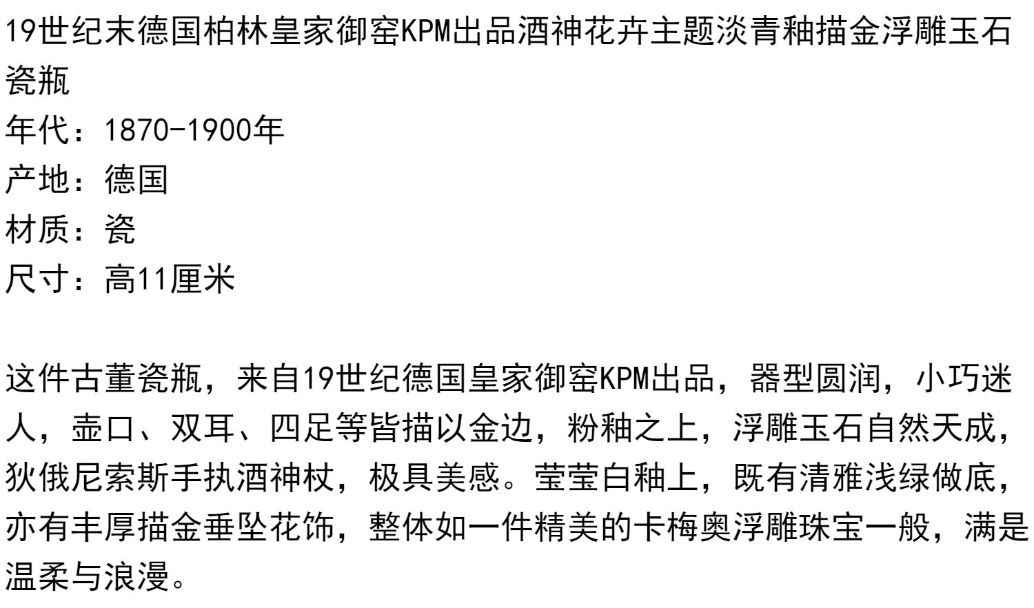 独角鹿西洋古董瓷器德国御窑KPM酒神花卉淡青釉描金浮雕玉石瓷瓶
