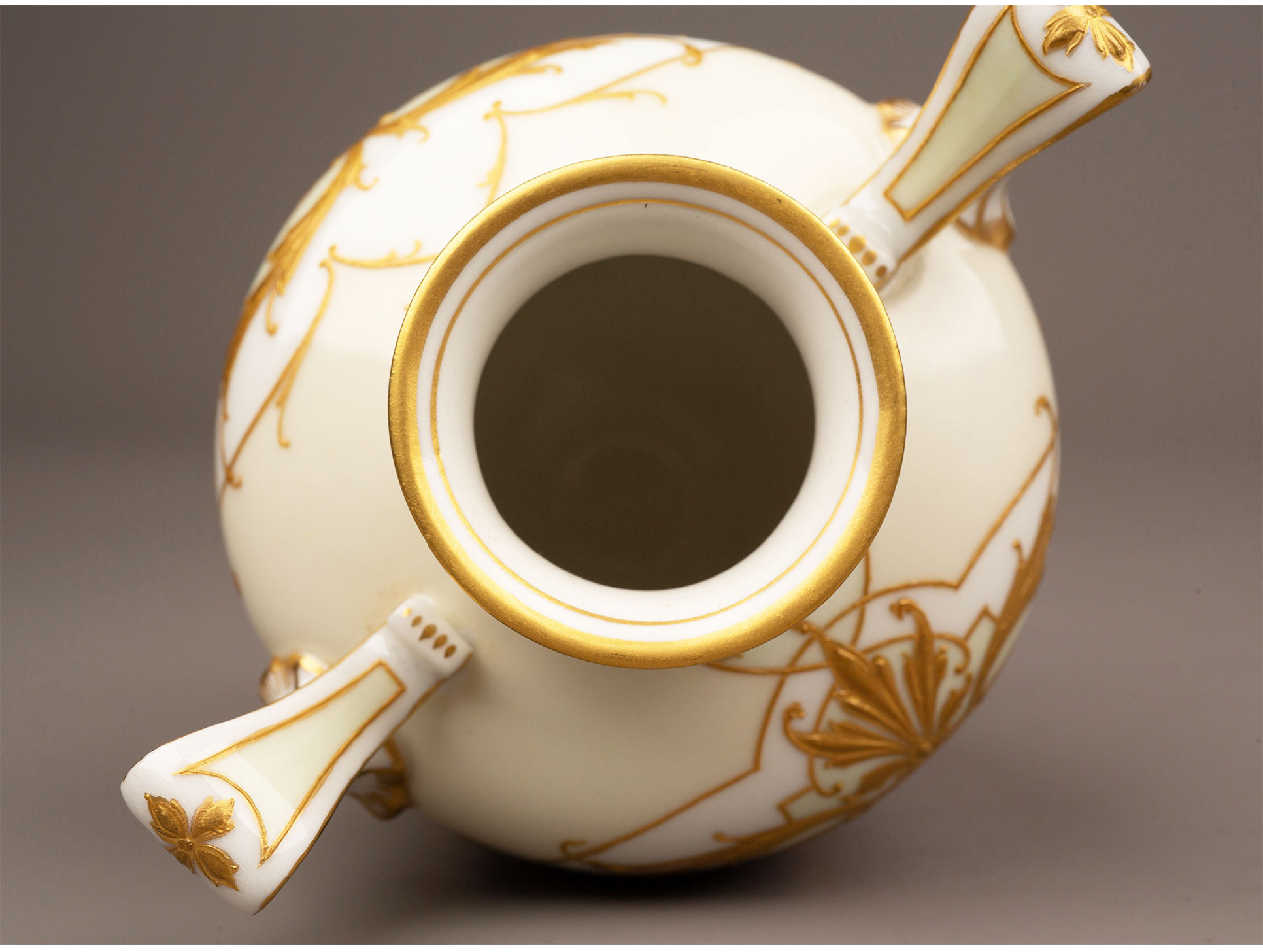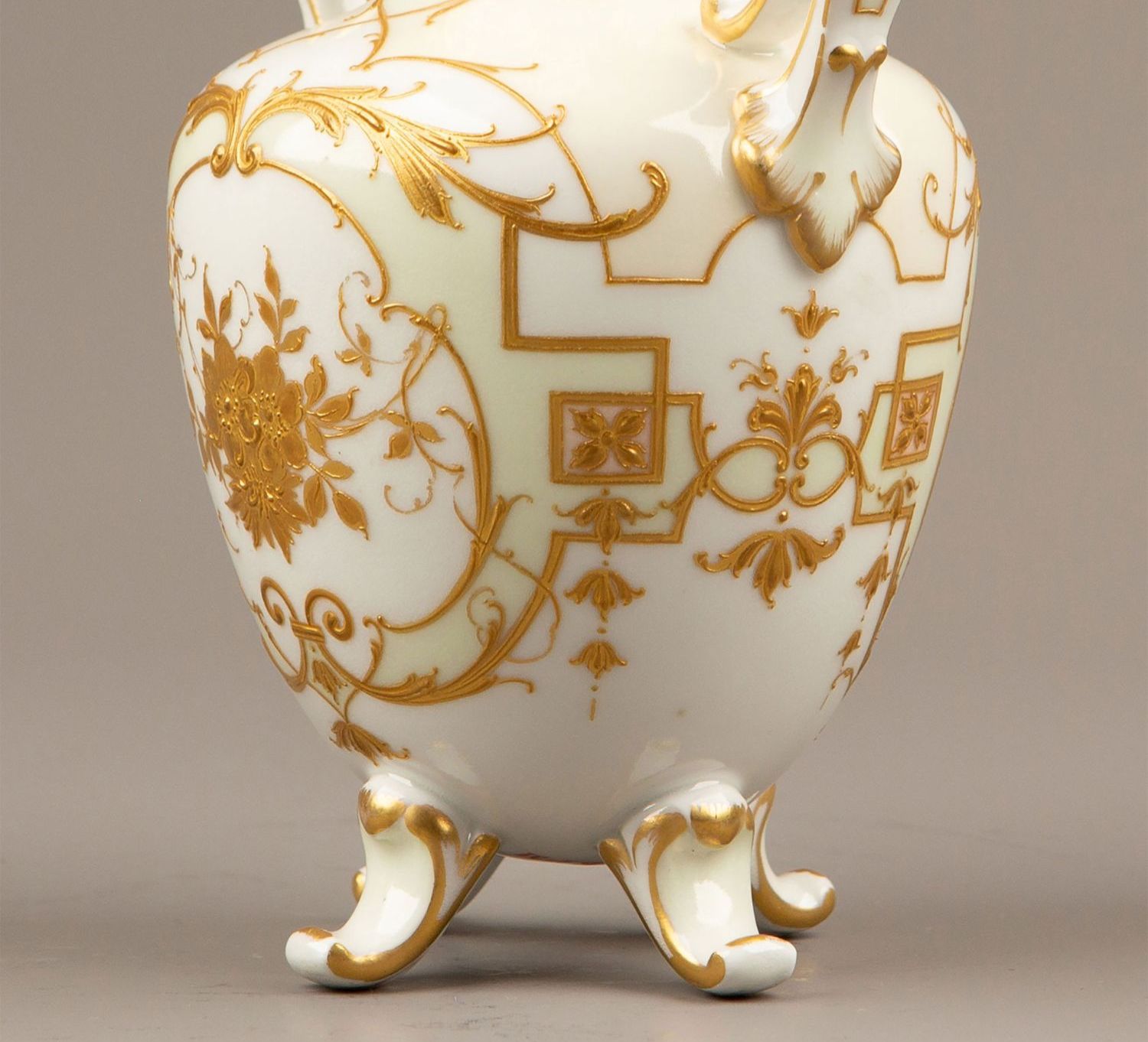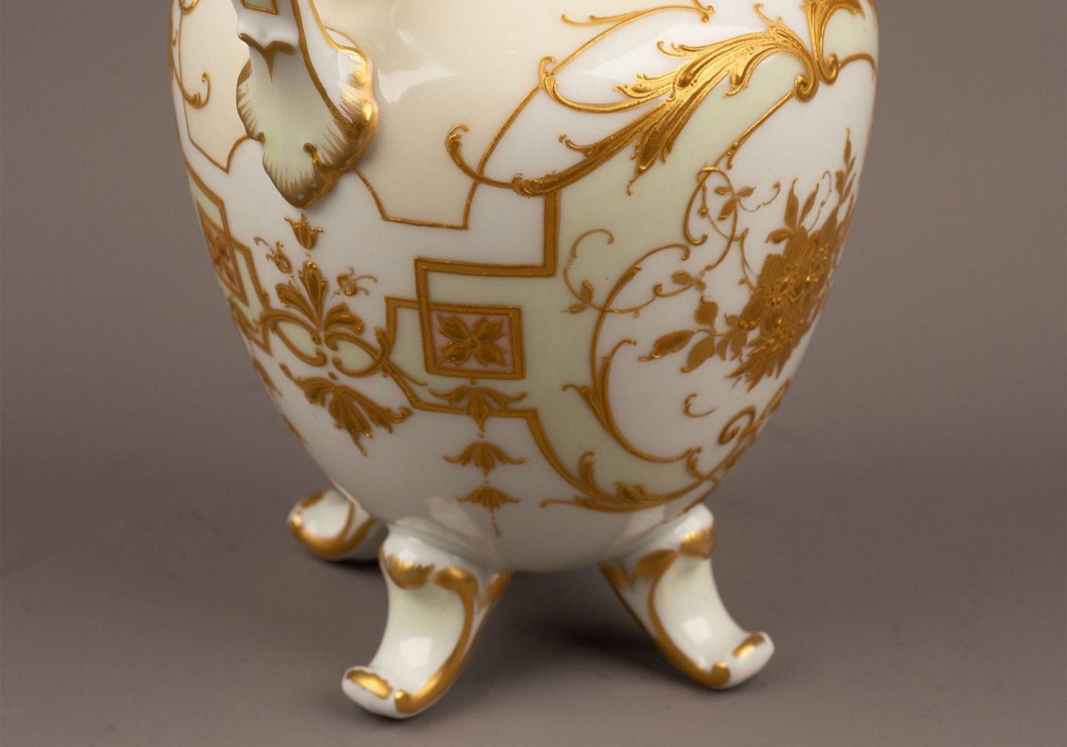 独角鹿西洋古董瓷器德国御窑KPM酒神花卉淡青釉描金浮雕玉石瓷瓶