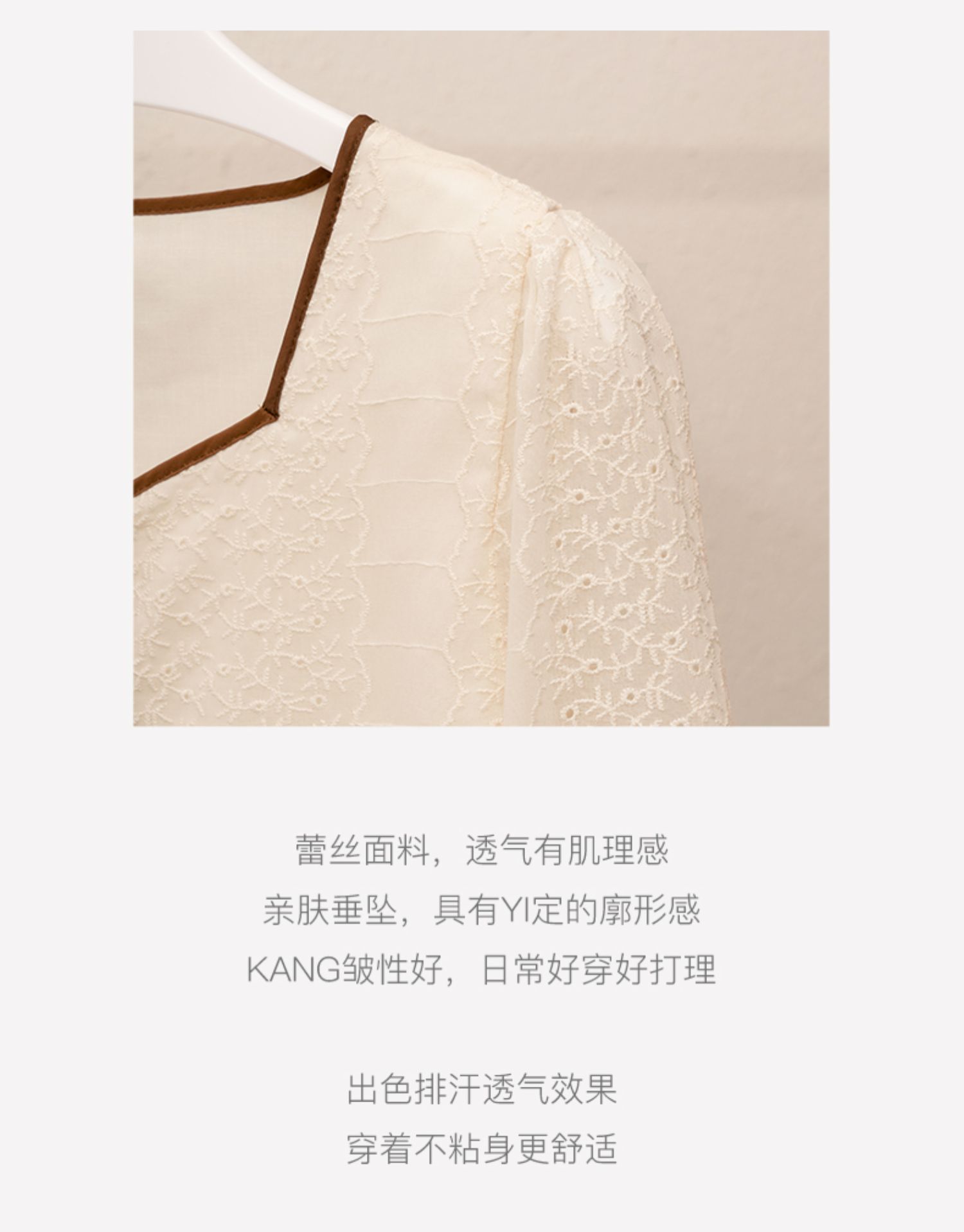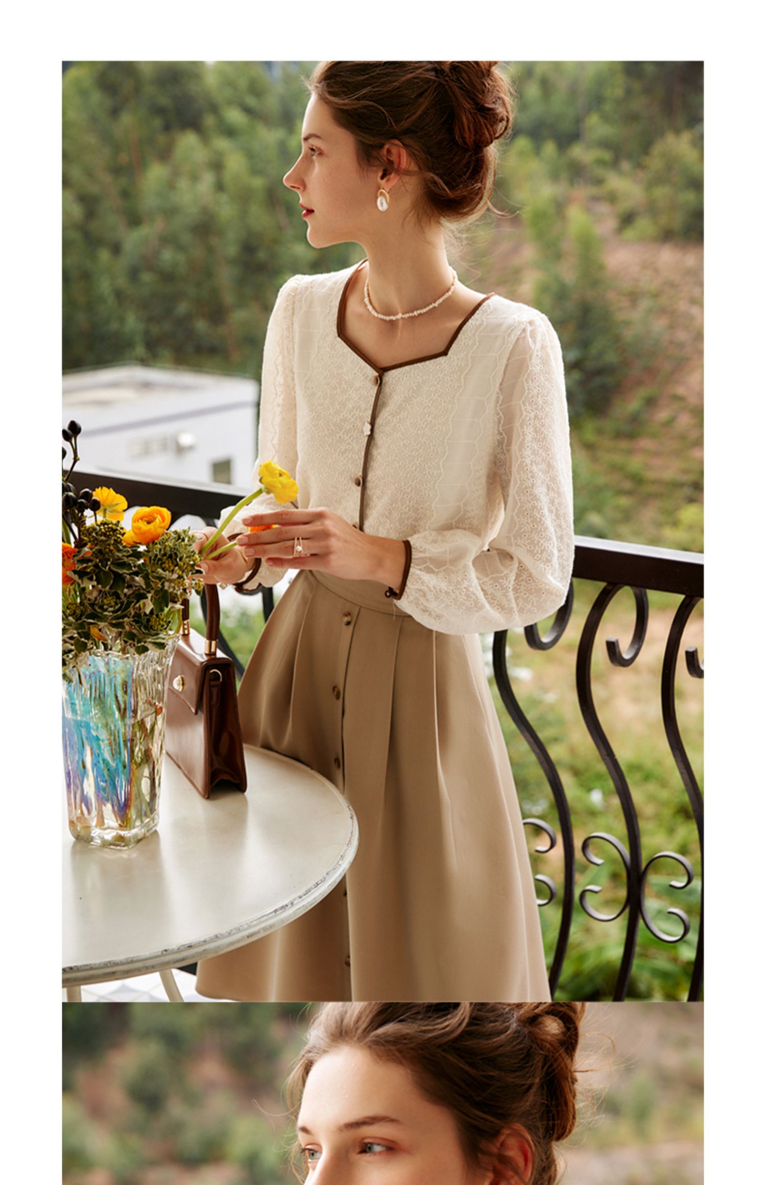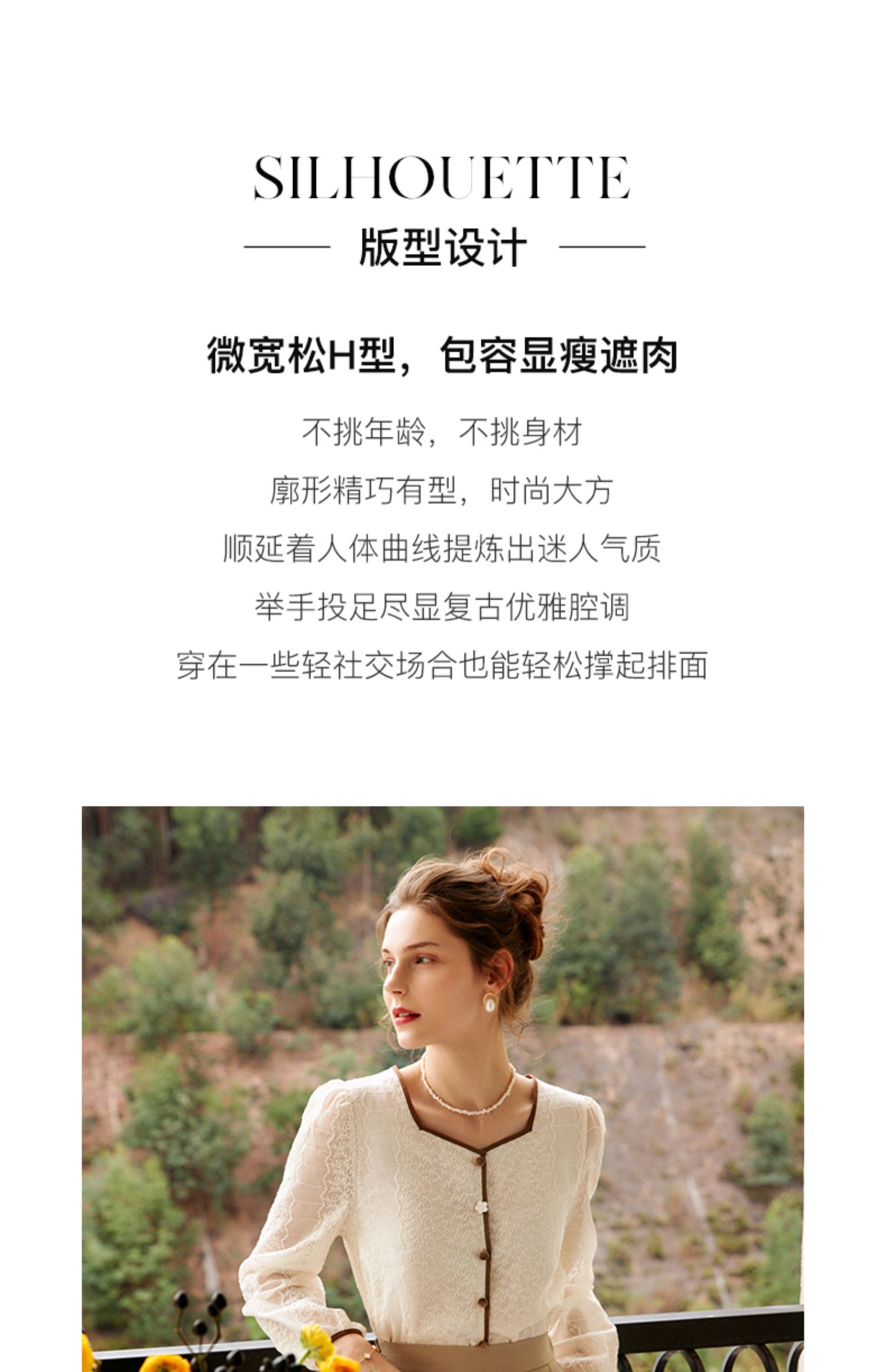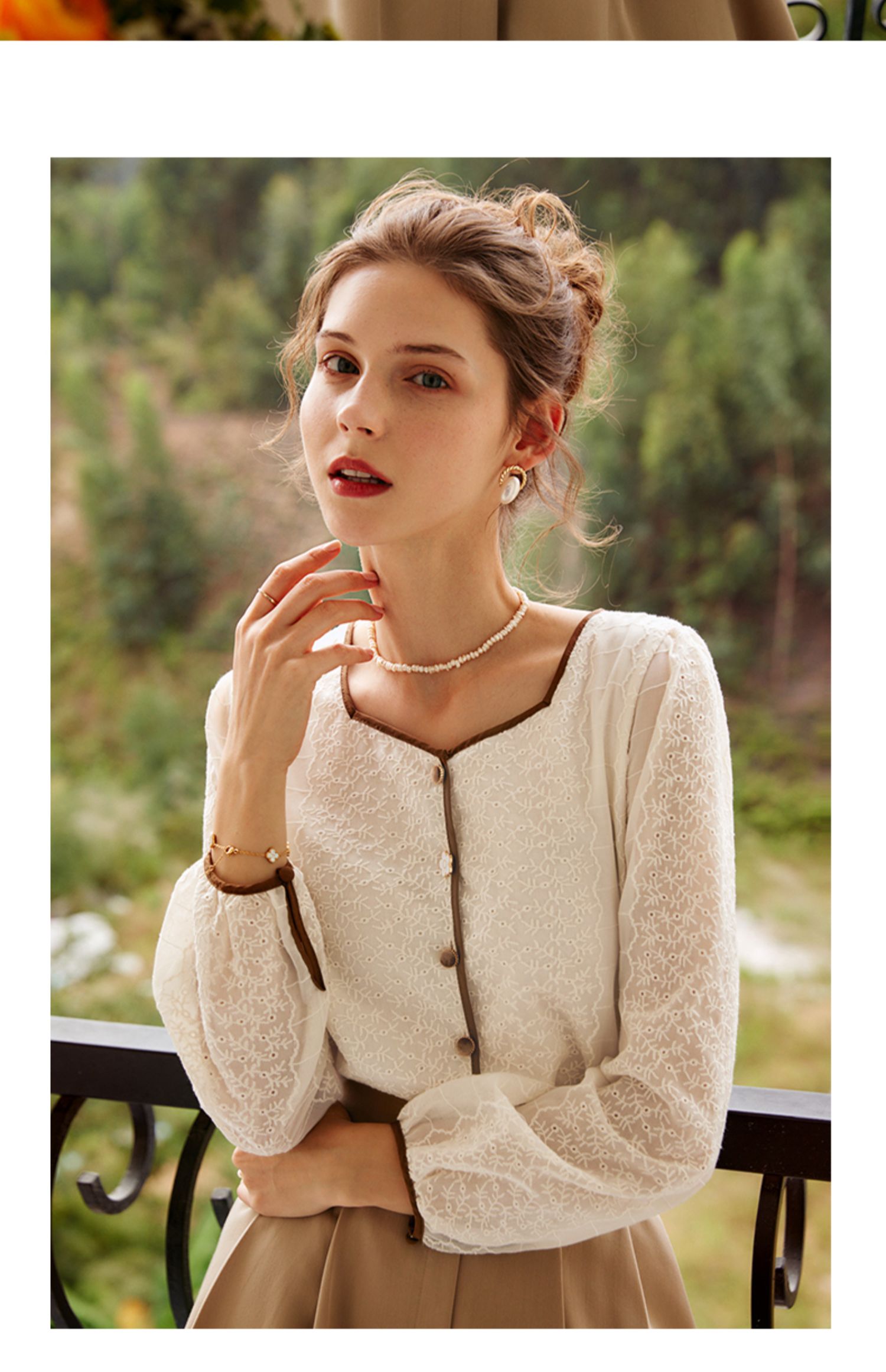 OLrain法式方领雪纺衫女秋季高级感气质蕾丝衫泡泡袖显瘦减龄上衣