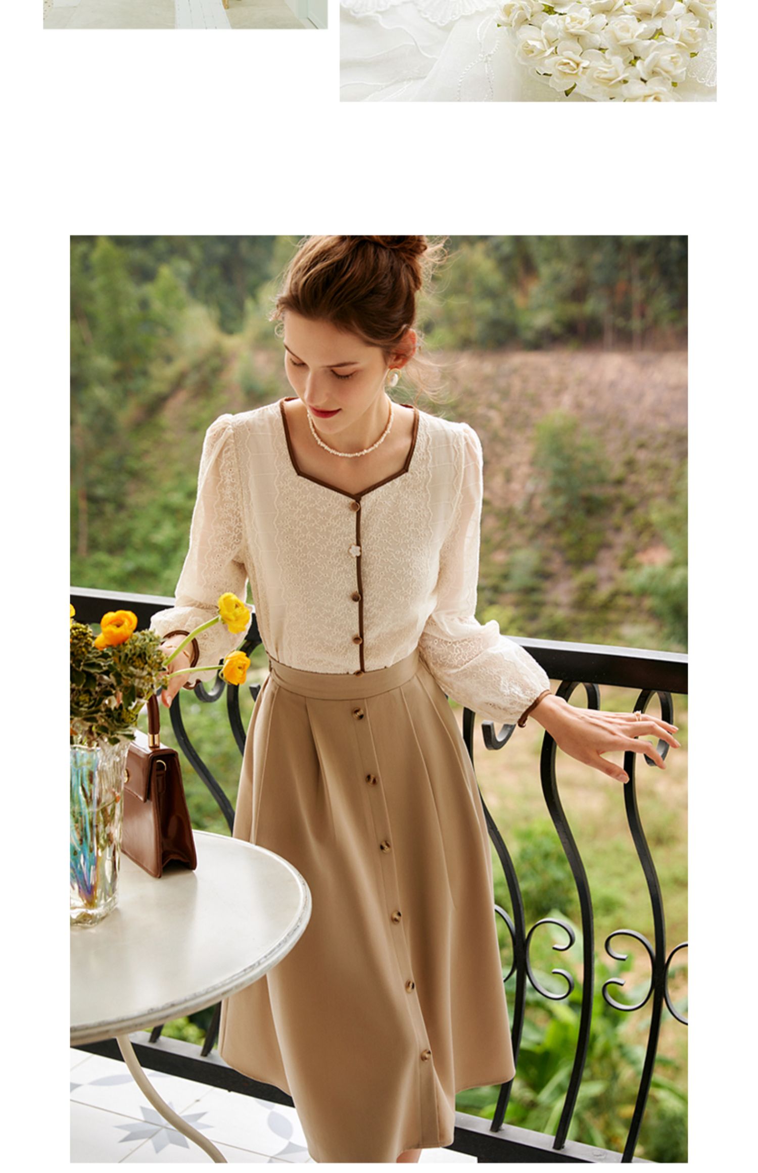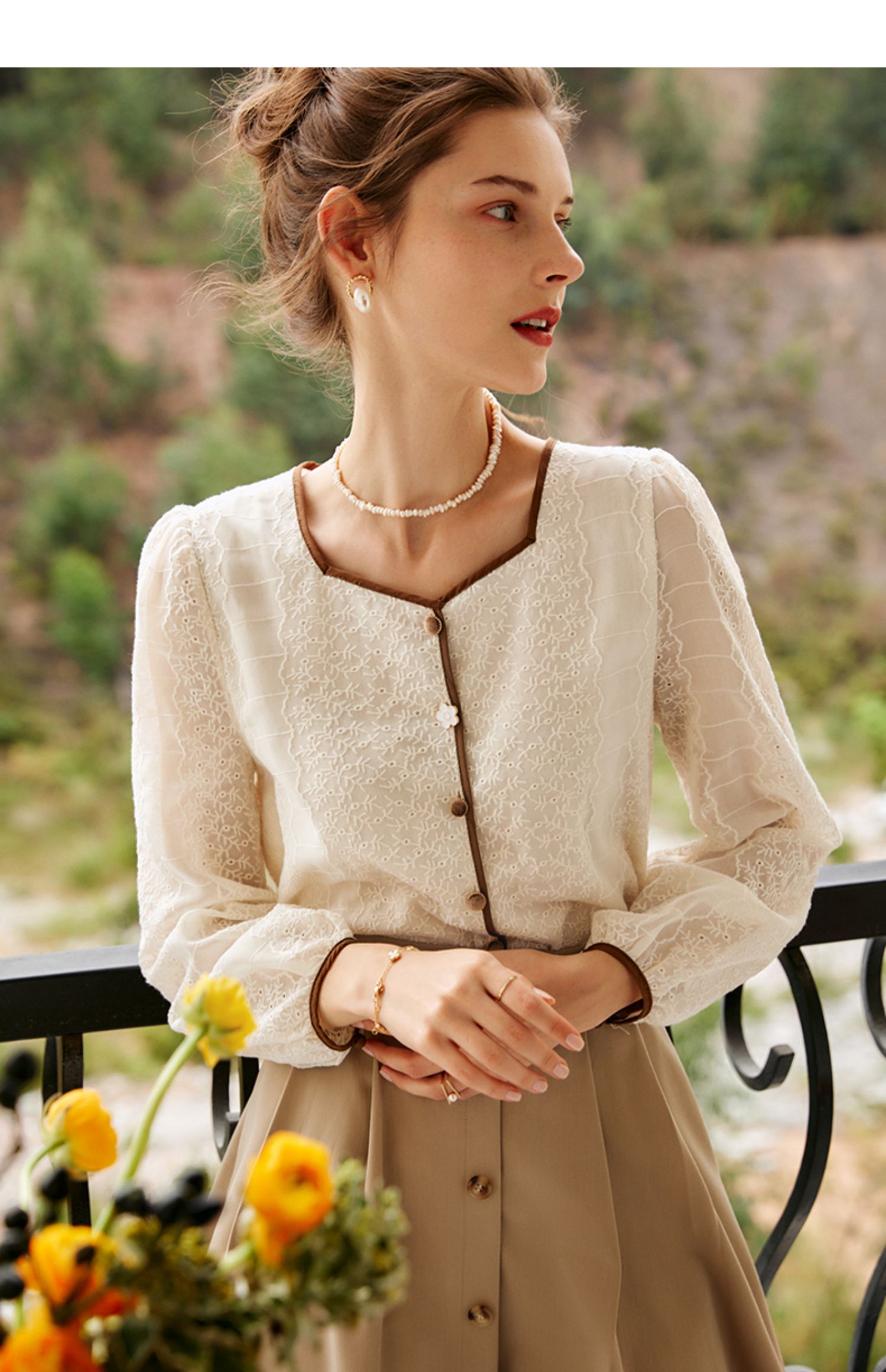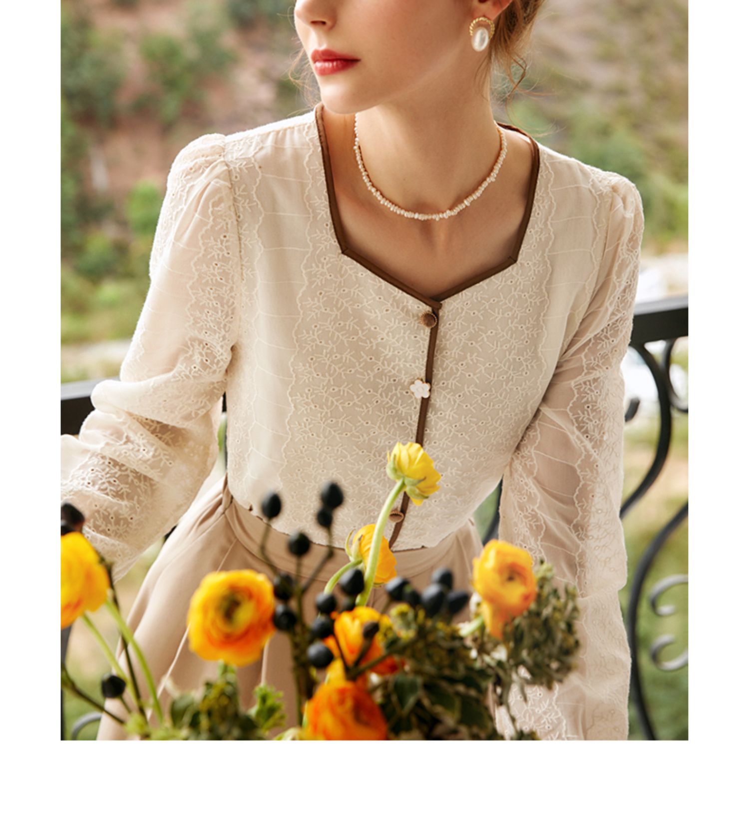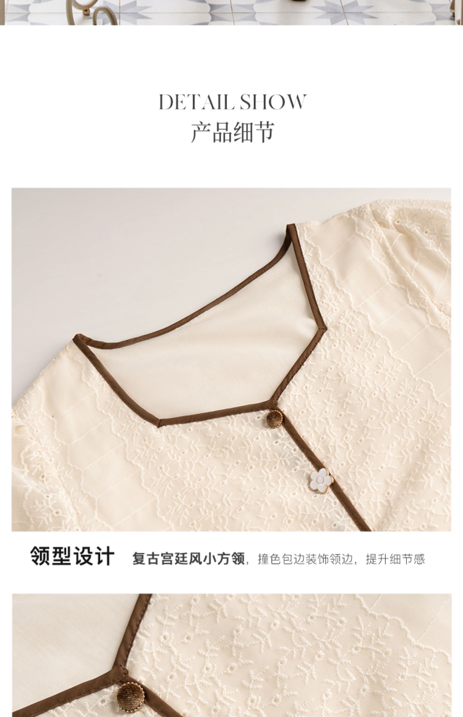 OLrain法式方领雪纺衫女秋季高级感气质蕾丝衫泡泡袖显瘦减龄上衣