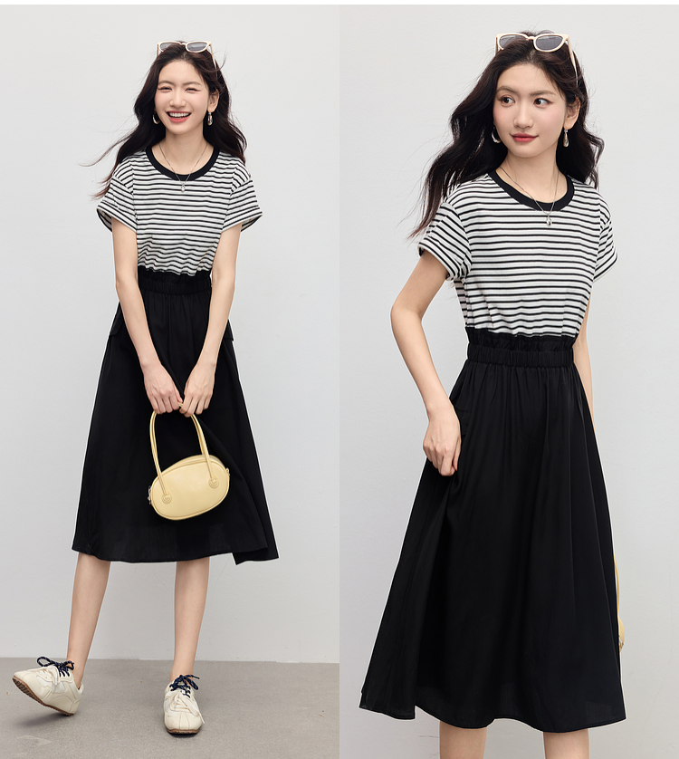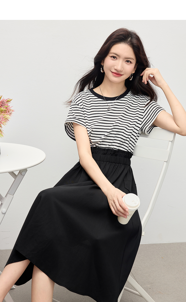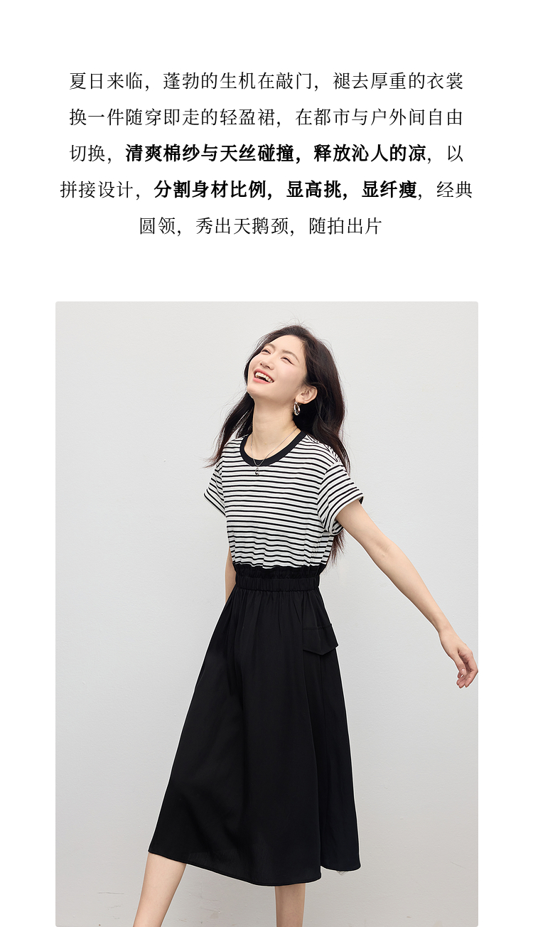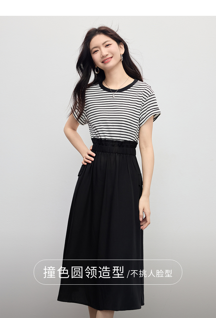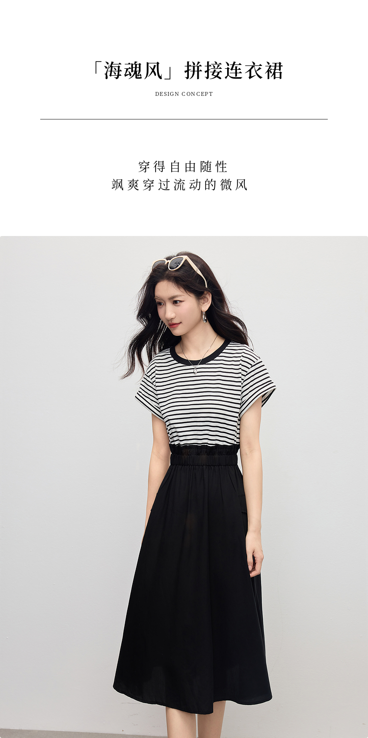 【专属特价】熙世界休闲条纹短袖拼接连衣裙假两件收腰显瘦裙子女夏季2025新款