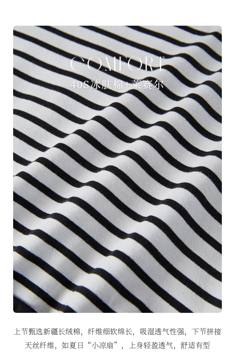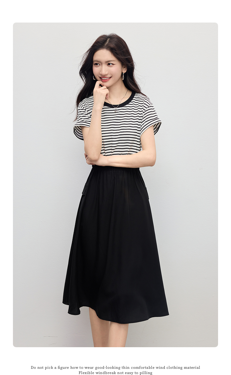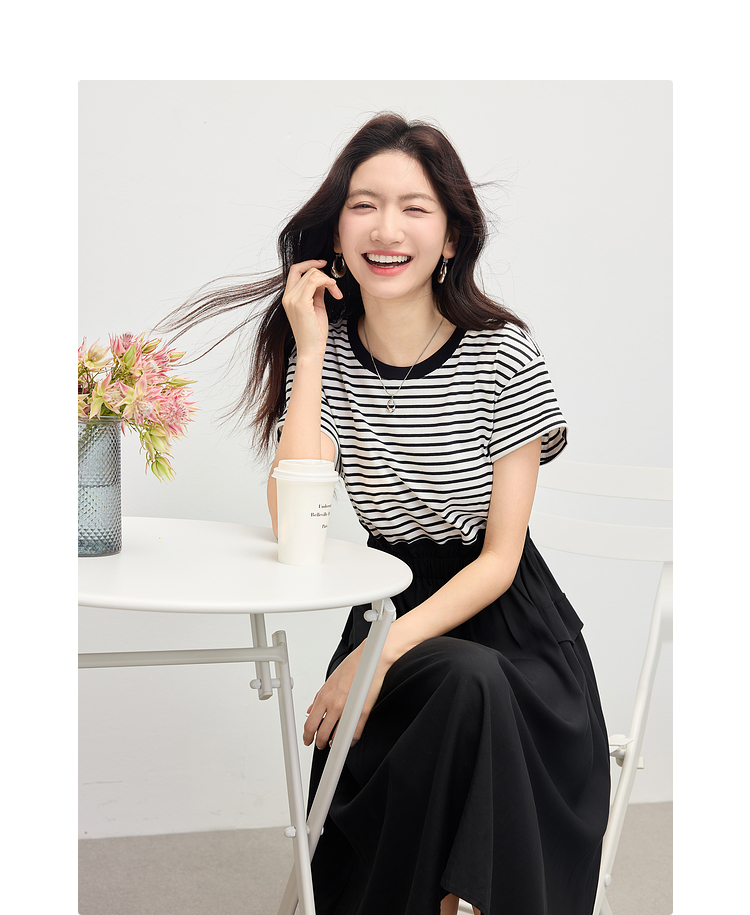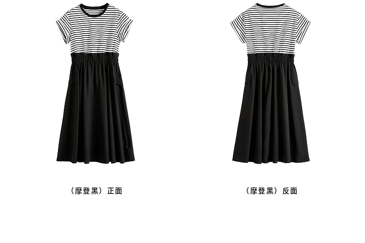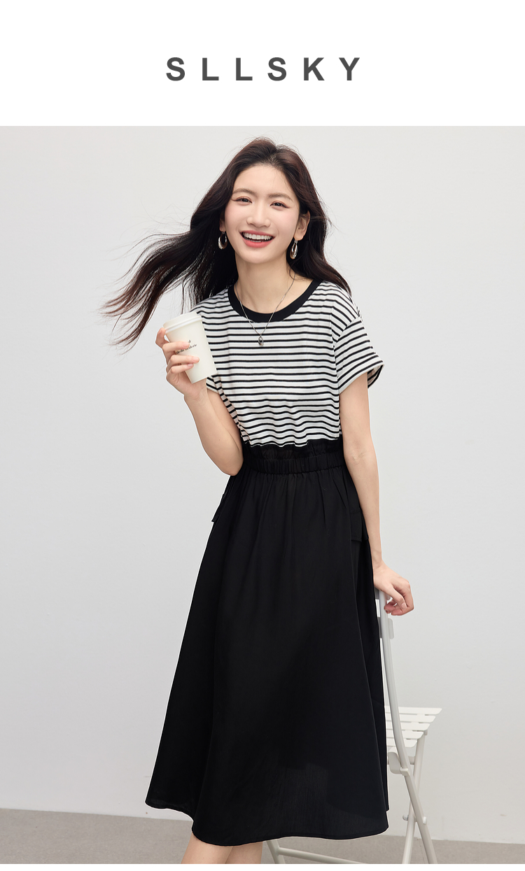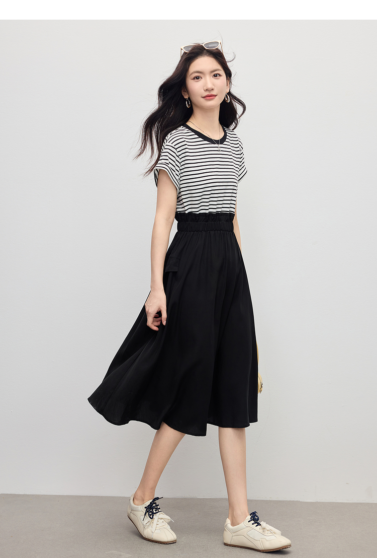 【专属特价】熙世界休闲条纹短袖拼接连衣裙假两件收腰显瘦裙子女夏季2025新款