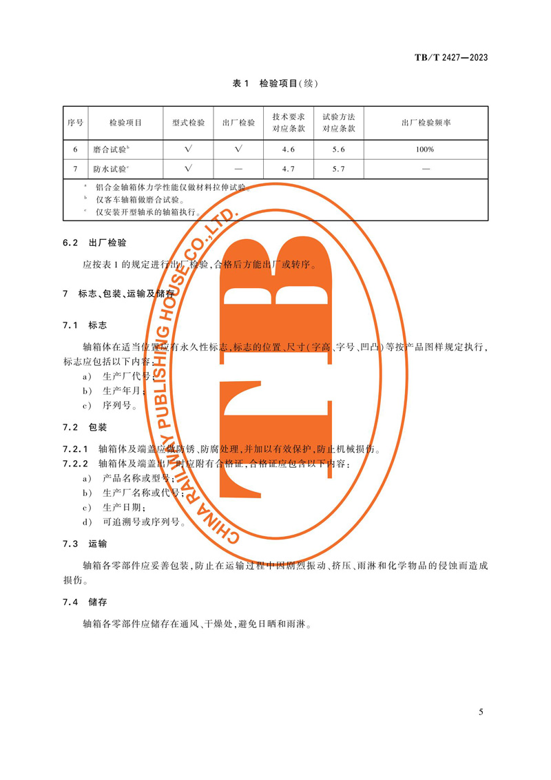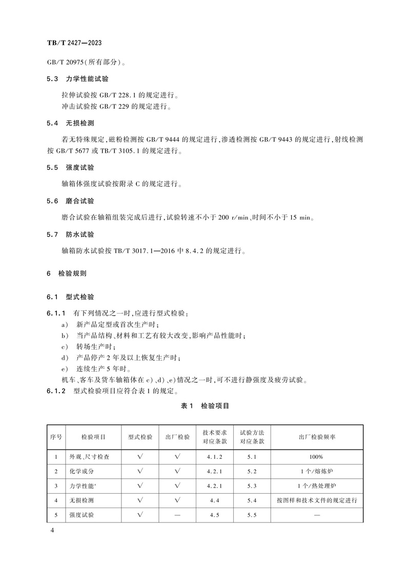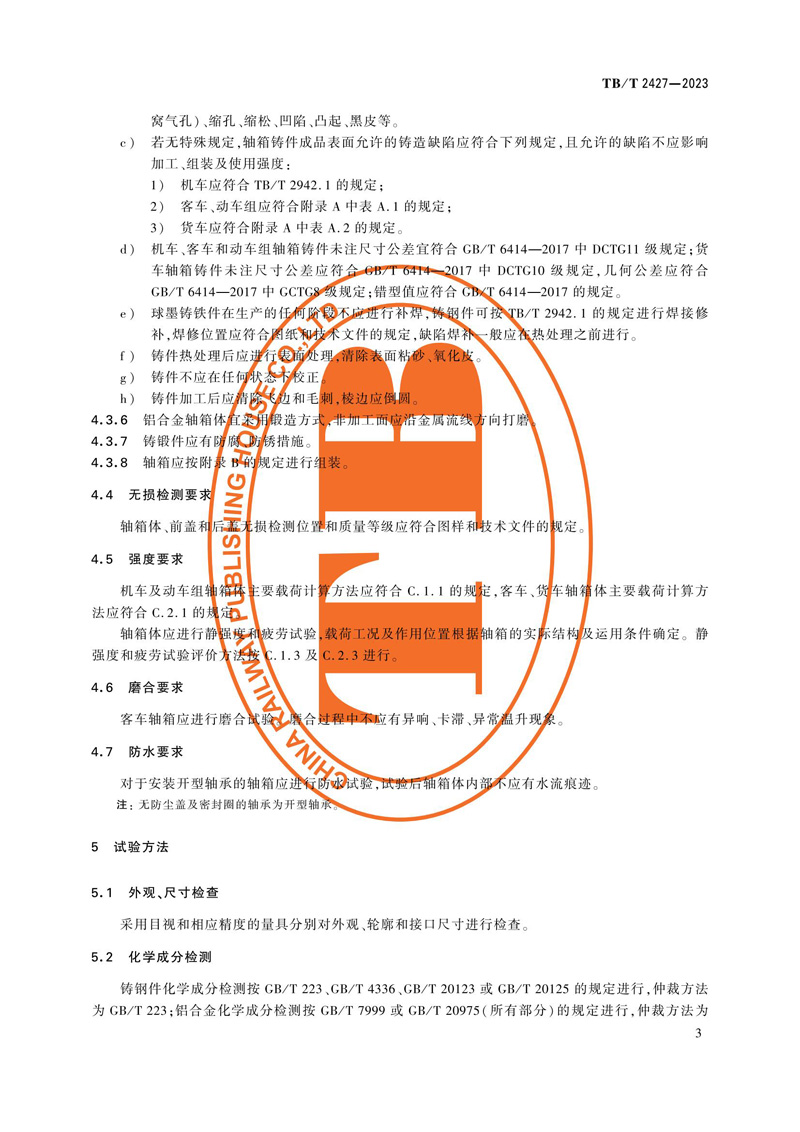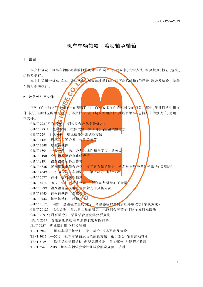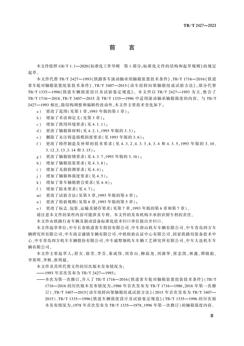 本标准为国家铁路局发布的铁道行业标准,技术标准2023年第3批(共7项标准),铁标名称:《机车车辆轴箱 滚动轴承轴箱》 TB/T 2427-2023,代替标准TB/T 2427—1993《铁路客车滚动轴承用轴箱装置技术条件》、TB/T 1716—2016《铁道客车轮对轴箱装置组装技术条件》、TB/T 3407—2015《动车组转向架轴箱组成试验方法》,部分代替TB/T 1335—1996《铁道车辆强度设计及试验鉴定规范》。本文件按照GB/T 1.1—2020《标准化工作导则 第1部分:标准化文件的结构和起草规则》的规定起草,本文件以TB/T 2427—1993为主,整合了TB/T 1716—2016、TB/T 3407—2015及TB/T 1335—1996中适用滚动轴承轴箱强度的内容,本文件规定了机车车辆滚动轴承轴箱的术语和定义,技术要求,试验方法,检验规则,标志、包装、运输及储存,适用于机车、客车、货车及动车组滚动轴承轴箱(以下简称轴箱)的设计、制造及检验。特种车辆可参照执行。