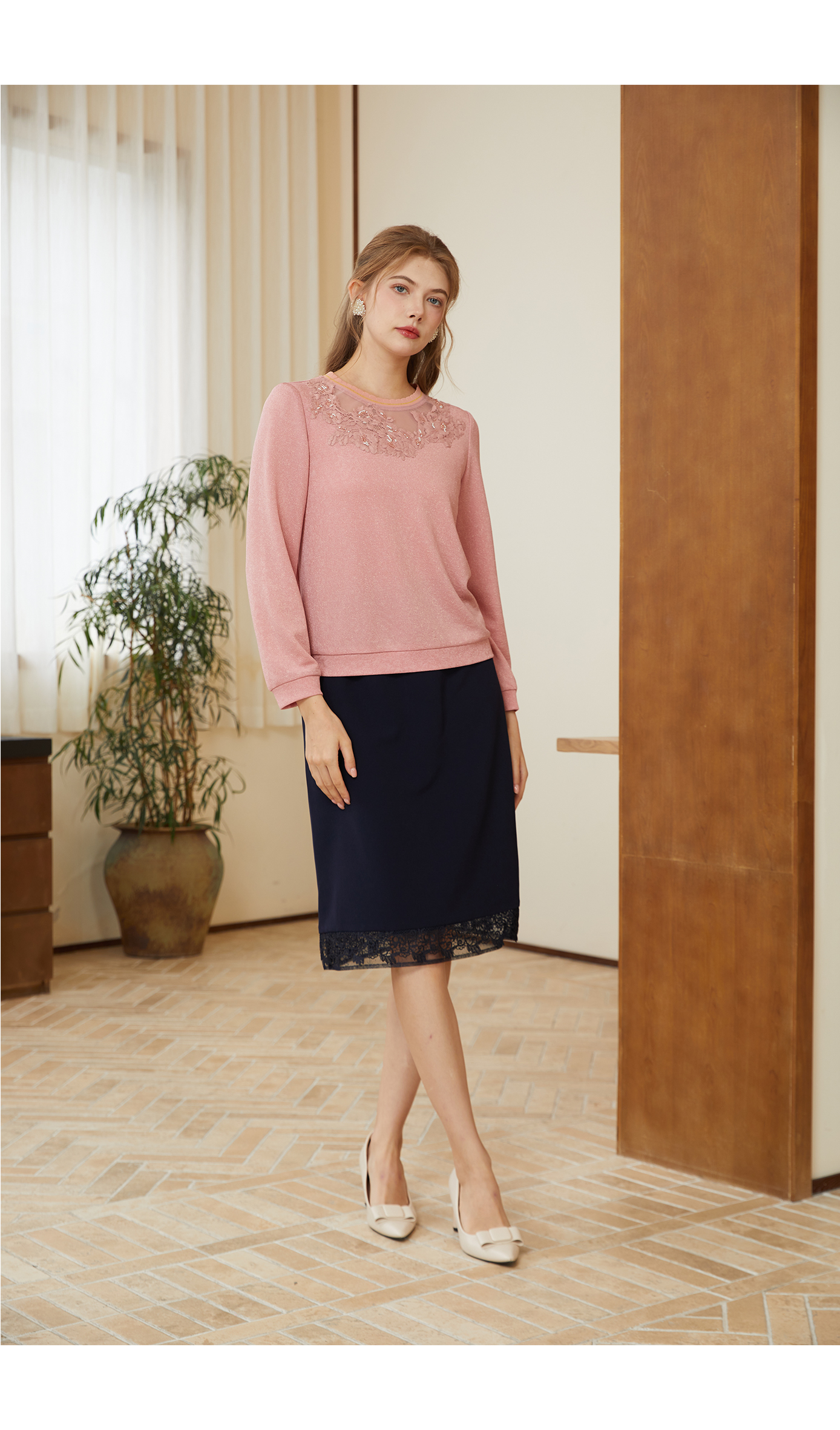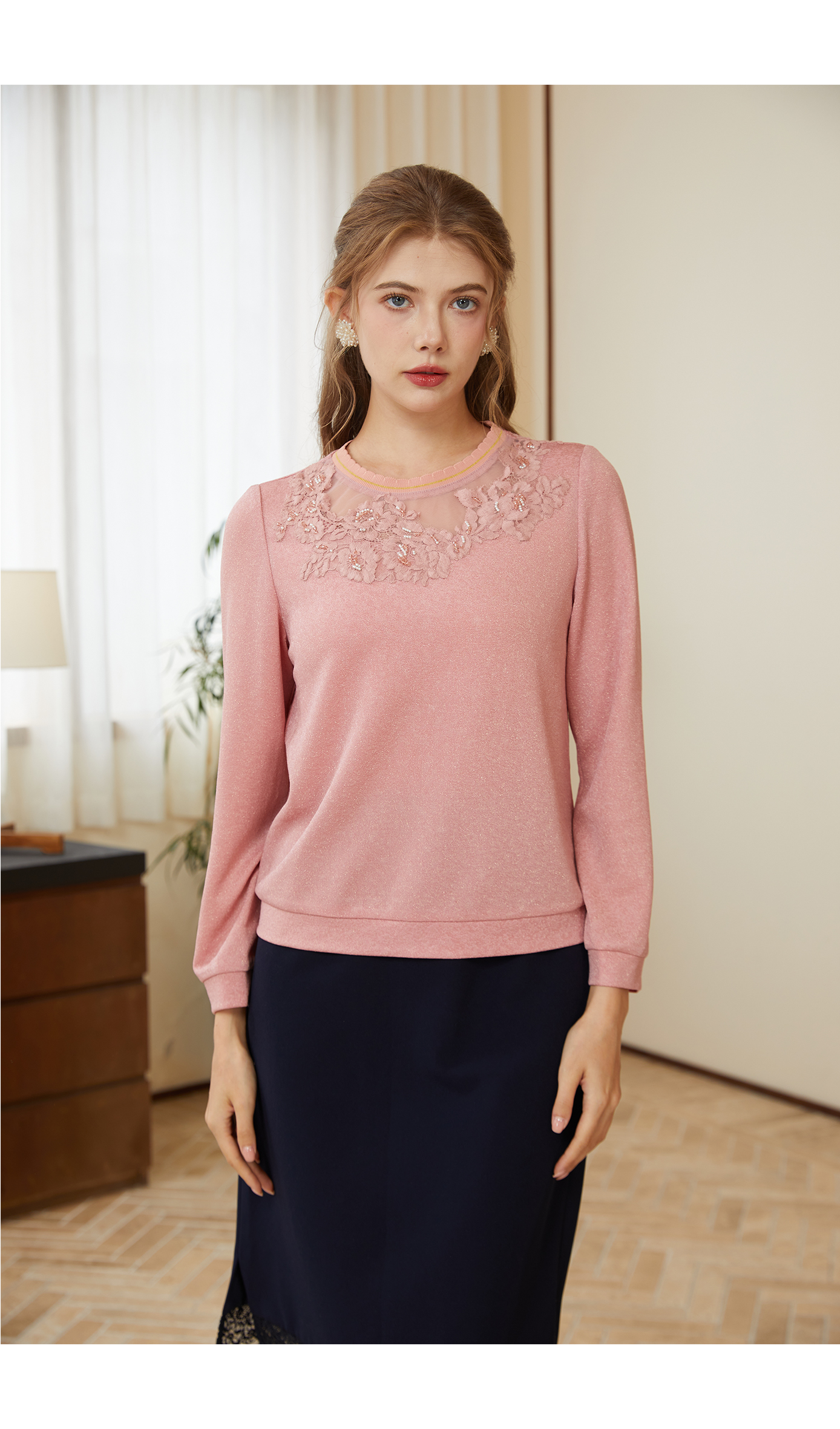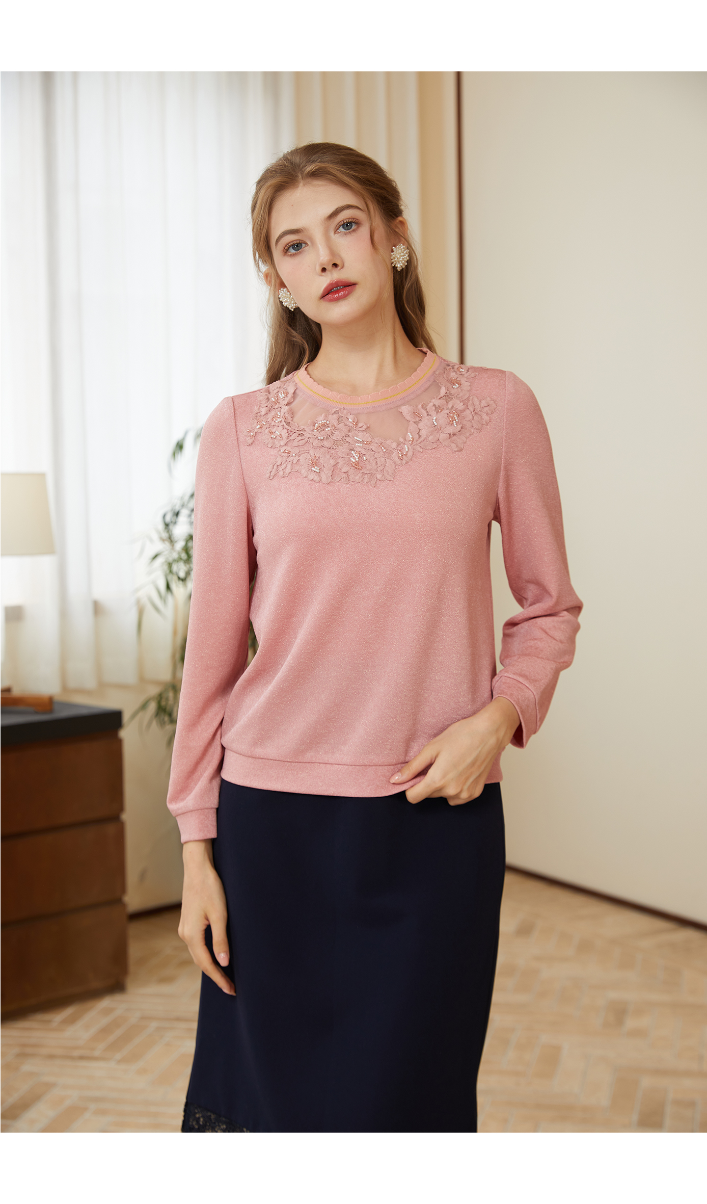 司歌弹力针织上衣拼蕾丝长袖上衣T921265y