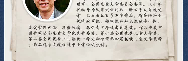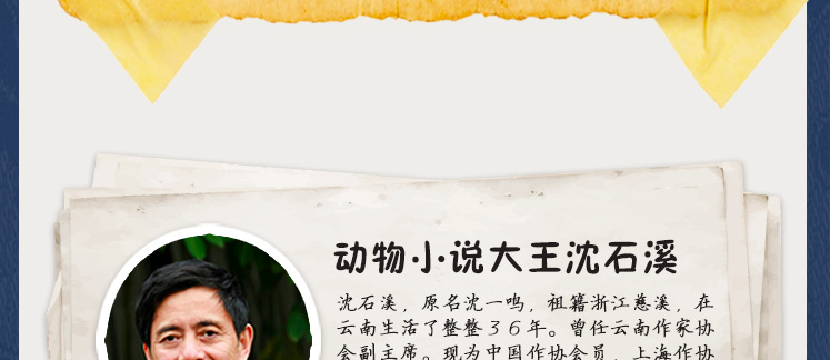 沈石溪,原名沈一鸣,祖籍浙江慈溪,在云南生活了整整36年。曾任云南作家协会副主席。现为中国作协会员,上海作协理事,全国儿童文学委员会委员。八十年代初开始从事文学创作,醉心于大自然文学,已出版五百多万字作品。所著动物小说将故事性、趣味性和知识性融为一体,充满哲理内涵,风格独特,深受青少年读者的喜爱。作品曾获中国作家协会儿童文学优秀作品奖、第六届全国优秀儿童文学奖、第二届全国优秀少儿读物一等奖和台湾第四届杨唤儿童文学奖等;作品还多次被收进中小学语文教材。