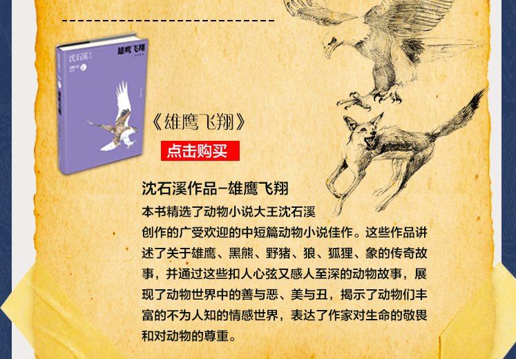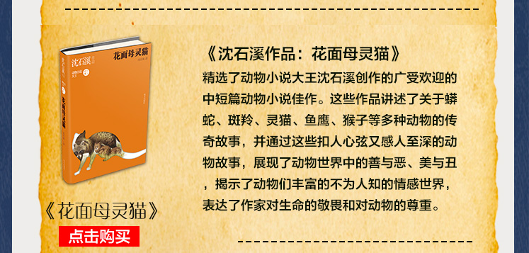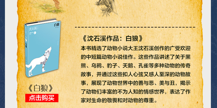 这些作品讲述了关于雄鹰、黑熊、野猪、狼、狐狸、象的传奇故事,并通过这些扣人心弦又感人至深的动物故事,展现了动物世界中的善与恶、美与丑,揭示了动物们丰富的不为人知的情感世界,表达了作家对生命的敬畏和对动物的尊重。
