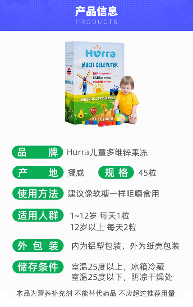 【保税】挪威hurra婴幼儿童多维锌 复合维生素补锌b族 草莓味软糖45粒