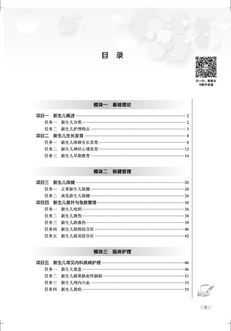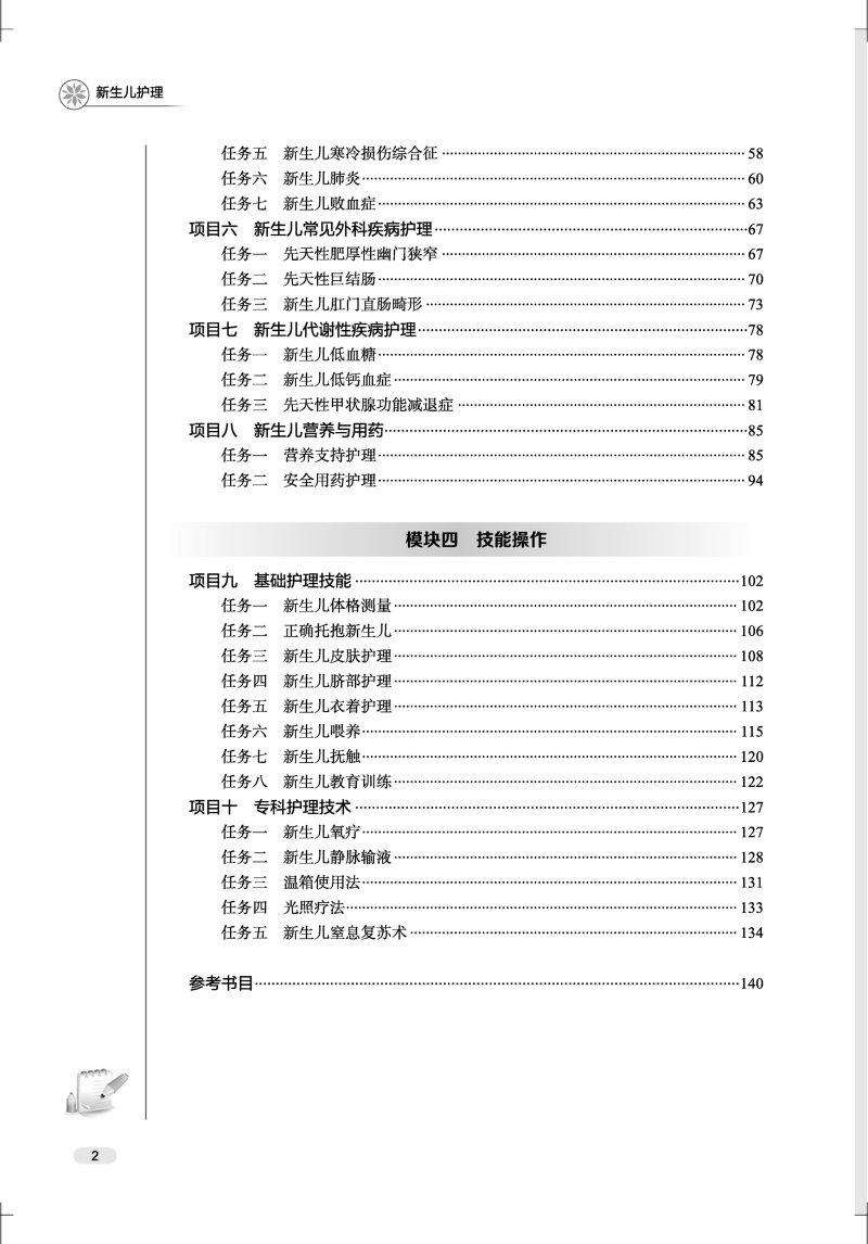 全书共4个模块,分别为基础理论、保健护理、临床护理、技能操作,包含新生儿概述,生长发育,保健,意外与急救管理,内、外科疾病护理,代谢性疾病护理,营养与用药,基础护理技能,专科护理技术共10个方面的内容。