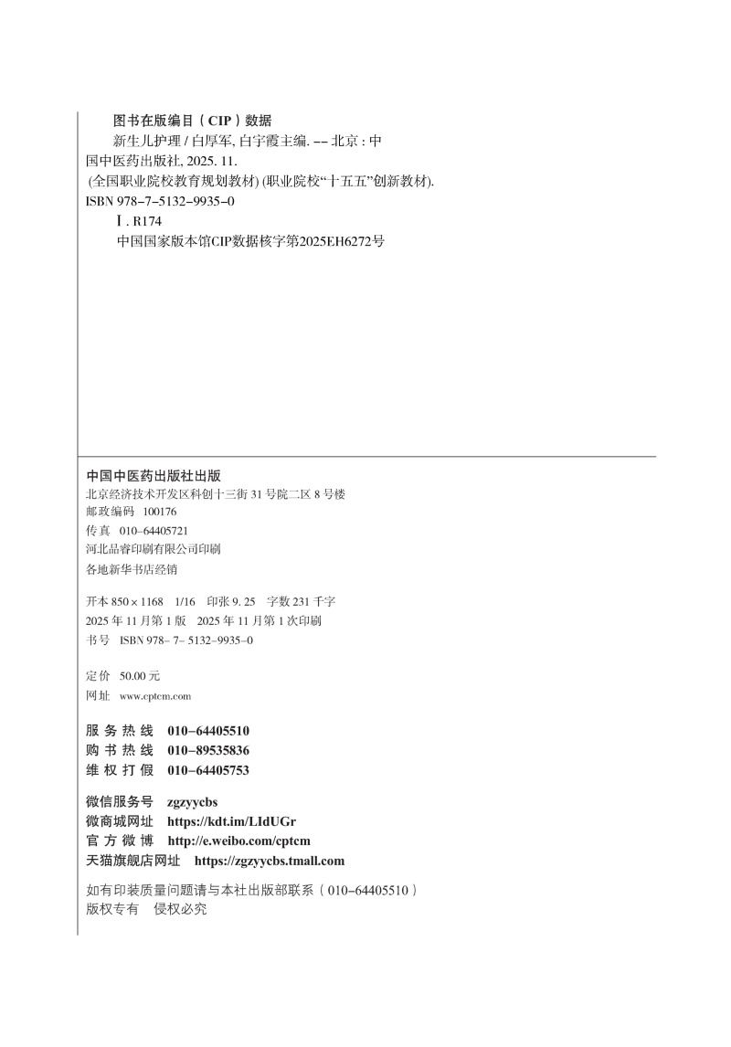 新生儿护理 全国职业院校教育规划教材 职业院校“十五五”创新教材 白厚军 白宇霞 主编 供护理、助产专业用 中国中医药出版社
