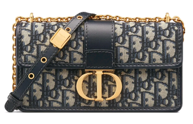 DIOR迪奥 30 Montaigne 最新蒙田刺绣老花满印可调节可拆卸链条翻盖开合 织物 链条包盒子包单肩斜挎包 小号 女款 蓝色