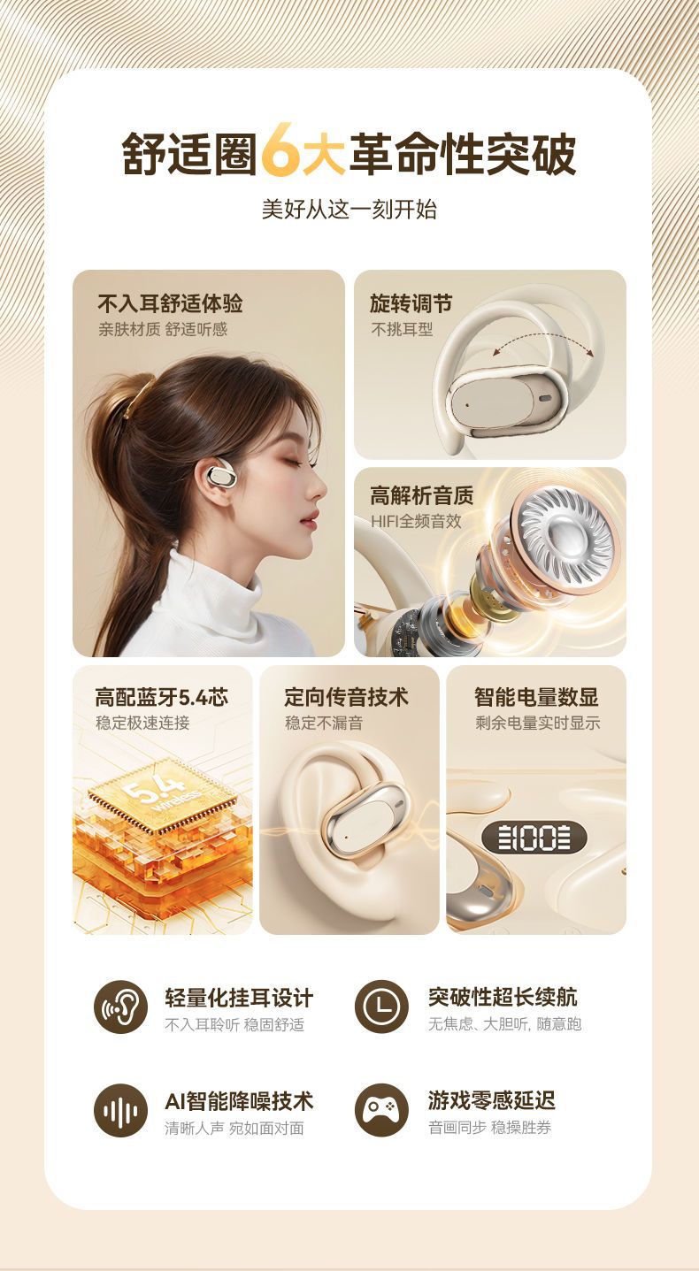 【智能降噪技术、超长续航设计】GT526Y柏林之声挂耳式OWS不入耳降噪蓝牙无线蓝牙耳机可旋转130°.TA
