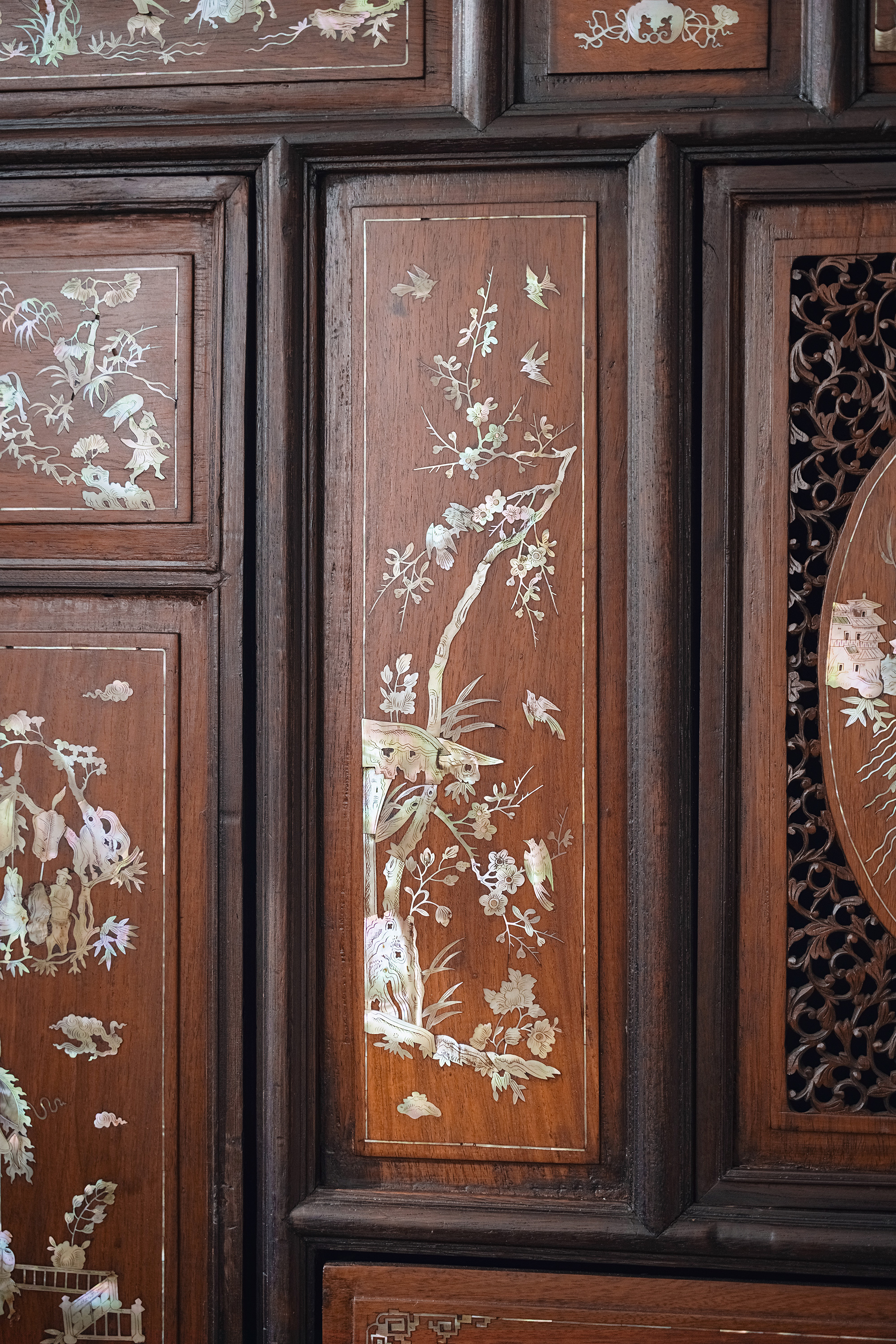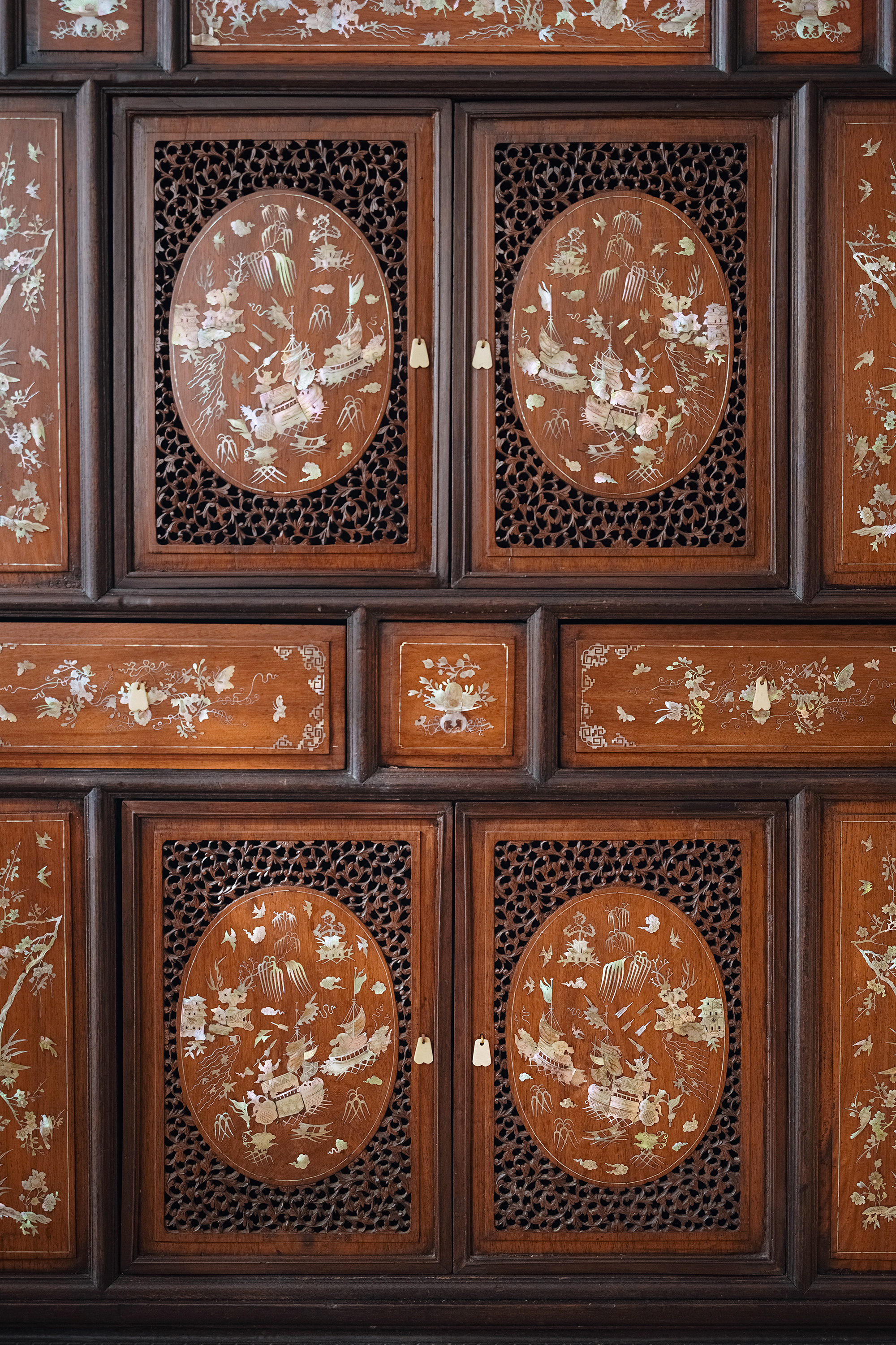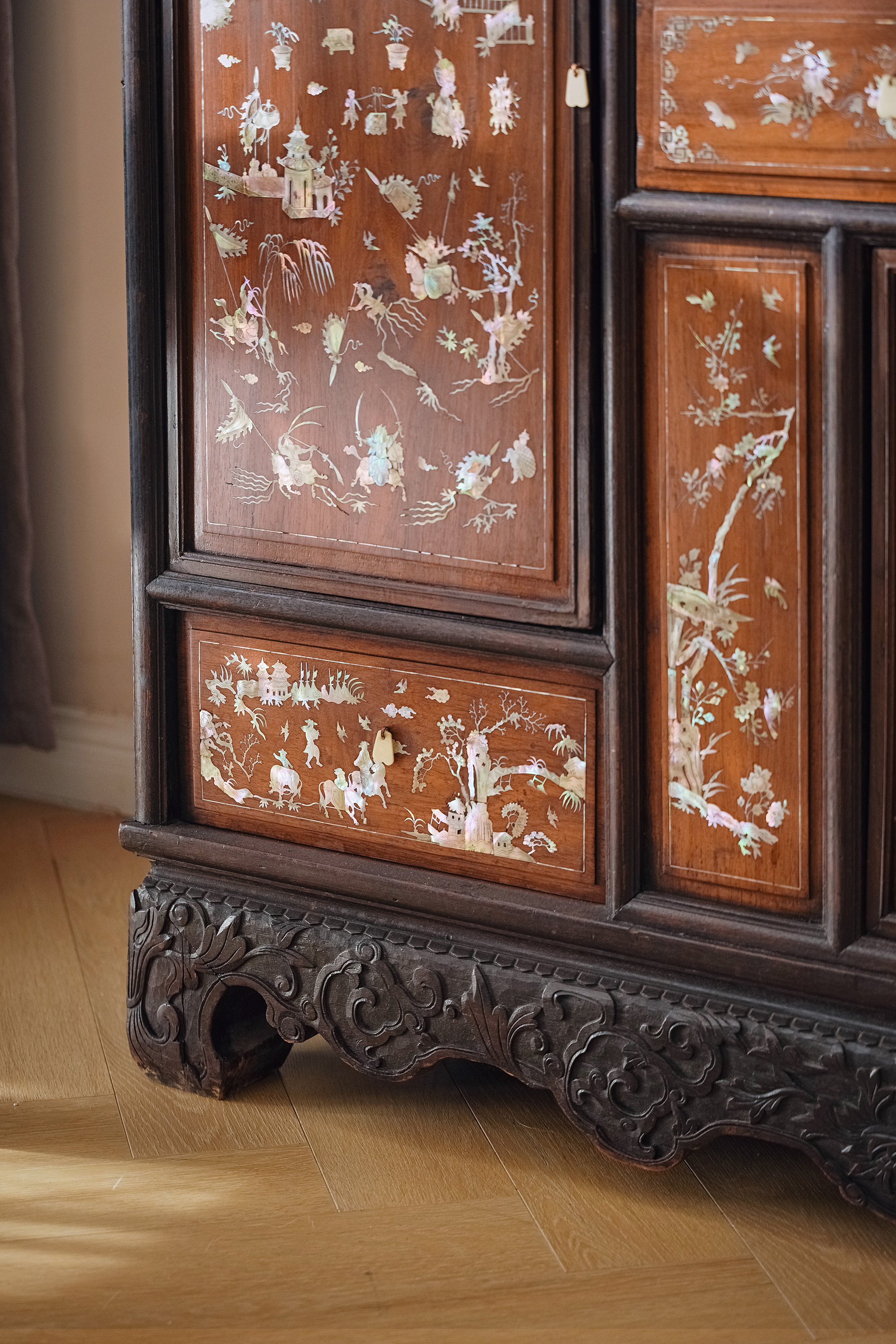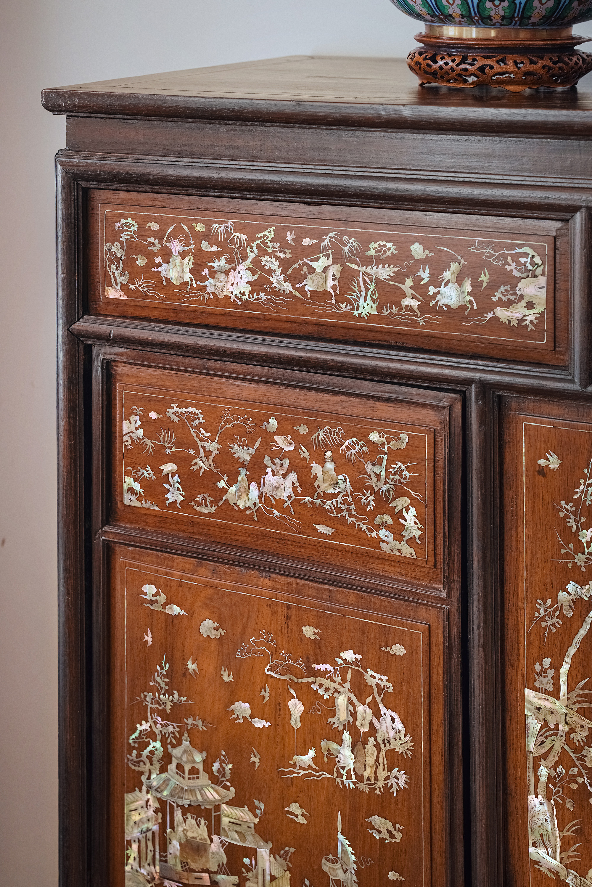1890年代东南亚地区出品传统亭台人物主题螺钿镶嵌边柜