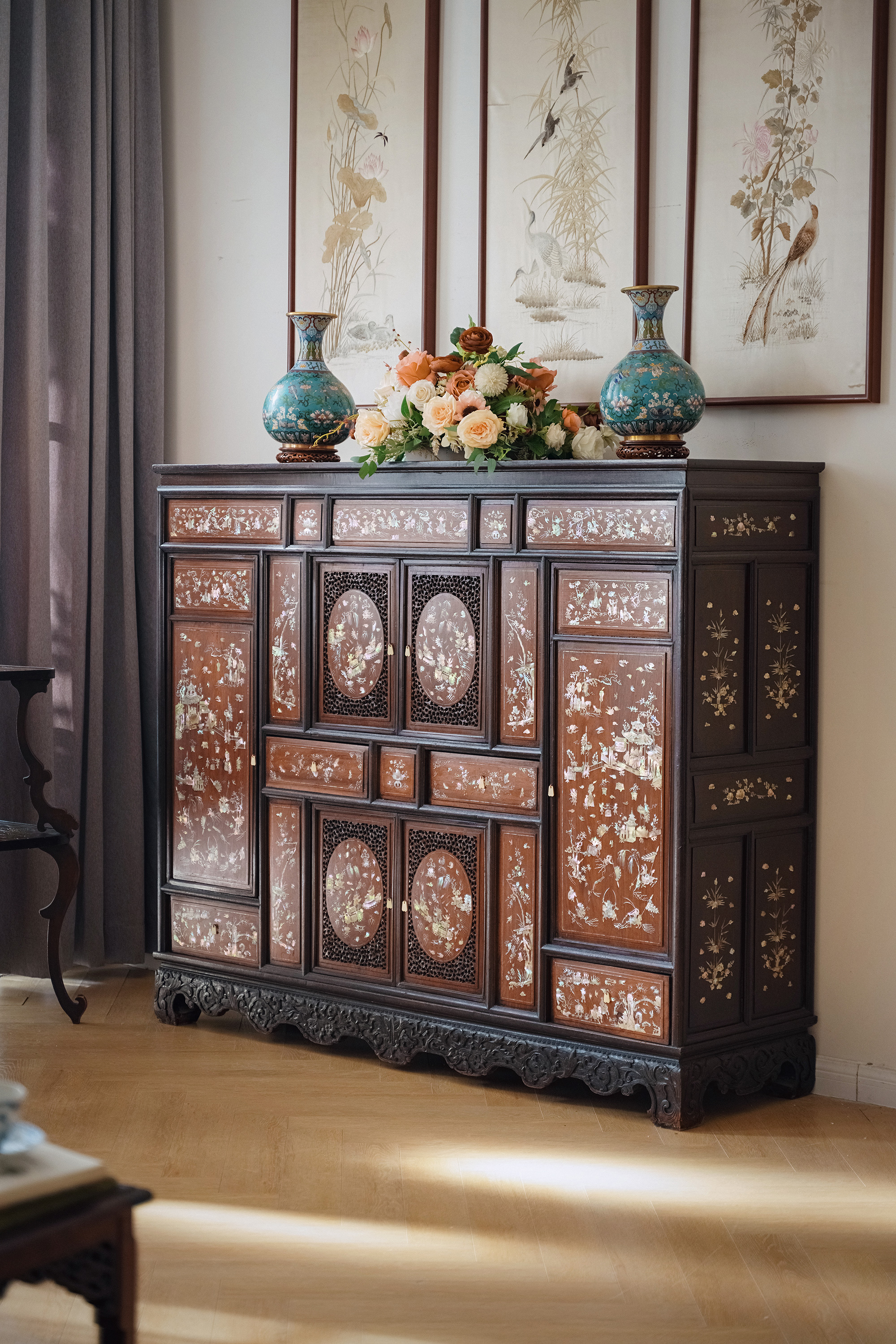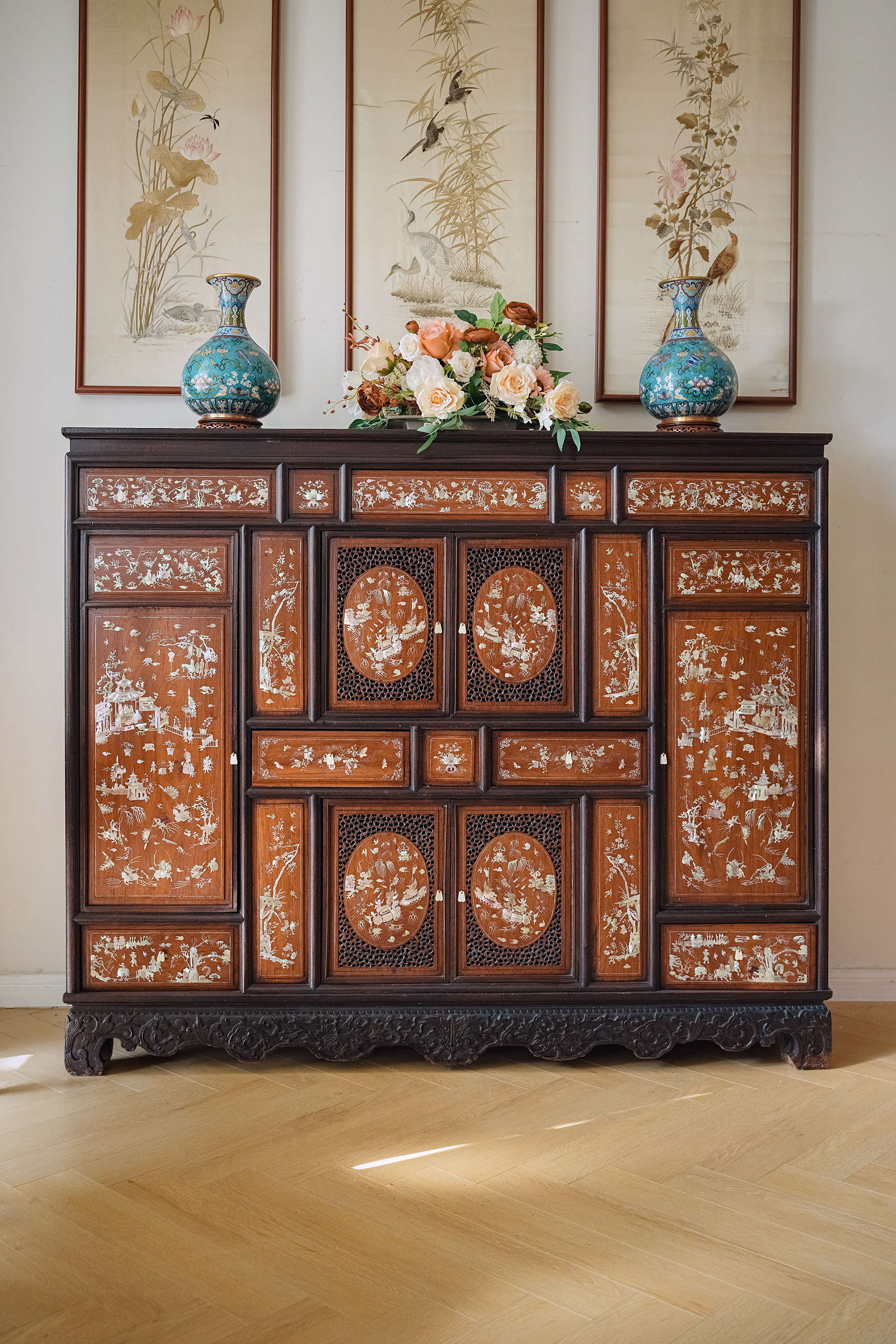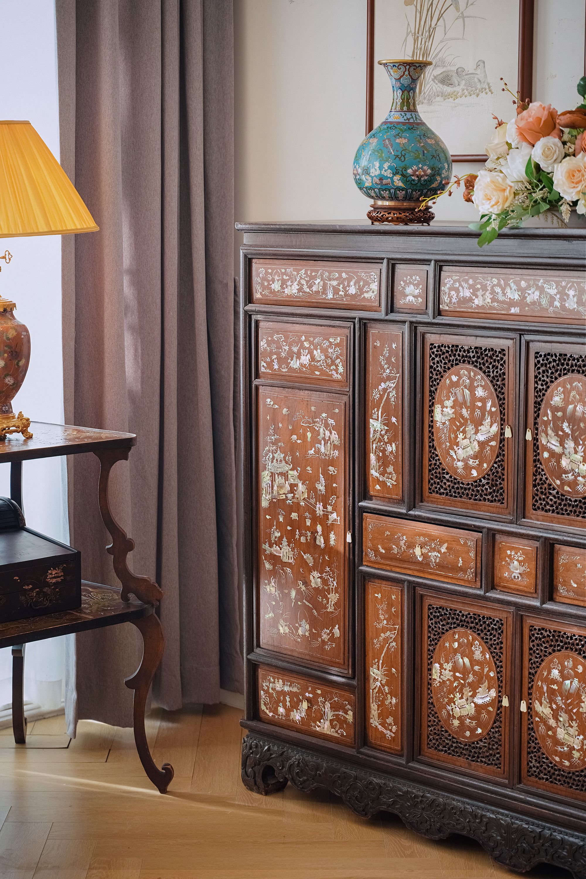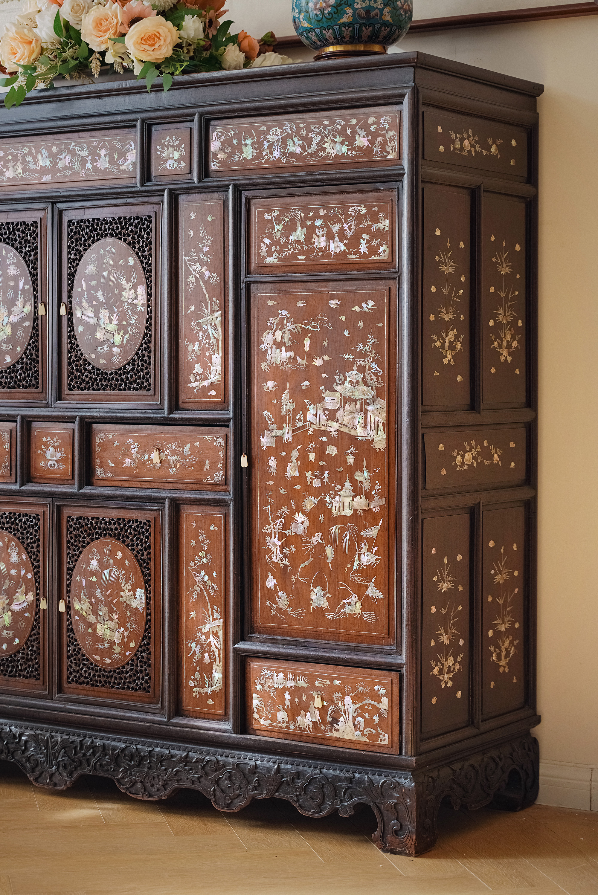 1890年代东南亚地区出品传统亭台人物主题螺钿镶嵌边柜