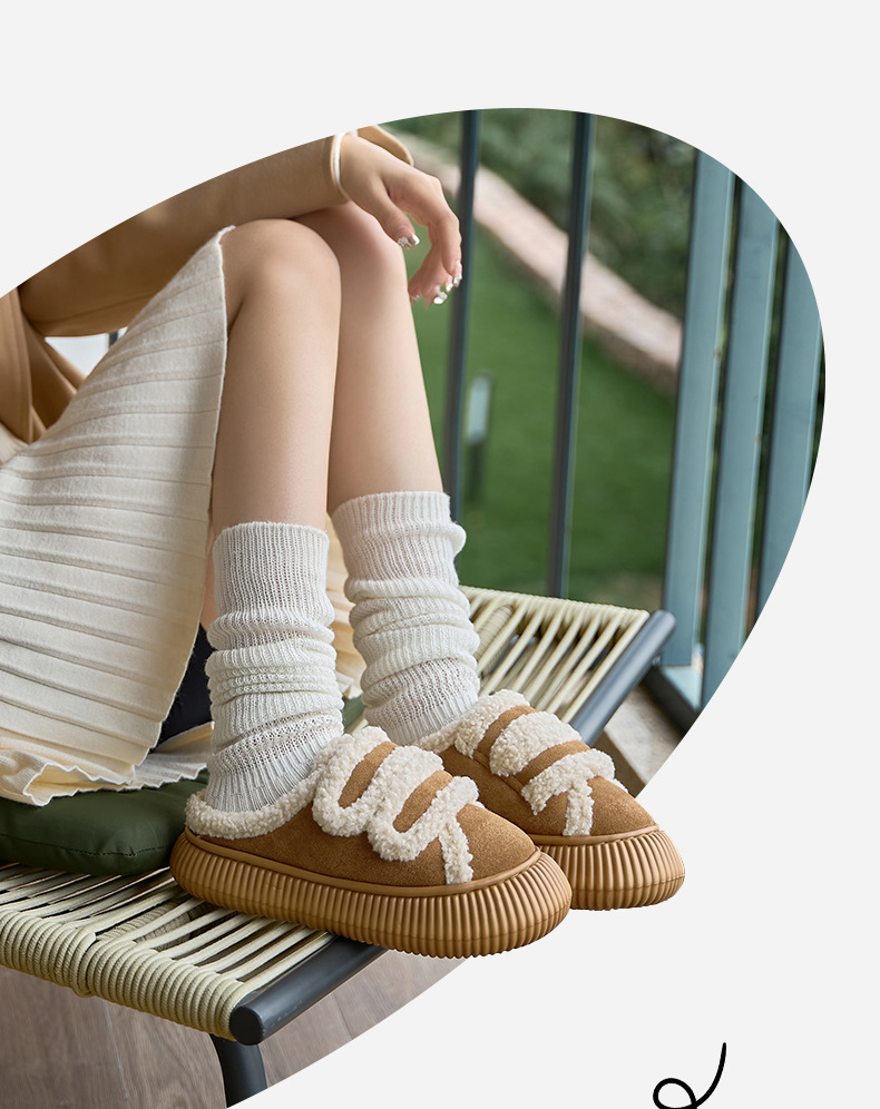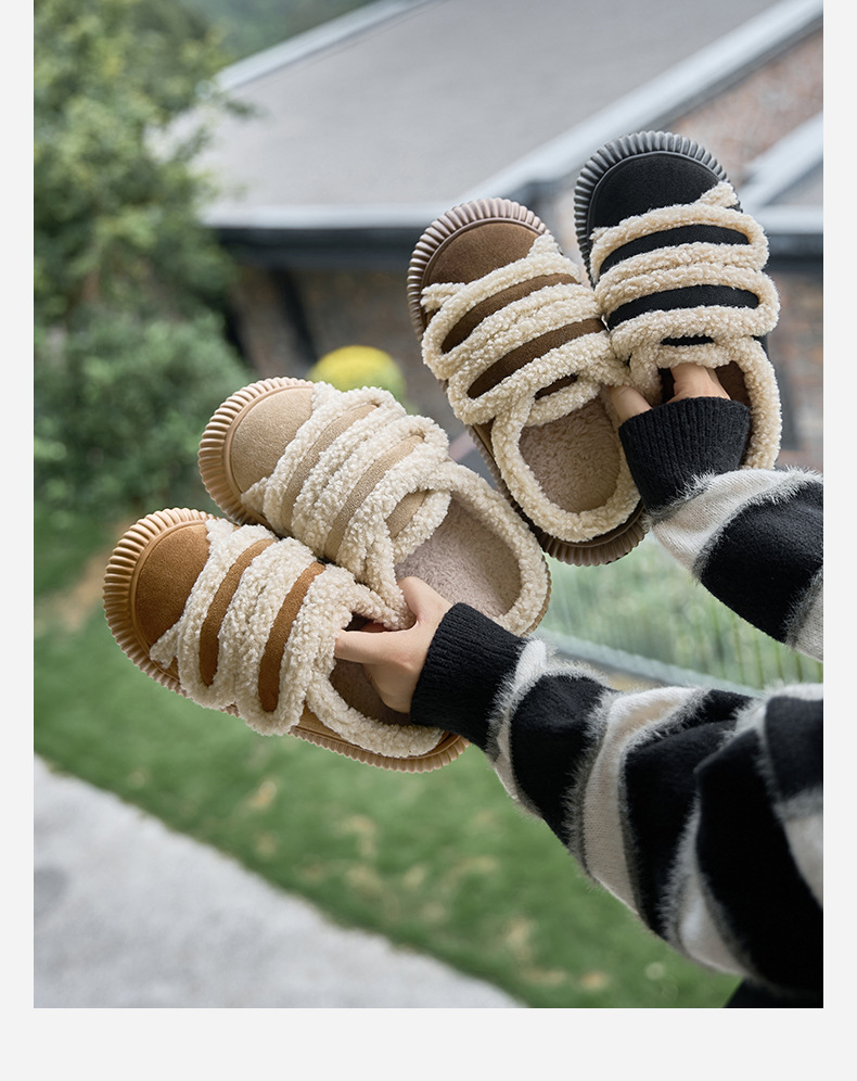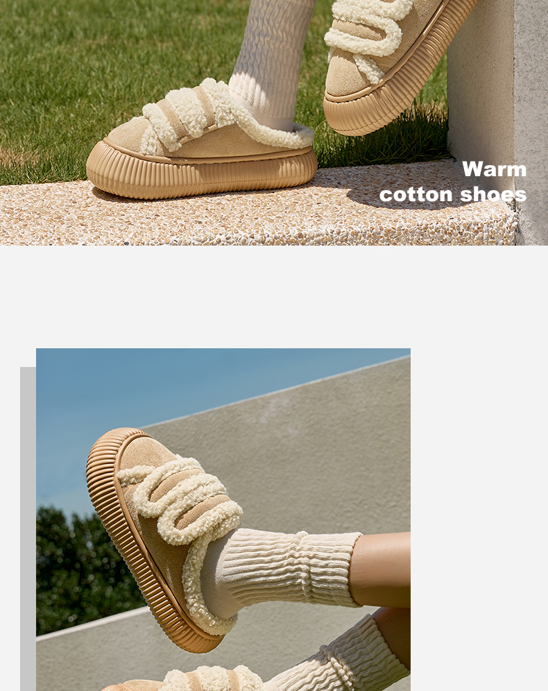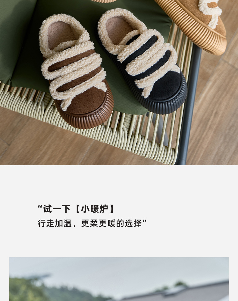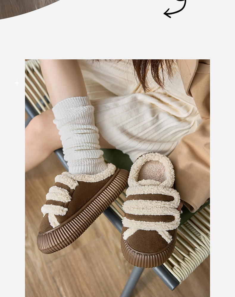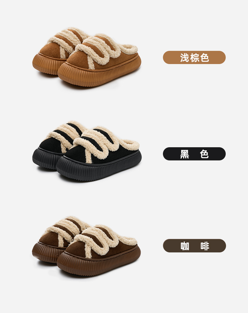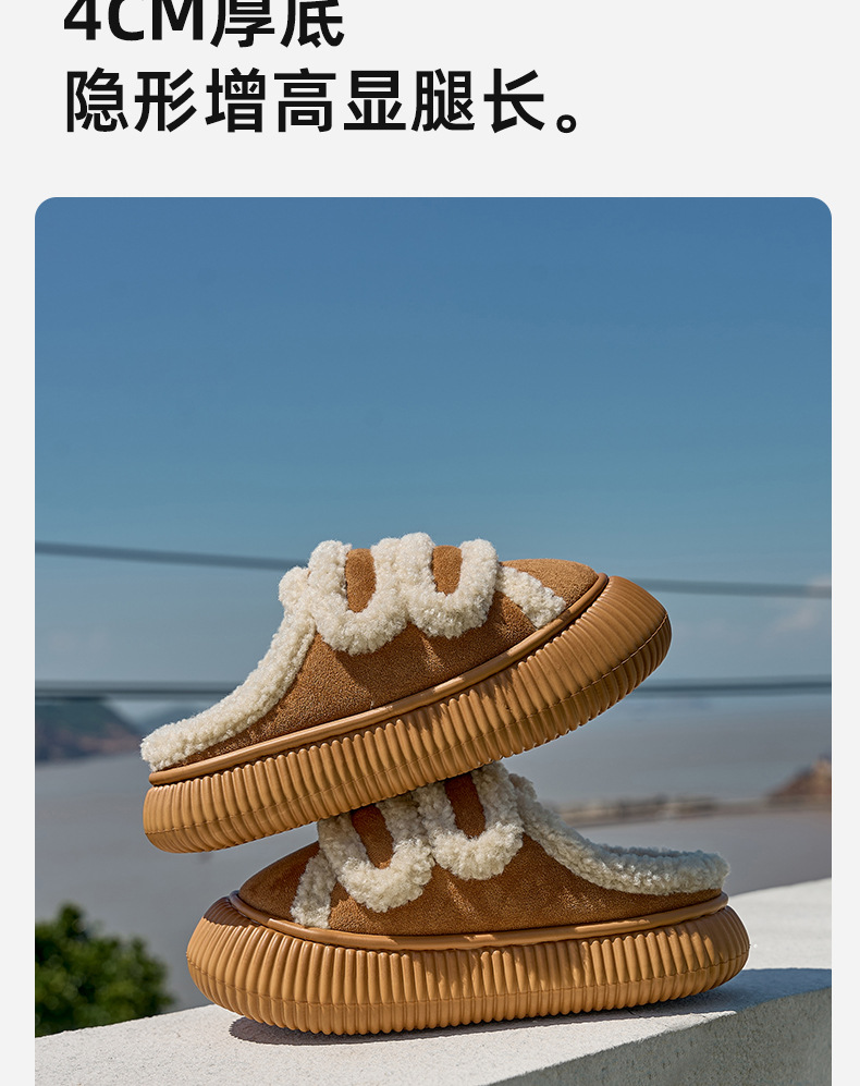【行走小暖炉! 魔术贴饼干鞋】柔软羊羔绒面,锁温抗寒,圆润防撞鞋头,耐磨防滑打底,4cm厚底,隐形增高秒变大长腿,室内半拖棉鞋,外穿防滑家居棉拖鞋L