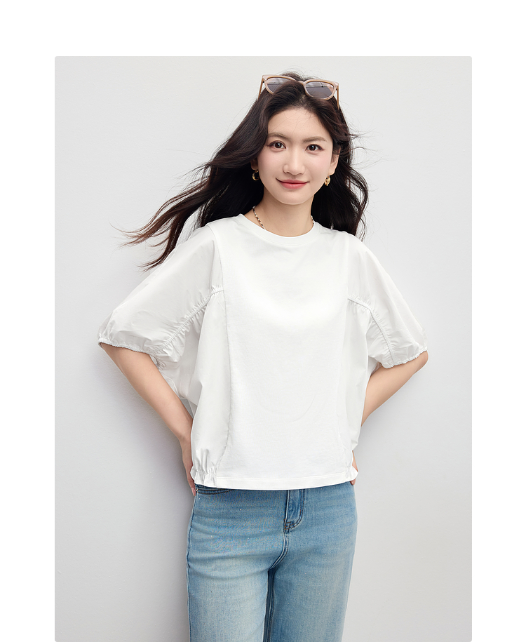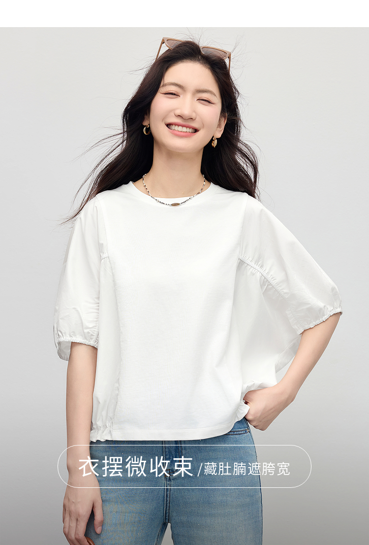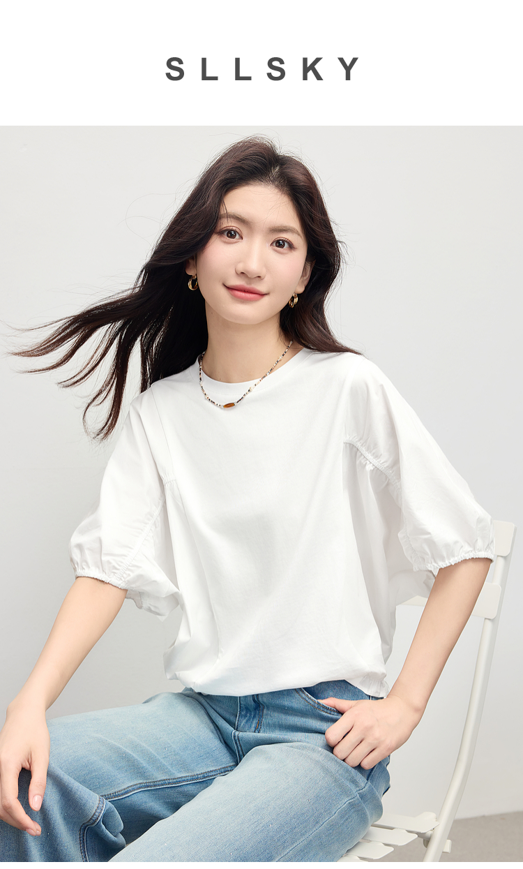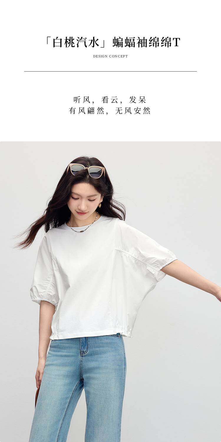 【周末秒杀】熙世界蝙蝠袖天丝白色T恤女宽松休闲独特设计感上衣夏日淡人穿搭