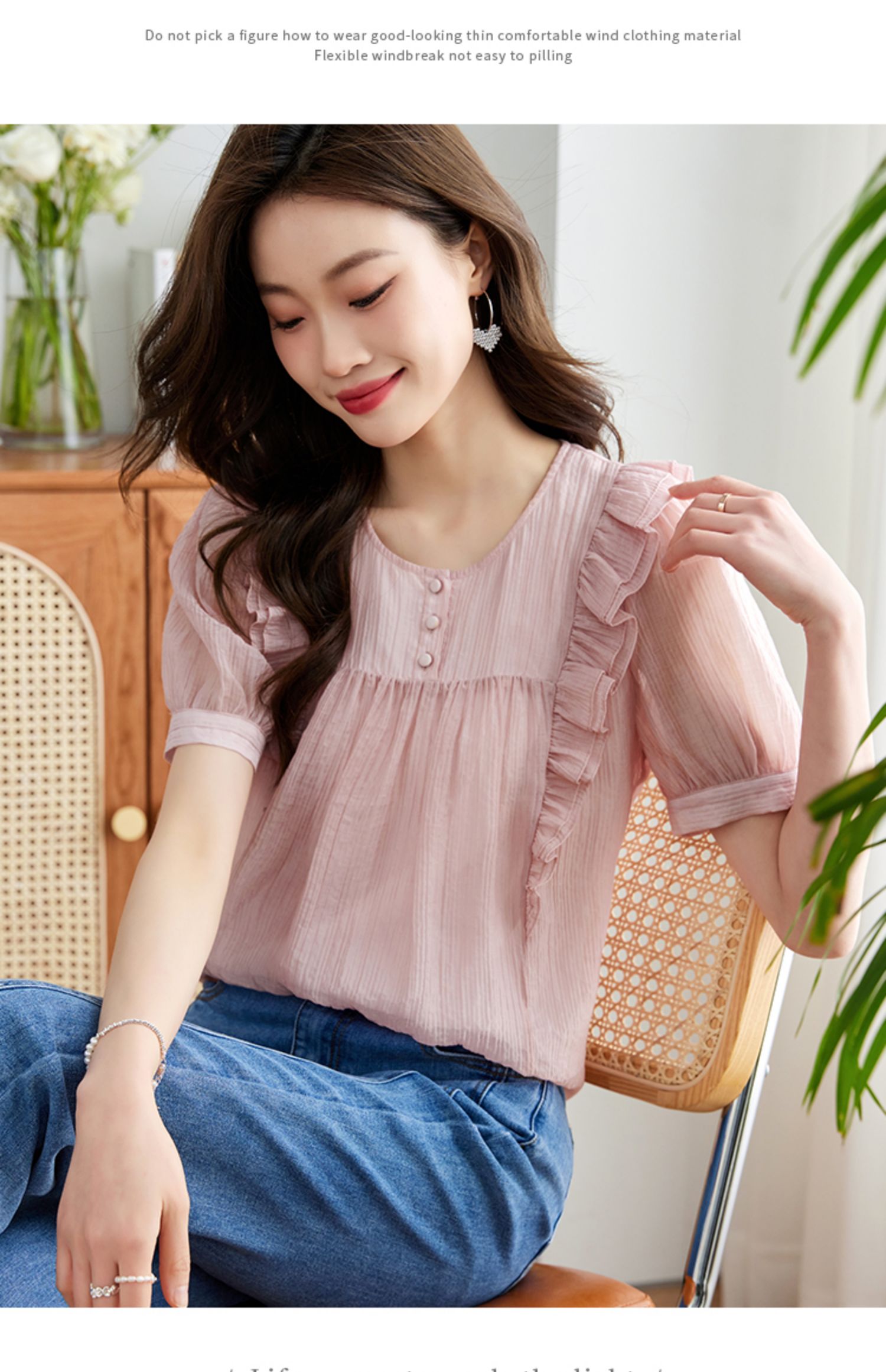 【专属特价】熙世界皱褶天丝衬衫女短袖2025夏季新款双层荷叶边小个子法式上衣