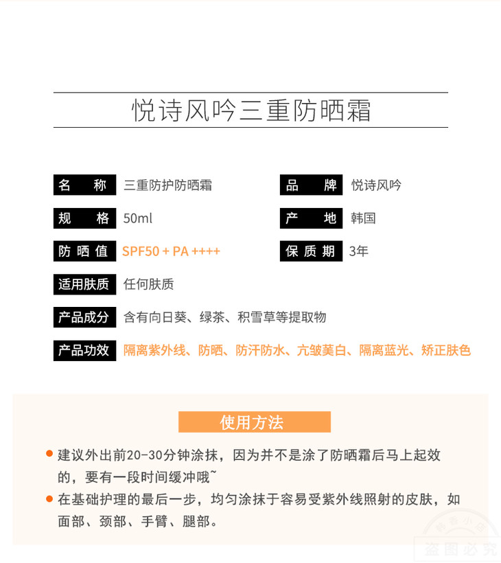 悦诗风吟三重防护防晒霜 50ml SPF50+PA++++