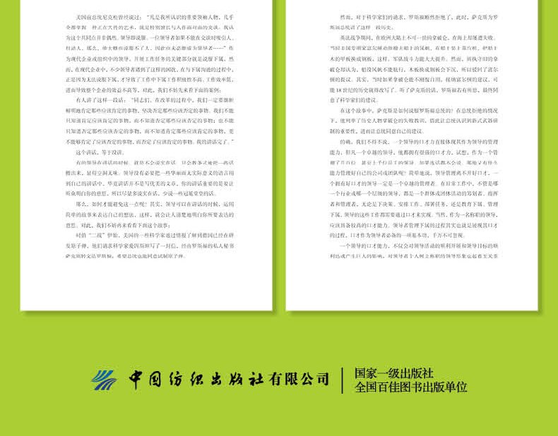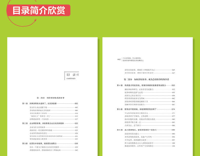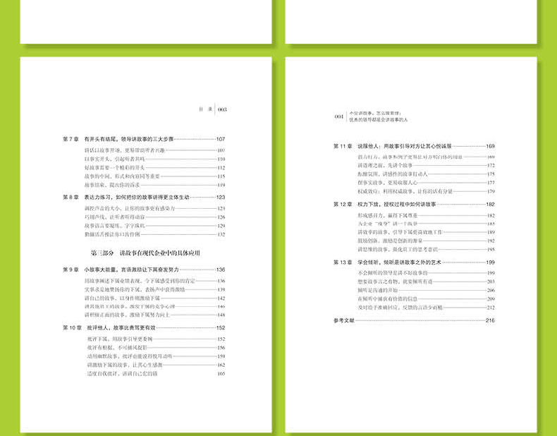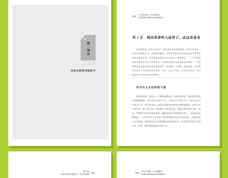 部分 用故事思维重新思考你为什么无法说服下属 002美国总统都善于讲故事 0品牌建设需要一个好故事 017企业为什么需要故事 022企业领导讲故事有讲究 028领导讲故事的六种类型 033给出一个能为下属指引方向的共同愿景 039讲付出的故事,鼓励员工积极提升自己 045第二部分 如何讲好故事,成为会讲故事的领导者做好调查和研究,让故事更有说服力 052讲讲自己的亲身经历 058讲故事时多使用视觉辅助工具 064第5章 要简洁不要烦琐,讲故事需要简洁明了 074讲故事要字字珠玑,言简意赅 077讲故事不妨主观一点 083第6 章 进入故事模式,掌握讲故事的一些技巧 090从听者角度讲故事,迅速产生共鸣 094将丰富的肢体语言注入到你的故事中 0第7 章 有开头有结尾,领导讲故事的步骤 7以事实开头,引起听者共鸣 1故事的中间,形式和内容同等重要 115第8 章 表达力练习,如何把你的故事讲得更立体生动 123巧用声线,让听者听得动容 126勤做活舌操让你口齿伶俐 132第9 章 小故事大能量,言语激励让下属奋发努力 136实事求是地赞扬你的下属,表扬声中获得激励 139讲其他员工的故事,激发下属的竞争心理 146第 章 批评他人,故事比责骂更有效 152批评有根据,不可捕风捉影 156讲激励下属的故事,让其心生感激 162不会讲故事,怎么做管理:br的领导都是会讲故事的人004借力打力,故事和例子更易让对方明白你的用意 169酝酿氛围,讲感性的故事打动人 175权威效应:利用权威故事,让你的话有分量 179形成感召力,赢得下属尊重 182讲效率的故事,引导下属更高效地工作 189讲思维的故事,强化员工的思考意识 195不会倾听的领导是讲不好故事的 199倾听是沟通的开始 206及时给予准确回应,反馈的言语少而精 212参考文献 216