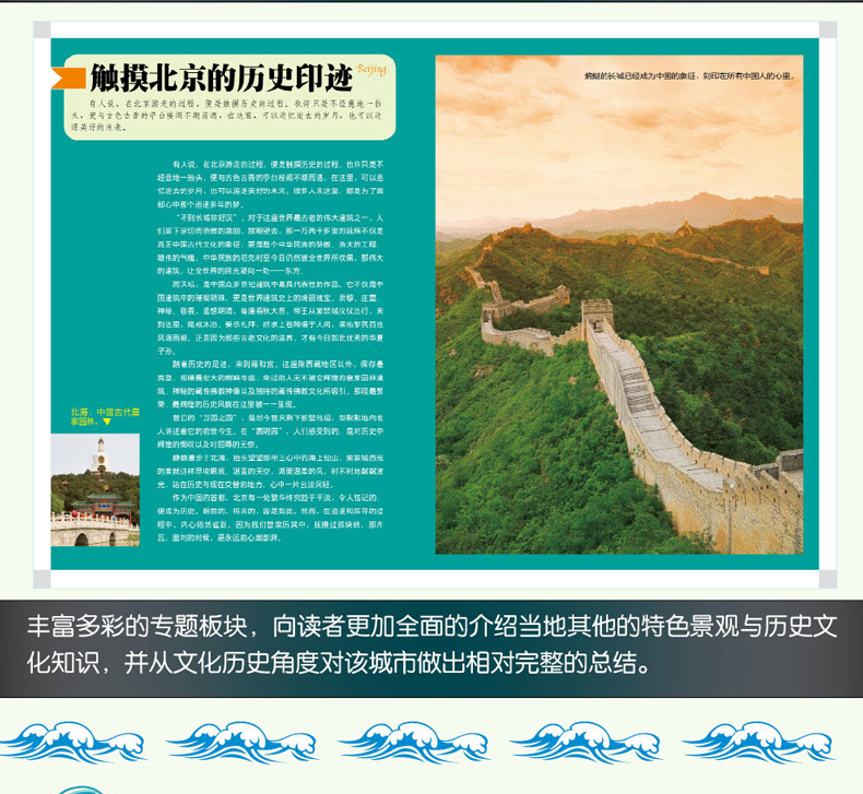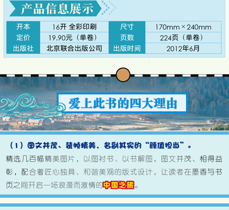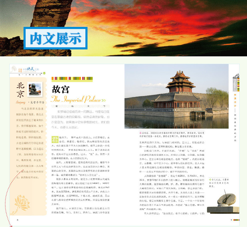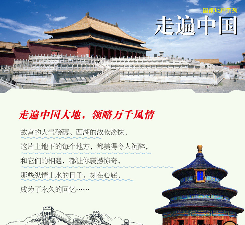Chapter-1 京津漫步 朝向***经典的方向 北京 故宫 颐和园 专题:触摸北京的历史印迹 北京***体育场 北京的胡同 天津 海河 古文化街 大沽*台 Chapter-2 中原巡礼 寻一曲,流转不息的华夏之歌 山东 泰山 曲阜孔庙 专题:避暑胜地话山东 河北 白洋淀 坝上草原 承德避暑山庄 清东陵 河南 龙门石窟 少林寺 专题:千年韶华——河南的古都 山西 五台山 恒山 平遥古城 专题:“大院”拾零 壶口瀑布 陕西 华山 西安 秦始皇陵兵马俑 Chapter-3 东三省拾趣 林海雪原的变奏 辽宁 大连 沈阳故宫 吉林 长白山天池 高句丽王城 黑龙江 大兴安岭 五大连池 哈尔滨 专题:“冰城”的冰雪之趣 漠河 Chapter-4 塞外风光 长风万里且放歌 内蒙古 呼伦贝尔草原 专题:草原风光览胜 额济纳 巴丹吉林沙漠 敦煌莫高窟 鸣沙山与月牙泉 玉门关 贺兰山 六盘山 塔克拉玛干大沙漠 雅丹魔鬼城 白哈巴 喀纳斯湖 伊犁草原 Chapter-5 青藏高原之旅 迎接***纯粹的阳光 青海 可可西里 青海湖 三江源 西藏 珠穆朗玛峰 雅鲁藏布大峡谷 阿里 拉萨 纳木措 Chapter-6 西南典藏 下一站,天堂 四川 九寨沟 稻城亚丁 卧龙 海螺沟 峨眉山 专题:天府之国的情趣生活 重庆 小寨天坑 大足石刻 长江三峡 云南 香格里拉 丽江 大理 泸沽湖 石林 西双版纳 滇池 贵州 黄果树瀑布 梵净山 织金洞 广西 漓江 专题:桂林山水甲天下 黄姚 大圩 Chapter-7 两湖山水 展开***美的水墨长卷 湖北 神农架 武当山 黄鹤楼 湖南 洞庭湖 张家界 衡山 凤凰古城 德夯 Chapter-8 烟波江南 与时光一起,在此终老 江苏 太湖 苏州园林 专题:姑苏城的湖光山色 扬州 专题:水乡的小镇 南京 上海 夜上海 豫园 浙江 普陀山 西湖 专题:钱塘自古繁华——杭州 嘉兴 安徽 黄山 九华山 天柱山 西递与宏村 江西 庐山 三清山 婺源 Chapter-9 东南沿海行 伴着海风去呼吸 福建 武夷山 福建土楼 鼓浪屿 广东 丹霞山 七星岩 开平碉楼 广州 海南 亚龙湾 三亚 Chapter-10 港澳台之旅 加入,这场永不落幕的繁华 香港 港岛 九龙区 旺角 澳门 大三巴牌坊 妈阁庙 台北 日月潭 阿里山 野柳