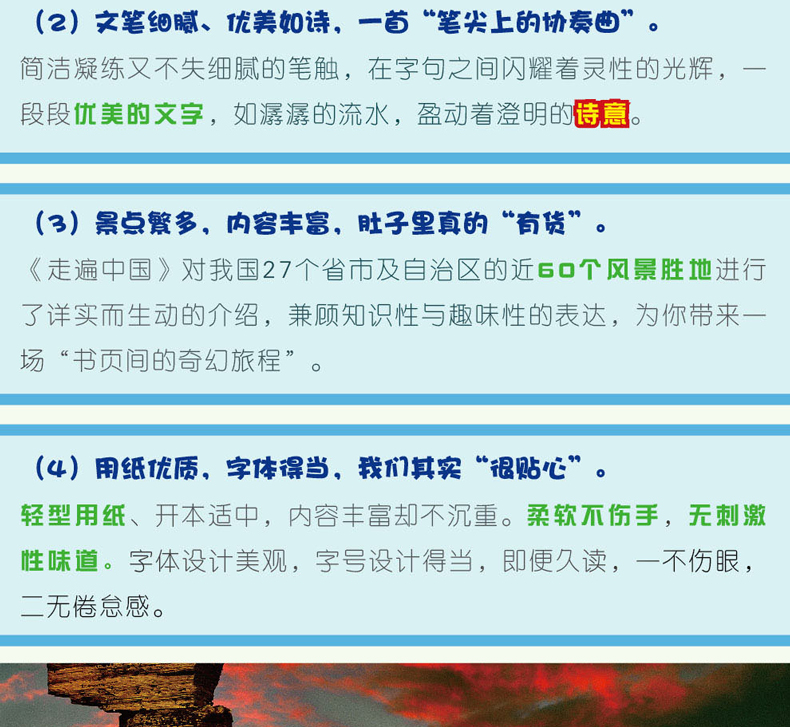 《图说天下·***地理系列:走遍中国》是一部人文地理巨著,编制 出一次穿越时空的梦幻之旅。 《图说天下·***地理系列:走遍中国》:在凡尘间,请你,试着把 心意放平,到能聆听花开的声音,走向不戴盔甲的柔软的自己。那么,在 圣洁的河畔,你会虔诚地许下心愿;冰晶的雪花会成为天使,令你顾盼流 连;哪怕是一颗小草,也让你心生怜爱,惹得情丝万千…… 一年四季,花儿开了又谢。一个美丽的国度,无论有怎样的光华流转 ,怎样的天地情殇,都赖你的痴心眷顾,都会在你跋涉的脚步中变得姿容 饱满,或者,那不仅是锦绣山河,还是你绮丽缥缈的梦……