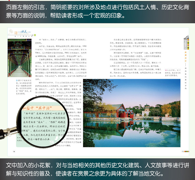 颐和园,山青水幽,景色秀丽。它坐落在北京城的西北郊,因为京城 的地势自北向南倾斜,因而成为名副其实的“ 宝地”,自古以来,这 片土地集帝王将相万千宠爱于一身。1764年,时值中国***后一个封建盛世 ——康乾盛世,颐和园始建成。它原名清漪园,***初只是帝后宫妃们休闲 避暑的场所,雍正帝继位后,开始长期居住在西郊园林中,连同政务、读 书、游乐于一体,如此,这里逐渐成为了政治和娱乐的双重中心。“颐和 ”的本意源自“颐养太和”。1860年,颐和园在第二次鸦片战争中被英法 联军烧毁,1886年,清政府挪用军饷对其重修,并改名为颐和园,作为慈 禧太后晚年的颐养之地。除了紫禁城,这里是晚清统治者***重要的政治和 外交活动中心,***是中国近代史的重要见证。 颐和园占地约290公顷,利用昆明湖、万寿山为基址,以杭州西湖风景 为蓝本,汲取江南园林的设计手法和意境而建,是一座大型天然山水园, 也是迄今为止保存得***为完整的皇家行宫御苑。 “虽由人作,宛白天开。”在造园艺术中,颐和园无愧于其“皇家园 林博物馆”的美名,集万家之大成,尽显皇家园林的恢弘富丽,同时充满 了和谐自然的生趣盎然。亭台、长廊、殿堂、庙宇和小桥诸多人工景观与 周围的自然山峦、粼粼湖面交相辉映,在中外园林艺术**占有显著地位 ,自然在人们的意料之中。 规模宏大,是颐和园景区的***大特色。在由万寿山和昆明湖两部分 组成的景区中,水的面积便占到3/4。园内以佛香阁为中心,共有景点建 筑百余座,院落20余处。佛香阁、长廊、石舫、苏州街、十七孔桥、谐趣 园、大戏台等,都是后人游历时必观的景点,可谓世界建筑文化中的珍品 。 未进颐和园,就已经被它雄伟的气势所感染。大门两侧傲然伫立的两 座狮子,公狮右爪握球,象征一统江山;母狮左爪扶幼,象征母仪天下。 走入大门是一对猪猴石,第二道大门,万寿石映入眼帘。万寿石后麒麟现 身。在颐和园,世界上***一对“龙在下,凤在上”的雕塑,象征着慈禧 太后至高无上的权利。 再往里,长廊显现。颐和园拥有世界上***长的长廊,1992年被列入“ 吉尼斯世界纪录”。它位于万寿山南麓,全长有728米,是中国园林中***长 的游廊。700余米的游廊中,绘有图画14000余幅,传统故事、山水风景、 花乌鱼虫置于画中。 长廊穿过佛香阁。佛香阁是颐和园里***大的工程,皇室在此烧香。它 位于万寿山前的山腰处,建在一个21米的长方形台基之上,是一座八面三 层四重檐的建筑。阁高41米,8根巨大擎天柱支撑其间,结构复杂却异常精 细。佛香阁以其庄重雄厚的风姿奠定了园中建筑群的主旋律,因为有它, 方才凸显昆明湖的荡漾,万寿山的庄严;因为有它,皇家气派才能***添几 分光辉。 颐和园的景区中,万寿山总能因其山间多而宏伟的建筑首先映入人们 的眼帘。从山脚的“云辉玉宇”牌楼,经排云门、二宫门、排云殿、德辉 殿、佛香阁,直至山顶的智慧海,形成了一条层层上升的中轴线。东侧有 “转轮藏”和“万寿山昆明湖”石碑;西侧有五方阁和宝云阁;后山有西 藏佛教建筑和五彩琉璃多宝塔;山上有景福阁、重翠亭、写秋轩、画中游 等等,诸多亭台楼阁,登其上方,昆明湖中秀美景色尽收眼底。 众多山上建筑,智慧海让人印象颇为深刻。“智慧海”原为佛教用语 ,本意用来赞扬佛的智慧如海,佛的 法力无边。这个建筑看似木结构,事实上没有用一根木料,全部是由 石砖砌成。因为没有横梁,也被称为“无梁殿”,又因为其 奉了无量 寿佛,所以也称呼它为“无量殿”。整个建筑全部由精美的黄绿两色琉璃 瓦装饰,中间夹杂少量紫蓝色琉璃,远远望去,色彩鲜艳,富丽堂皇。尤 其外嵌于壁面的干余尊琉璃佛,***是让人心生虔诚。 P12-14