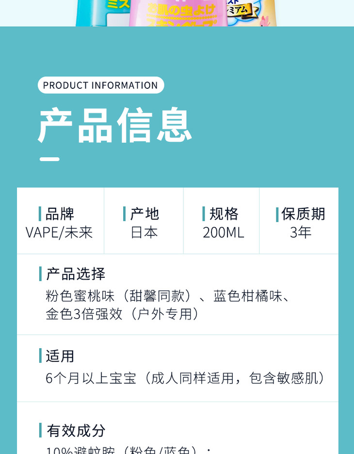 日本VAPE/未来驱蚊喷雾花露水儿童宝宝孕妇驱蚊水室内户外止痒水200ml