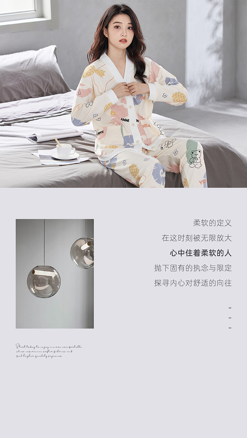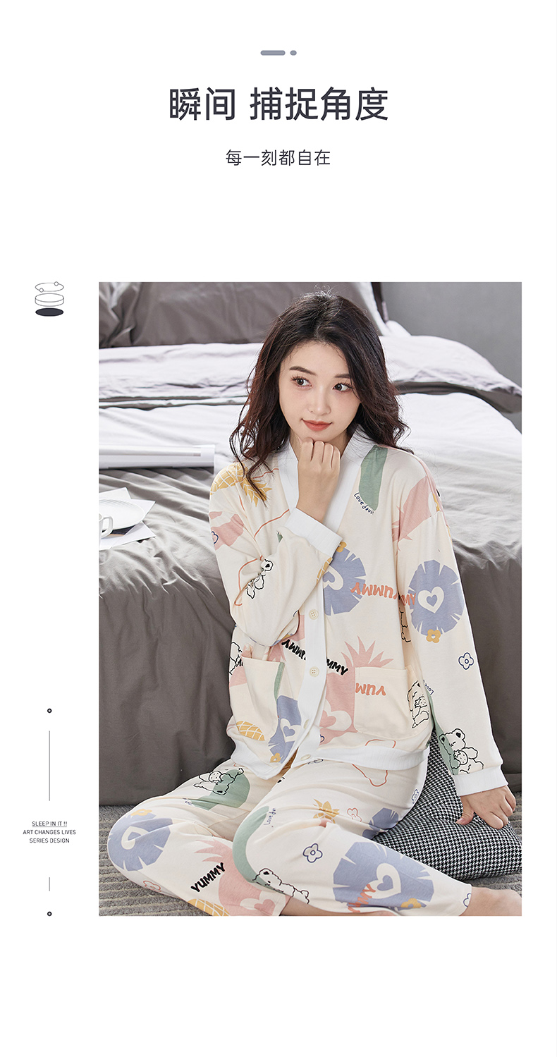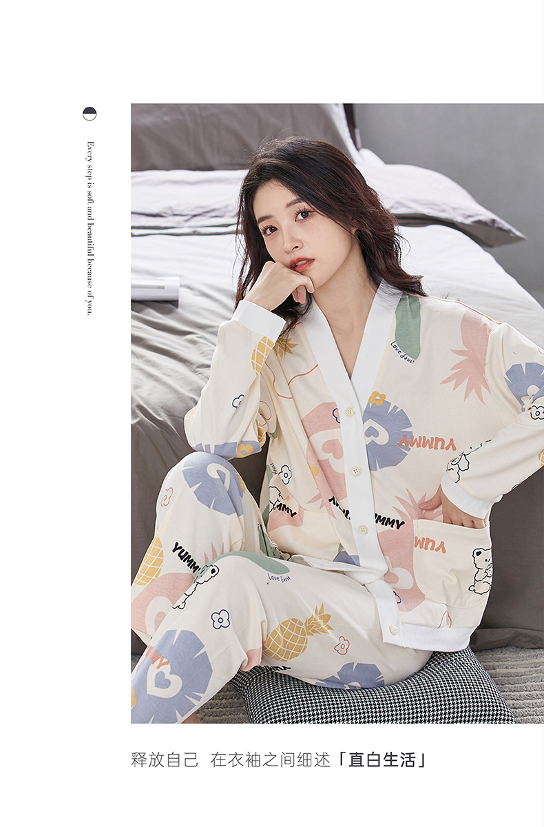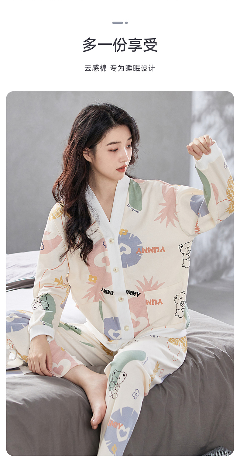 睡衣女纯棉春秋季开衫长袖长裤全棉全棉家居服套装 芬腾