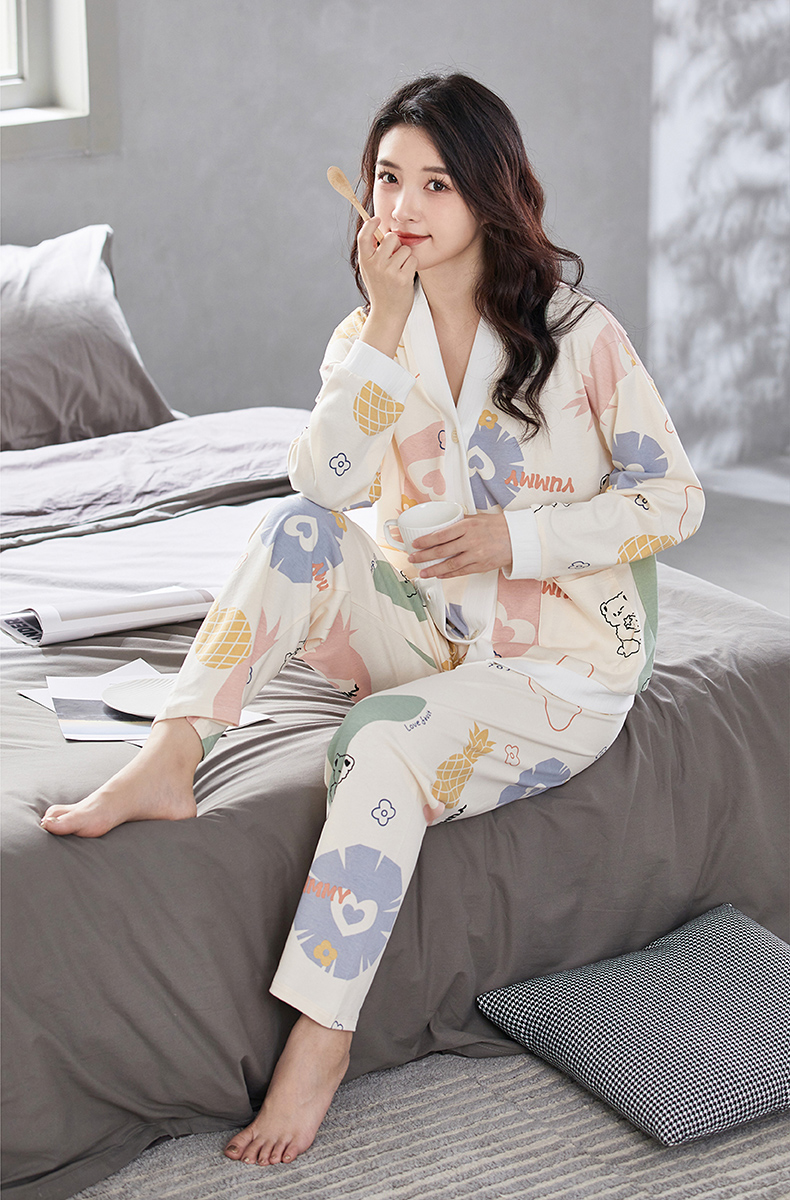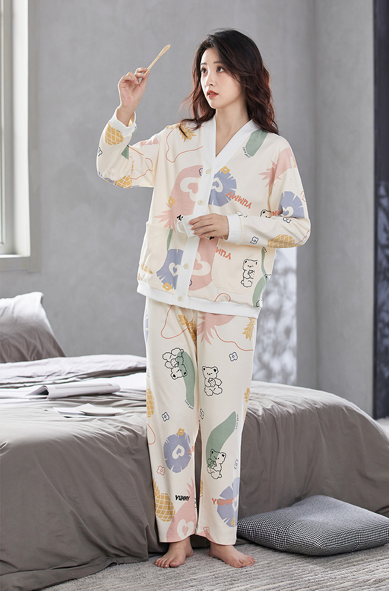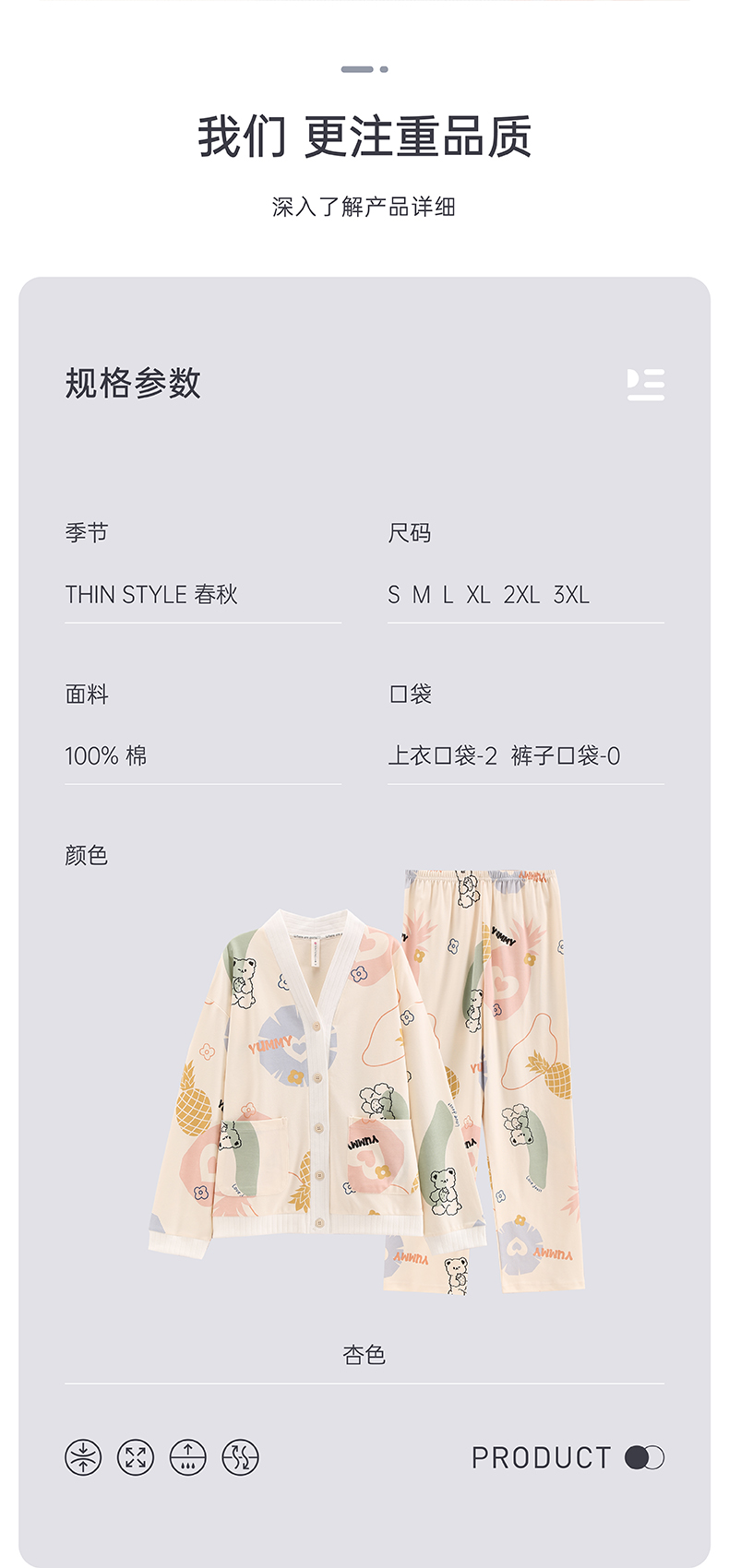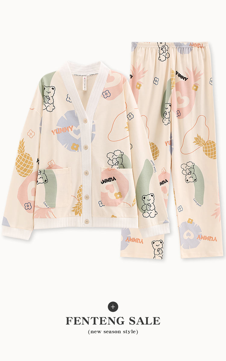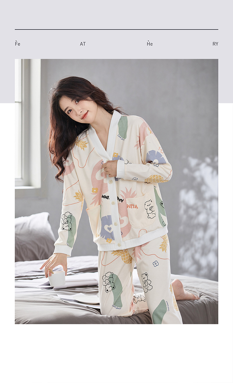 睡衣女纯棉春秋季开衫长袖长裤全棉全棉家居服套装 芬腾