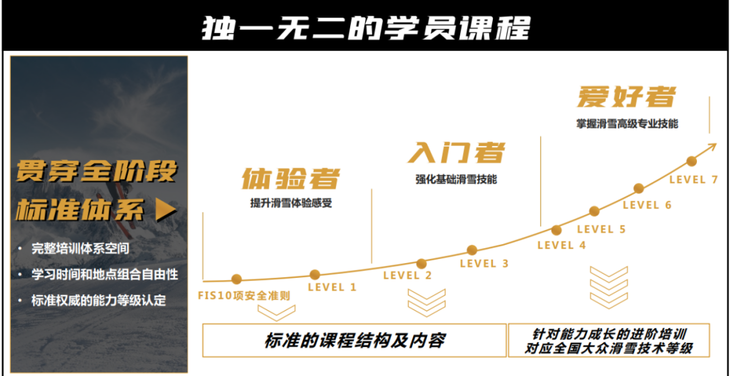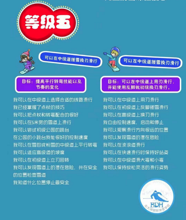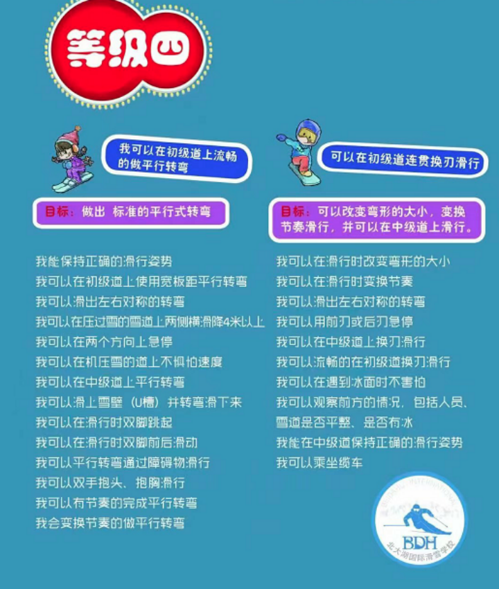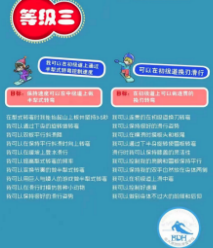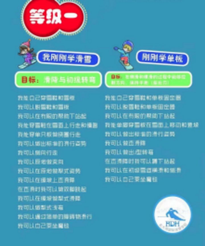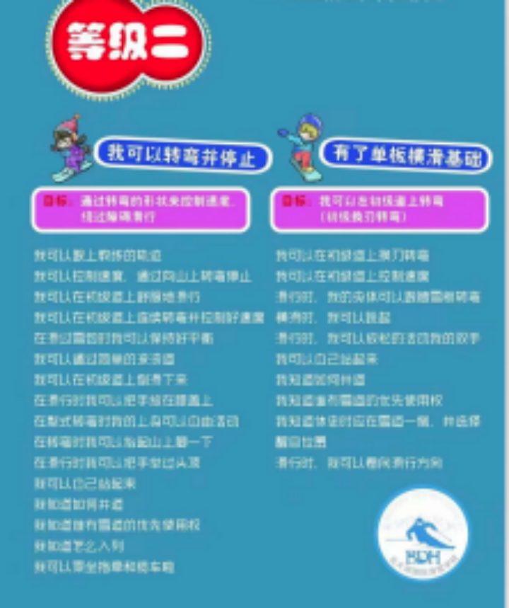学员滑雪训练后,将对照滑雪等级的详细标准,得出自己的滑雪水平处于哪个阶段。
