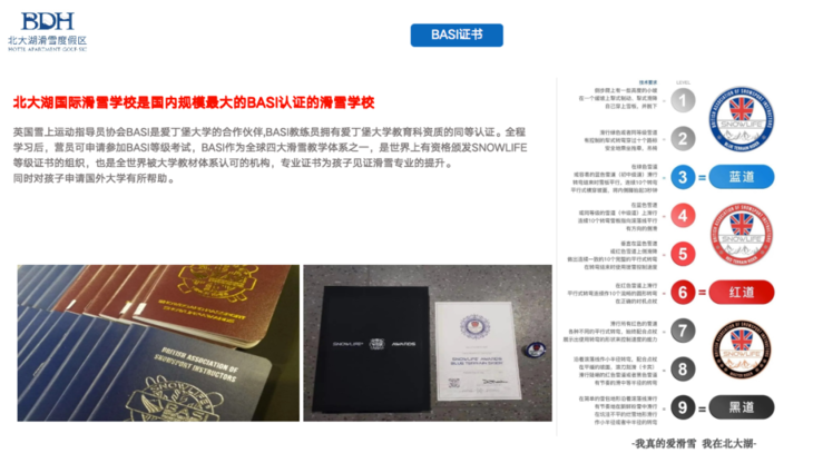 北大湖国际滑雪学校是国内规模最大的BASI认证的滑雪学校,全程学习后,营员可申请参加BASI等级考试,BASI作为全球四大滑雪教学体系之一,是世界上有资格颁发SNOWLIFE等级证书的组织,也是全世界被大学教材体系认可的机构,专业证书为孩子见证滑雪专业的提升。