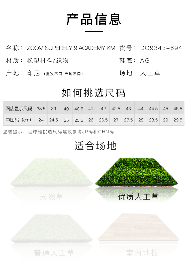 NIKE/耐克 ZOOM SUPERFLY 9 ACADEMY KM AG 中端 刺客15 高帮AG足球鞋 姆巴佩配色DO9343694