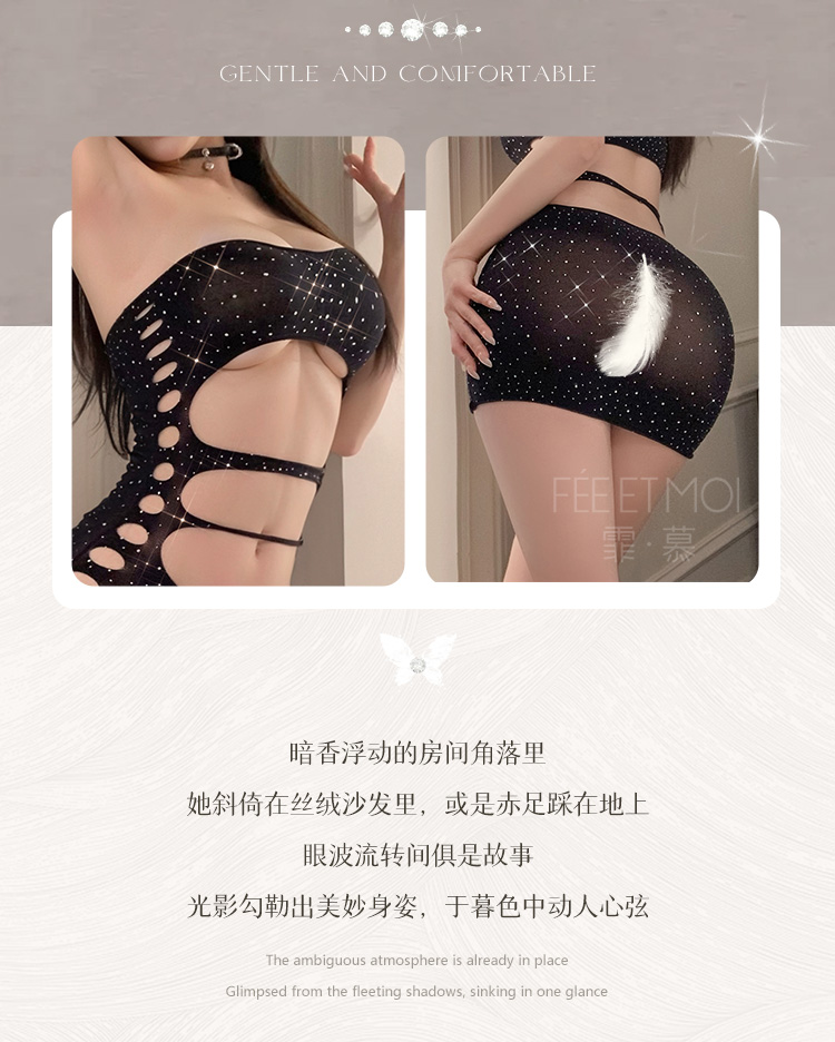 霏慕 性感烫钻抹胸网衣7512 情趣内衣黑色诱人房事