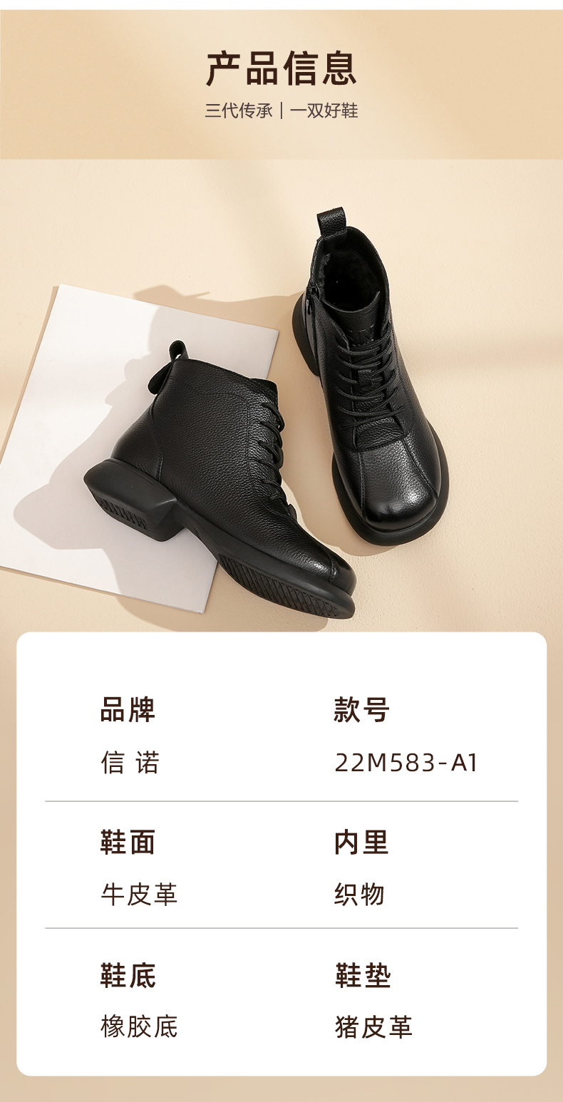 信诺真皮手工短靴女2022新款秋冬圆头粗跟马丁靴加绒妈妈软底单靴22M583-A1
