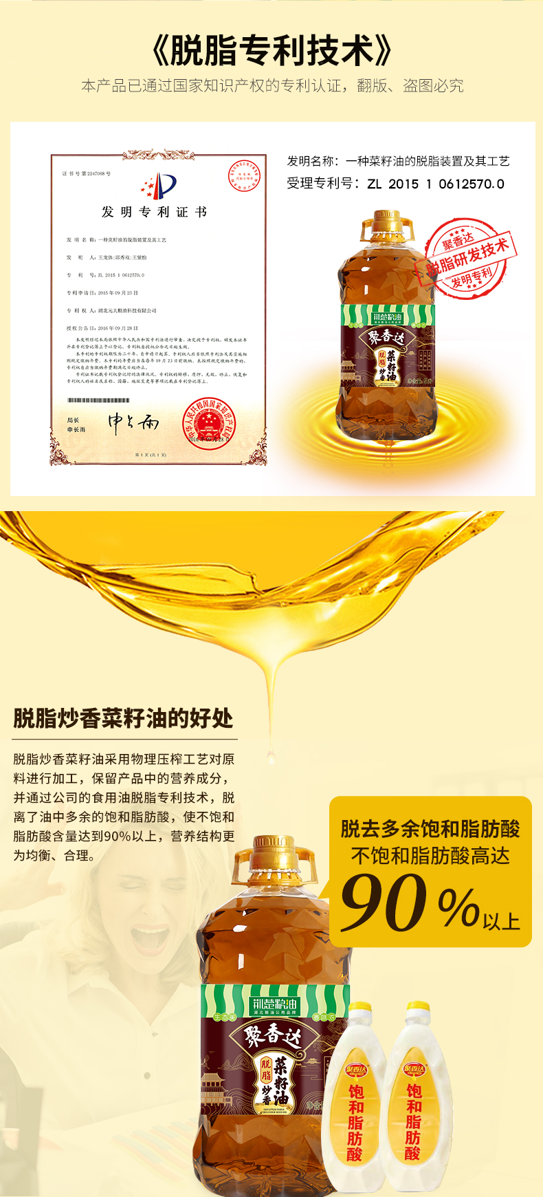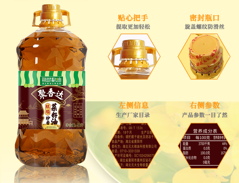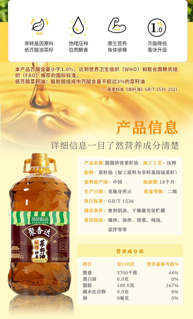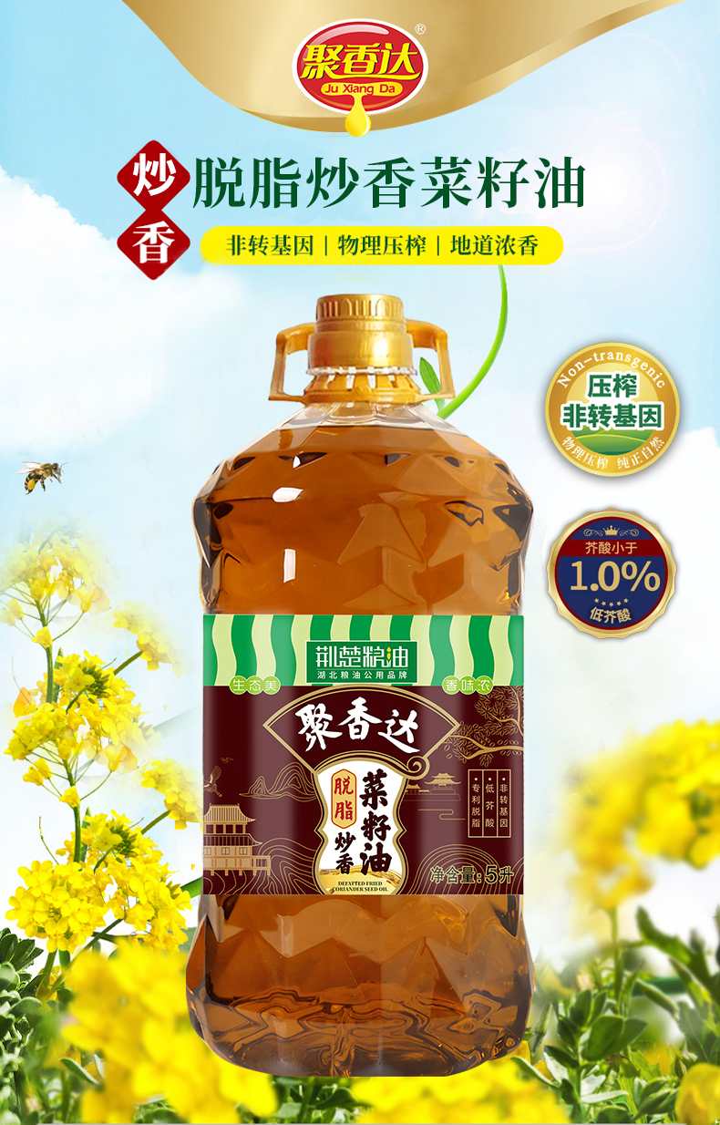 【严选】荆楚粮油 非转基因 湖北元大聚香达 食用油 物理压榨 脱脂炒香菜籽油5L/桶(厂家直发)