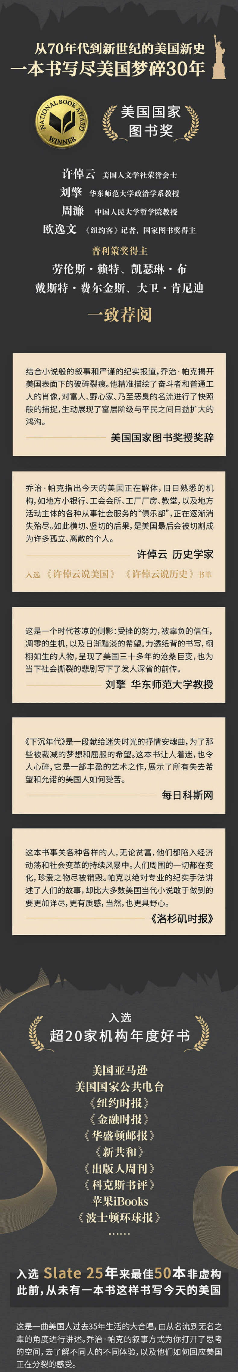 延续《光荣与梦想》的野心之作,囊括美国蕞近三十余年的历史动荡,全景还原经济、政治及文化上的流动,展现美国社会结构的解体和下沉,被誉为“从现在开始的一百年里,第壹本能让人理解这个时代的书”。