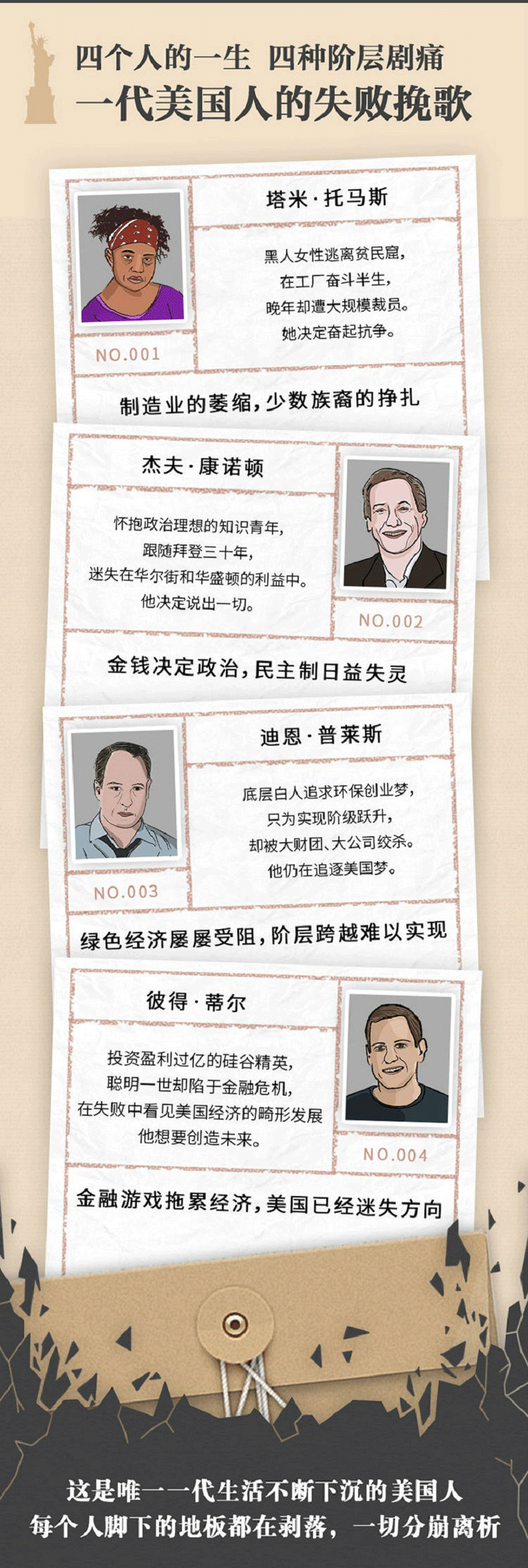 这是一个时代苍凉的侧影:受挫的努力,被辜负的信任,凋零的生机,以及日渐黯淡的希望。力透纸背的书写,栩栩如生的人物,呈现了美国三十多年的沧桑巨变,也为当下社会撕裂的悲剧写下了发人深省的前传。——刘擎,华东师范大学教授