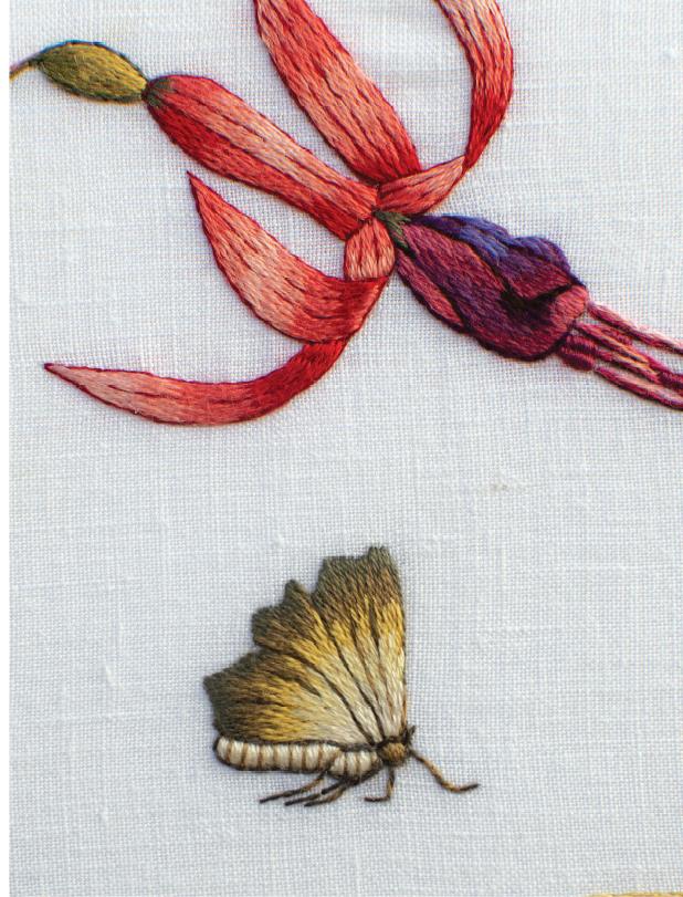 崔西•布尔是一名自学成才的刺绣名师,经过多年的研究和实践,她已经形成颇具个人风格的平面刺绣技法,出版过多本畅销刺绣书籍。她出生和成长在津巴布韦,直到2004年和丈夫与三个孩子一起搬到了南非的西开普省生活。目前她在南非的行业协会和工作室致力于刺绣工艺的教学和研讨,并在国际性的针线手工杂志和其他出版物上持续发表新作。她的刺绣表现主题一开始主要是花卉,近来扩展到鸟类和肖像。细节精微,通过渐变效果强调光与影的变化,使她的作品呈现出惟妙惟肖的鲜活感,得到了刺绣界的充分认可和赞誉。
