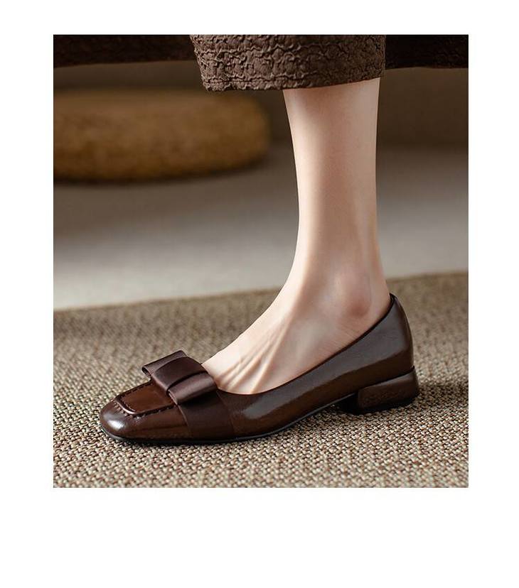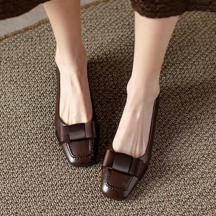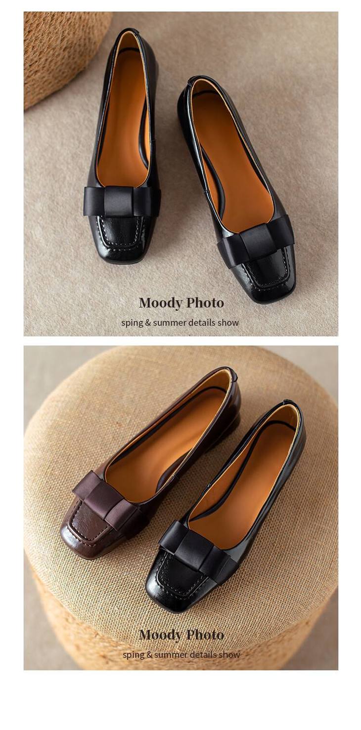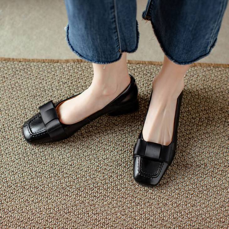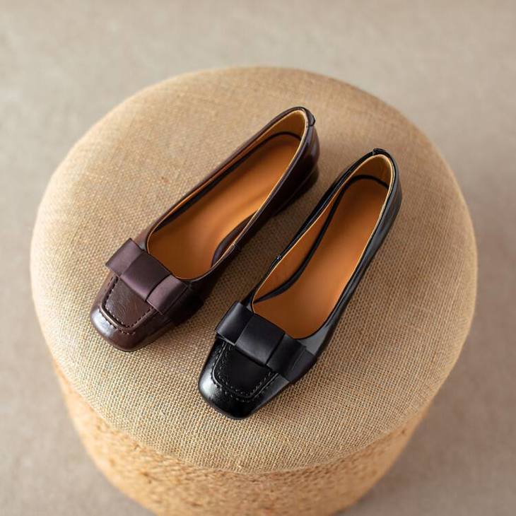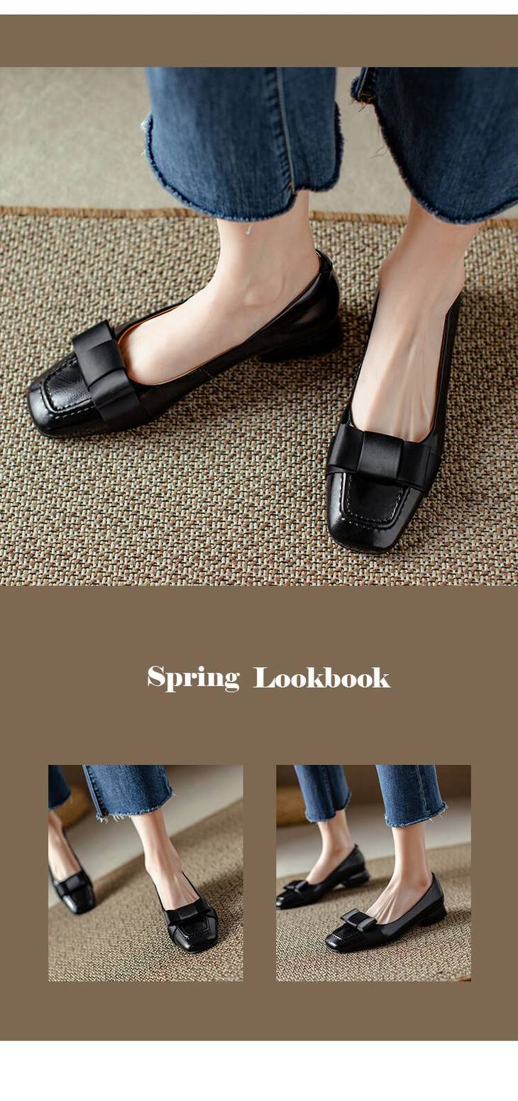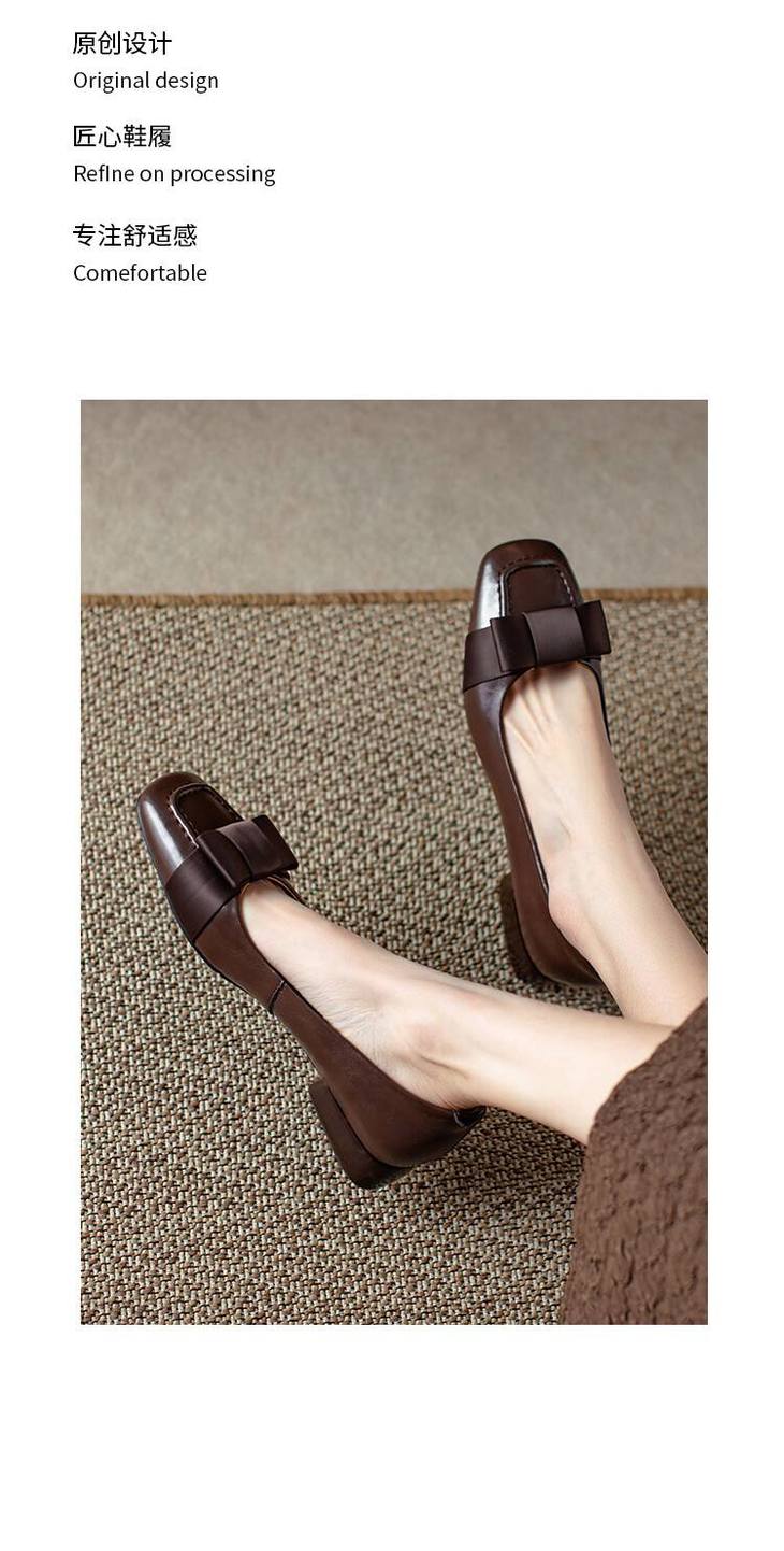 【预售5天】真皮浅口单鞋低跟圆头,蝴蝶结复古平底休闲工作鞋XMN&3272