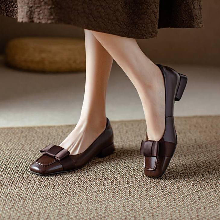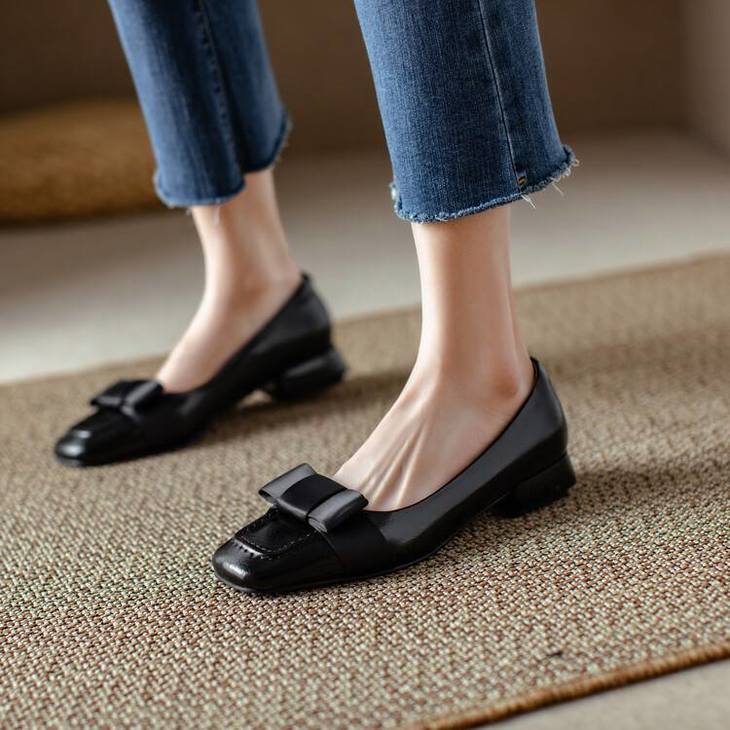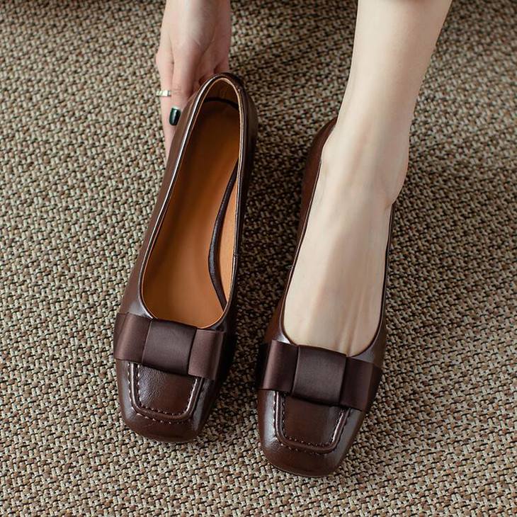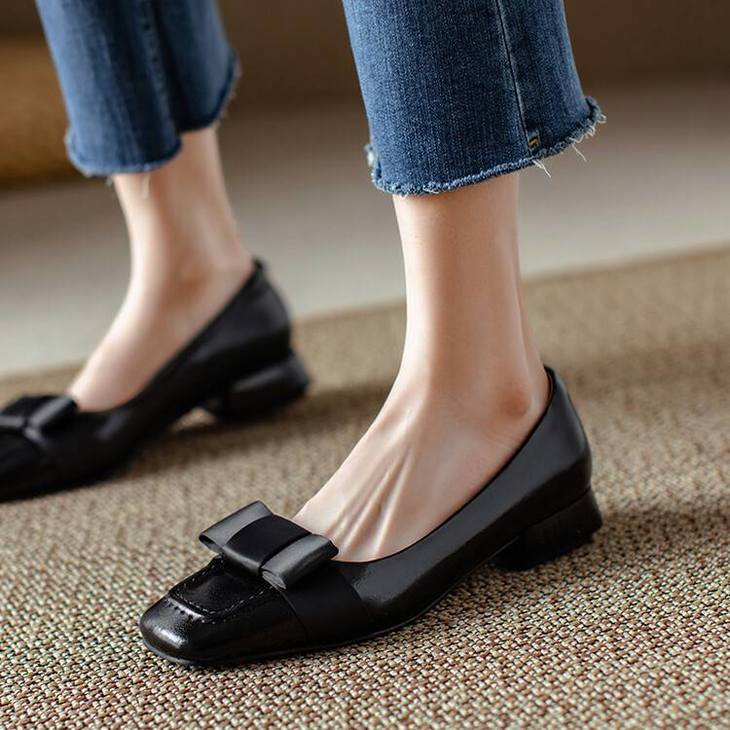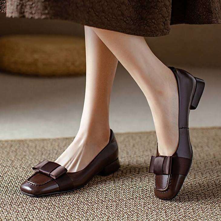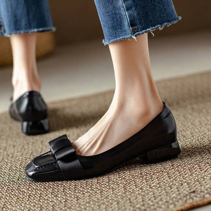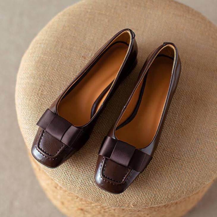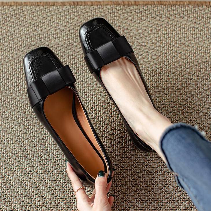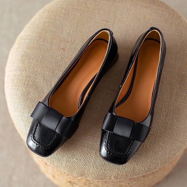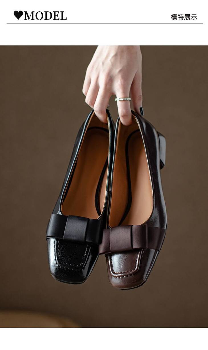 【预售5天】真皮浅口单鞋低跟圆头,蝴蝶结复古平底休闲工作鞋XMN&3272