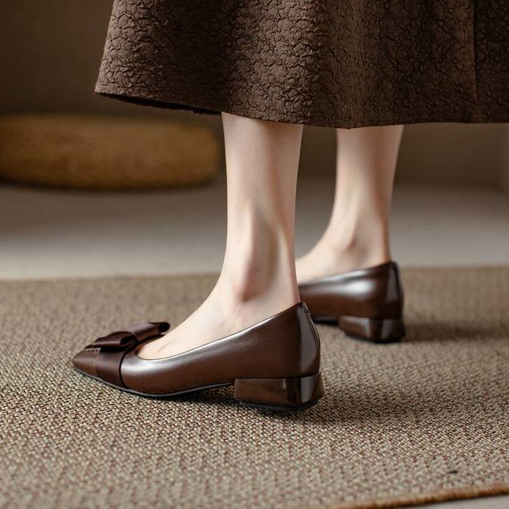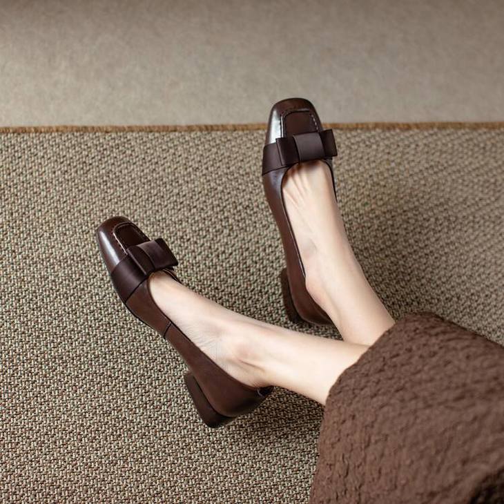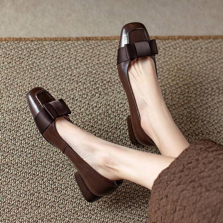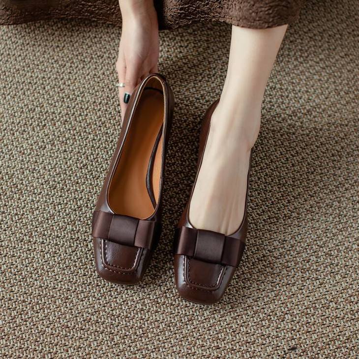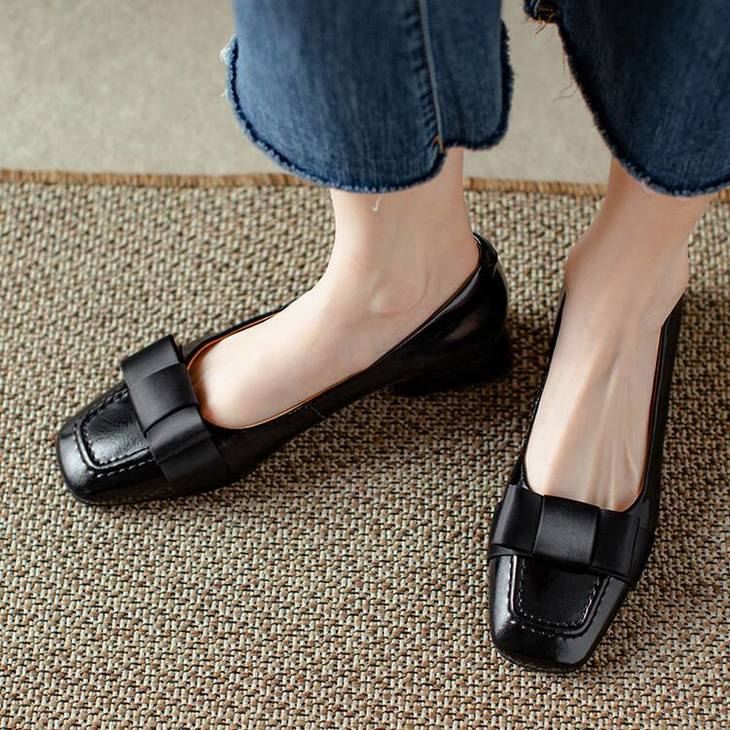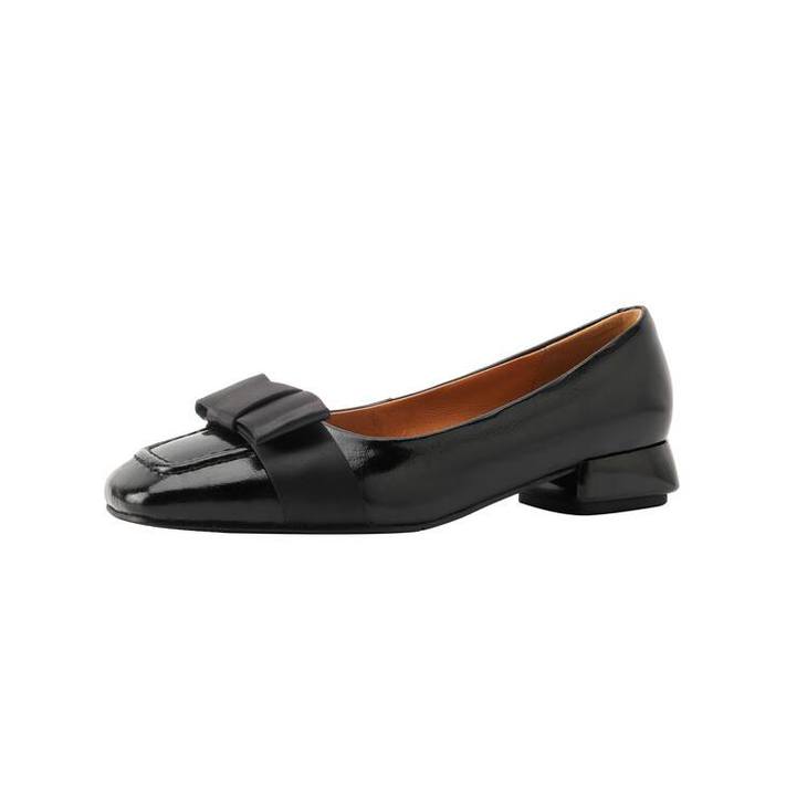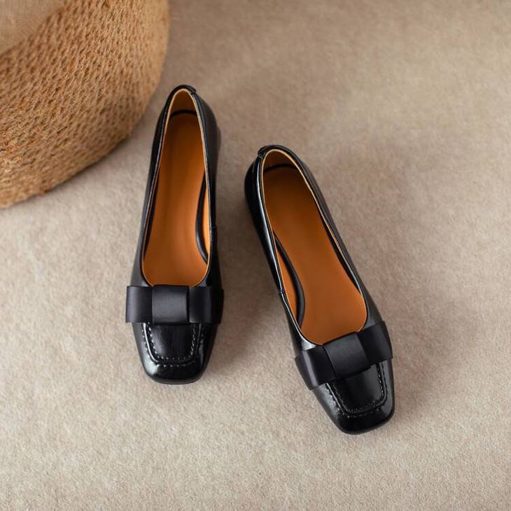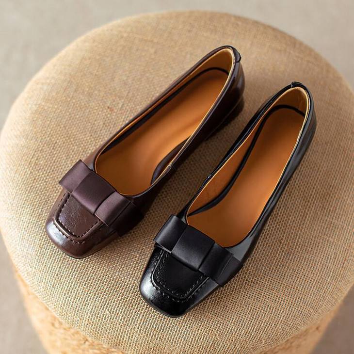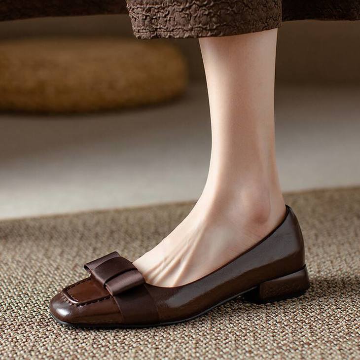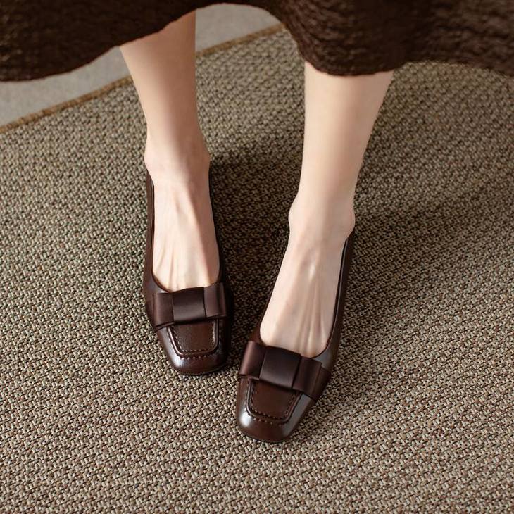 【预售5天】真皮浅口单鞋低跟圆头,蝴蝶结复古平底休闲工作鞋XMN&3272