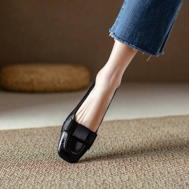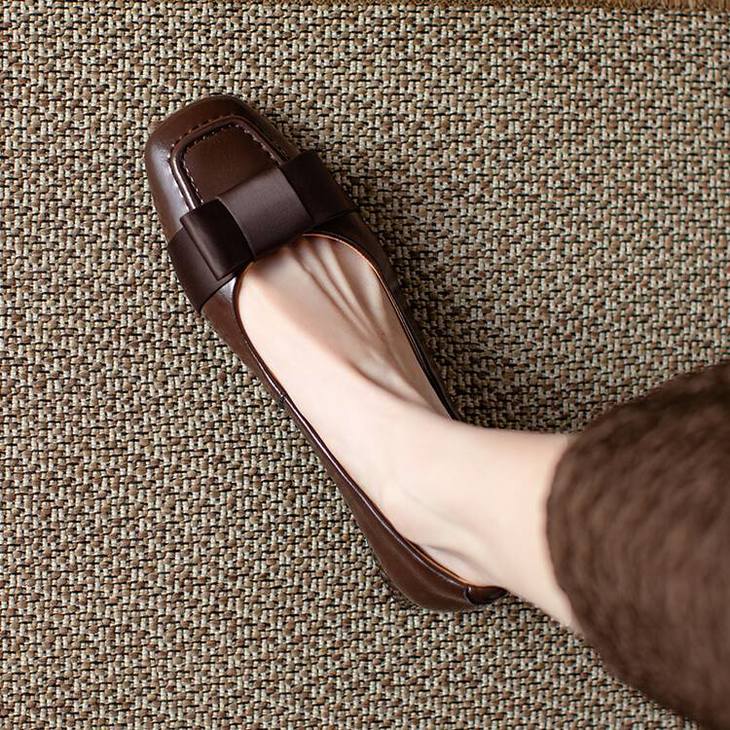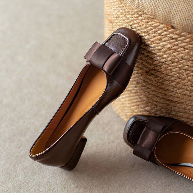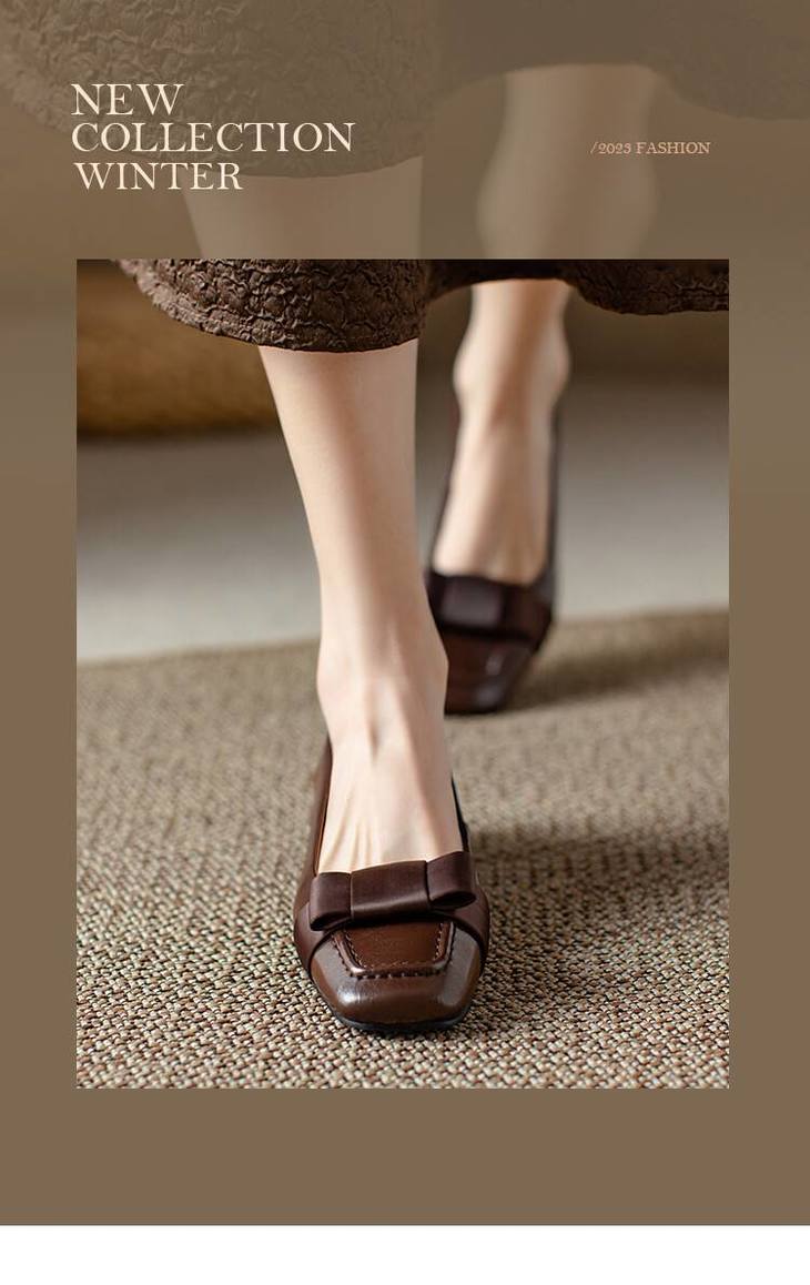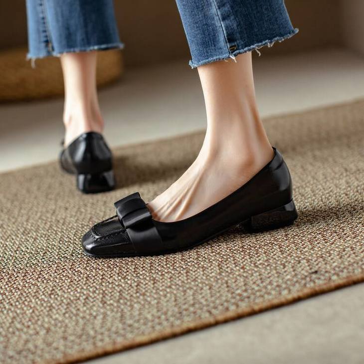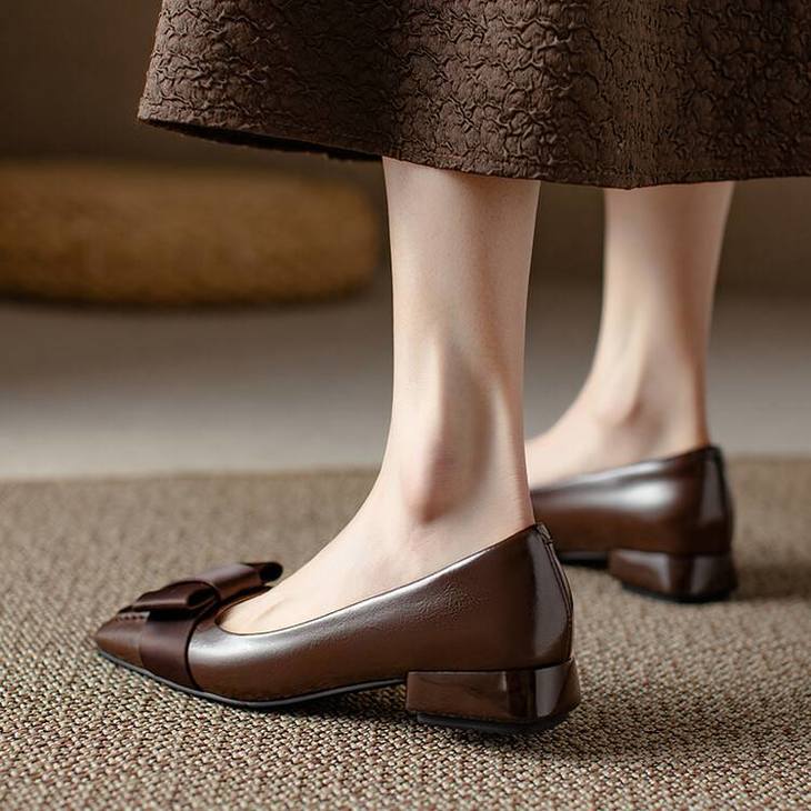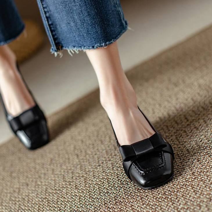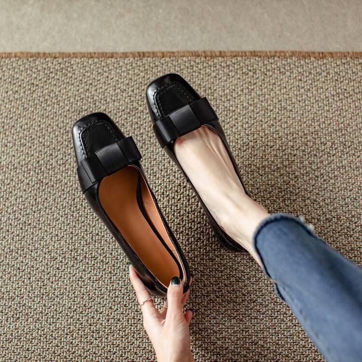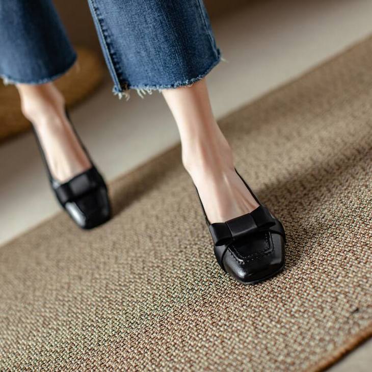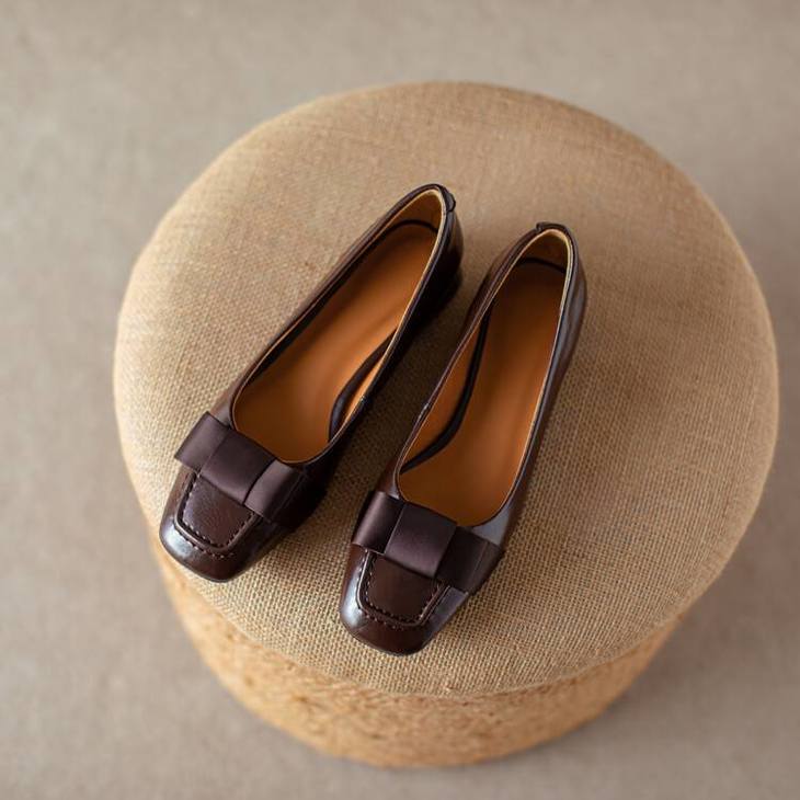 【预售5天】真皮浅口单鞋低跟圆头,蝴蝶结复古平底休闲工作鞋XMN&3272