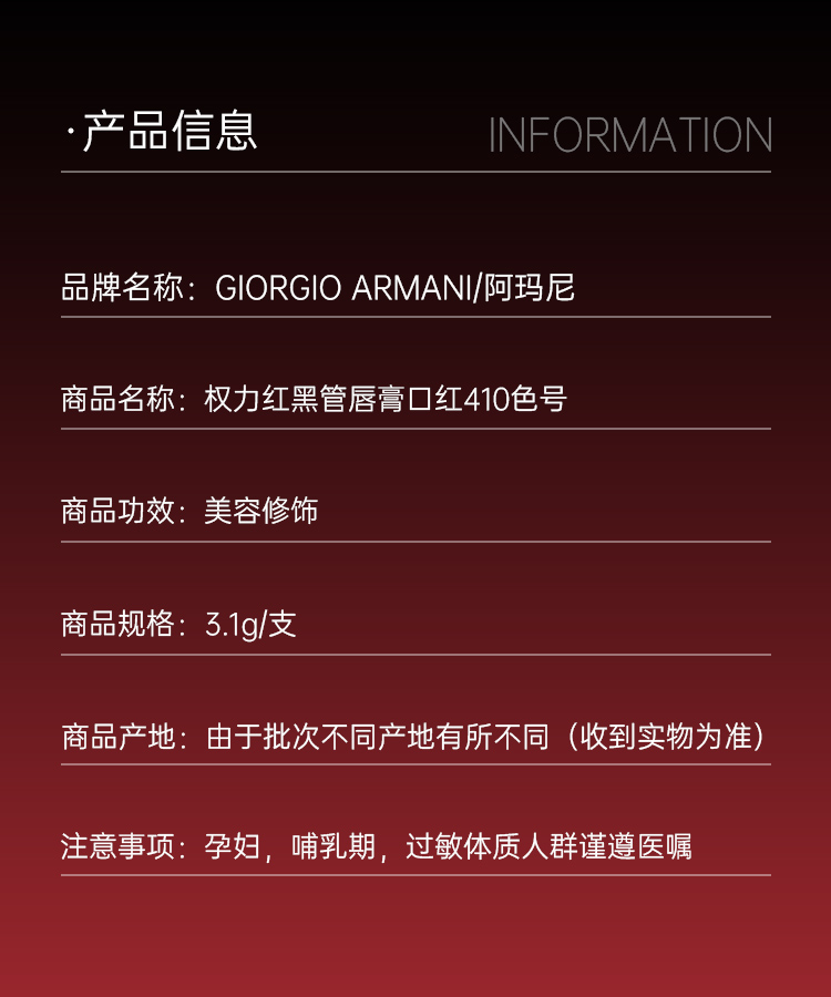 【跨境】GIORGIOARMANI阿玛尼黑管口红410色号3.1g/支 (效期至2026年8月)