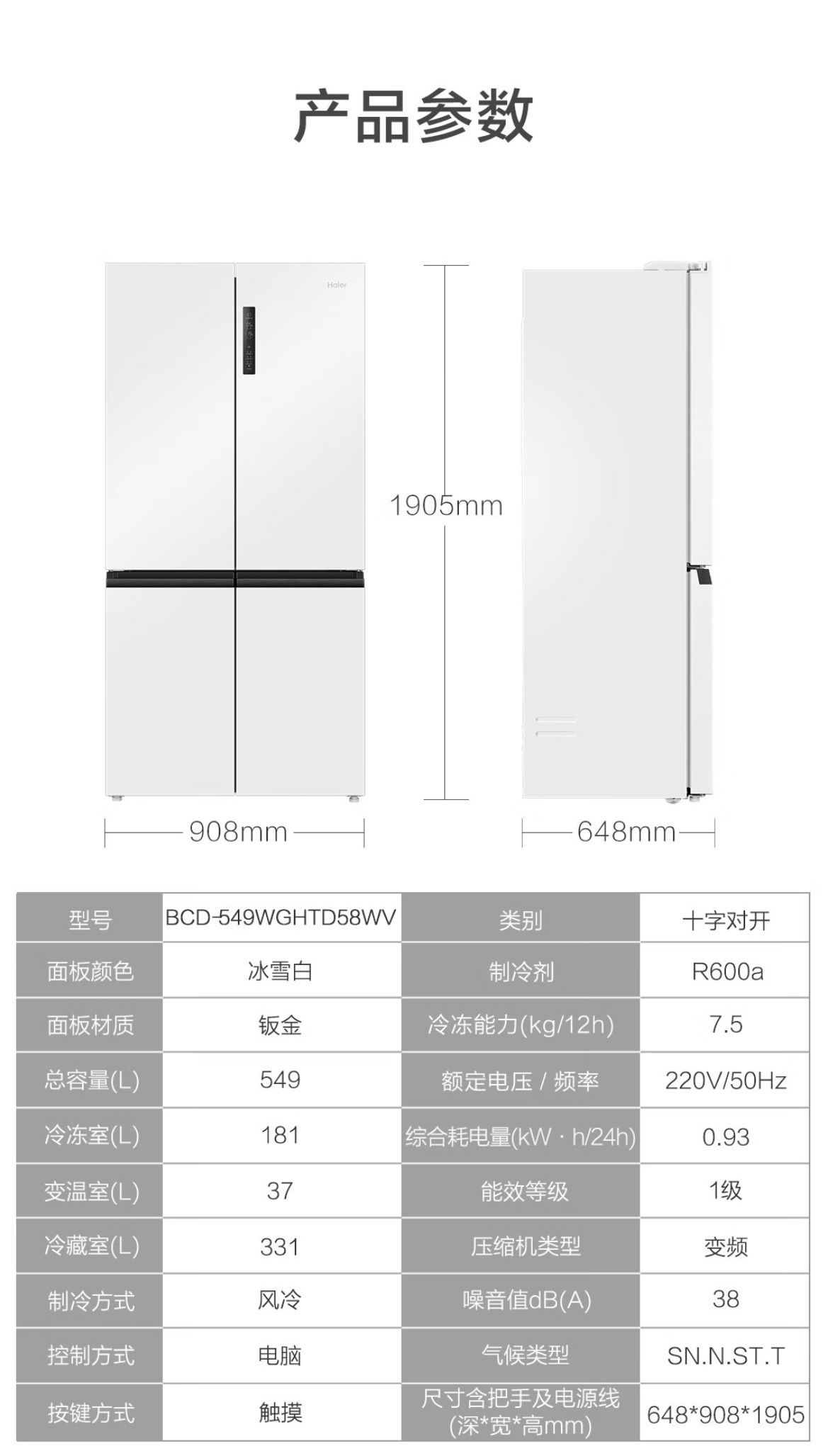 海尔(Haier)冰箱 BCD-549WGHTD58WV